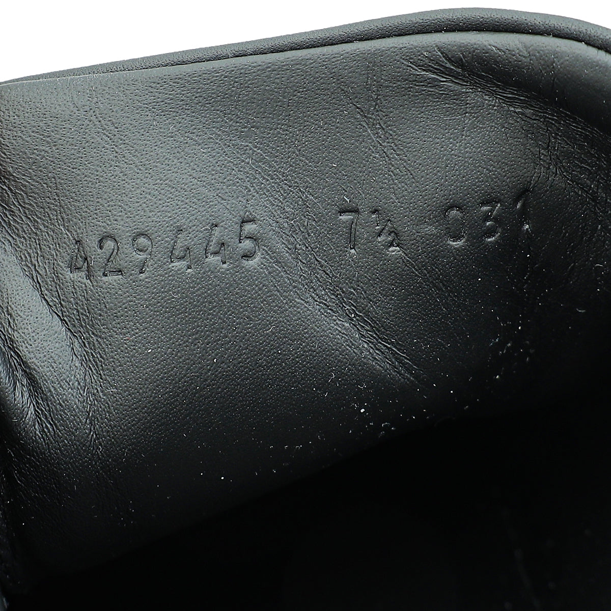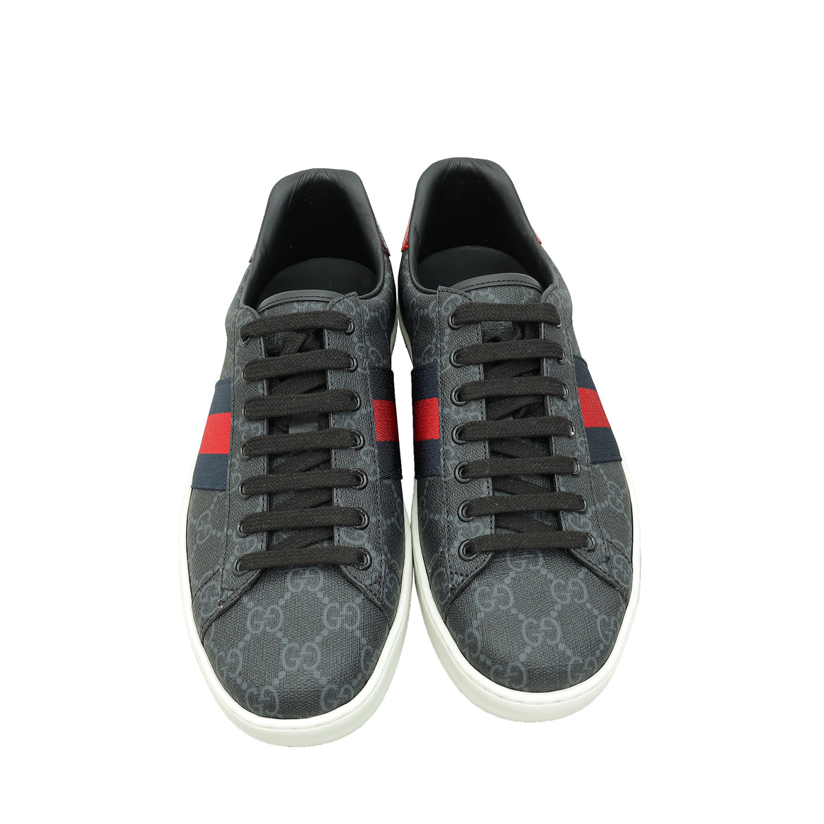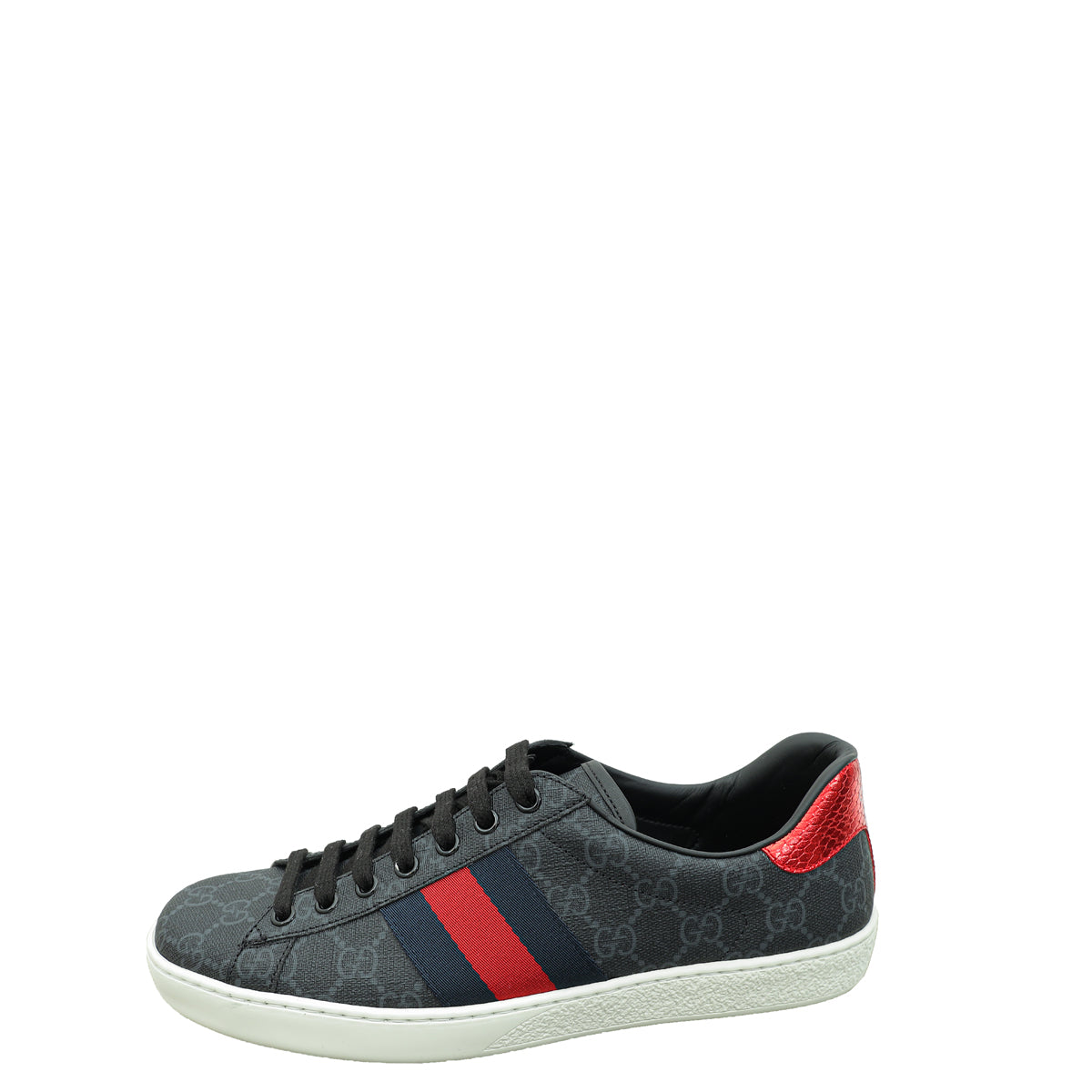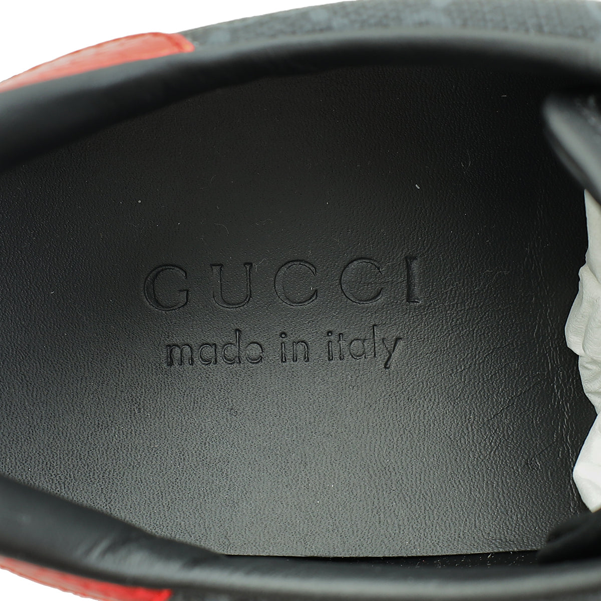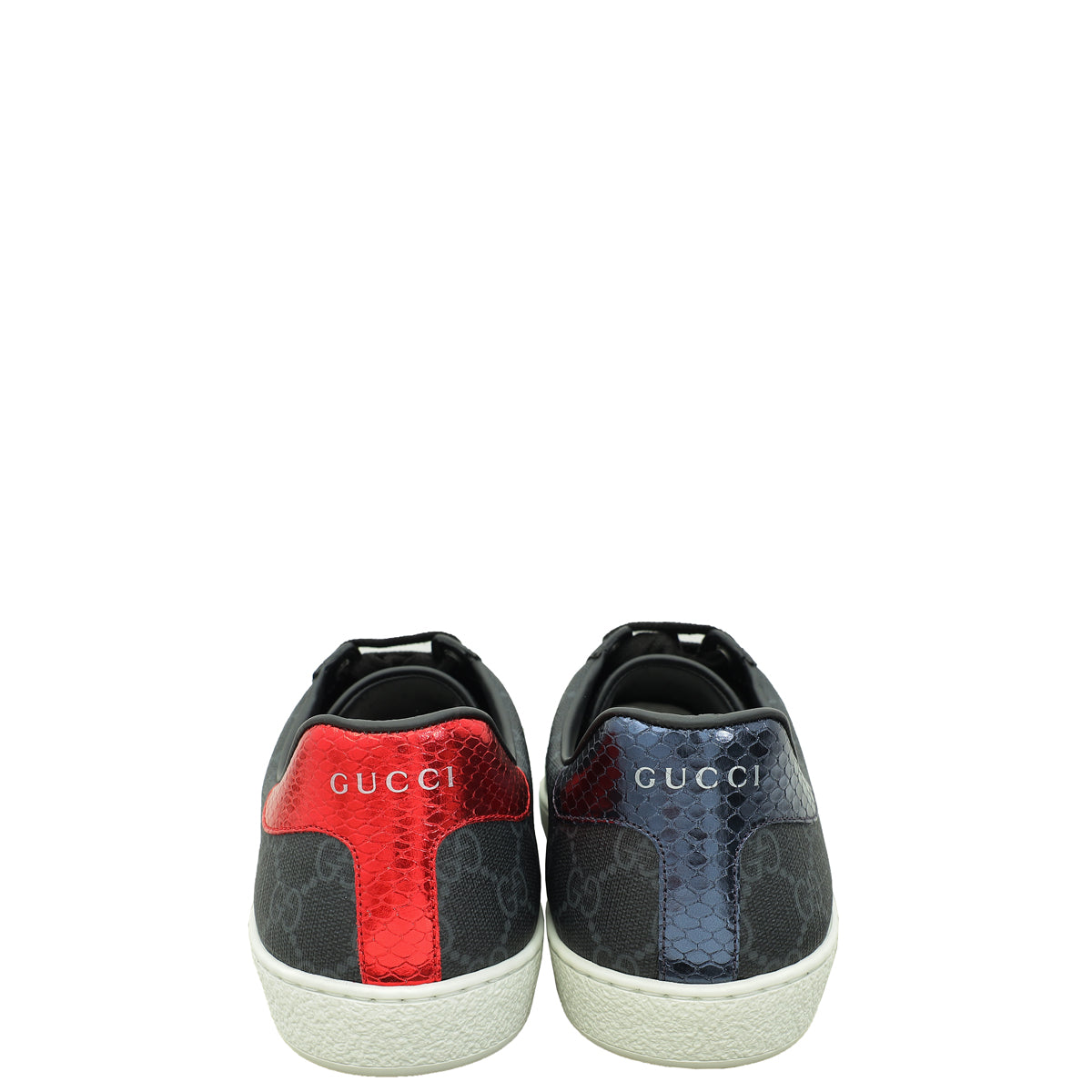 Material: Black/Grey GG Supreme Canvas with Navy/Red Web and Red Snakeskin Leather Detail on The Heel of One Shoe and Blue on The Other