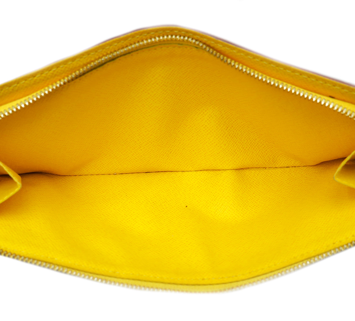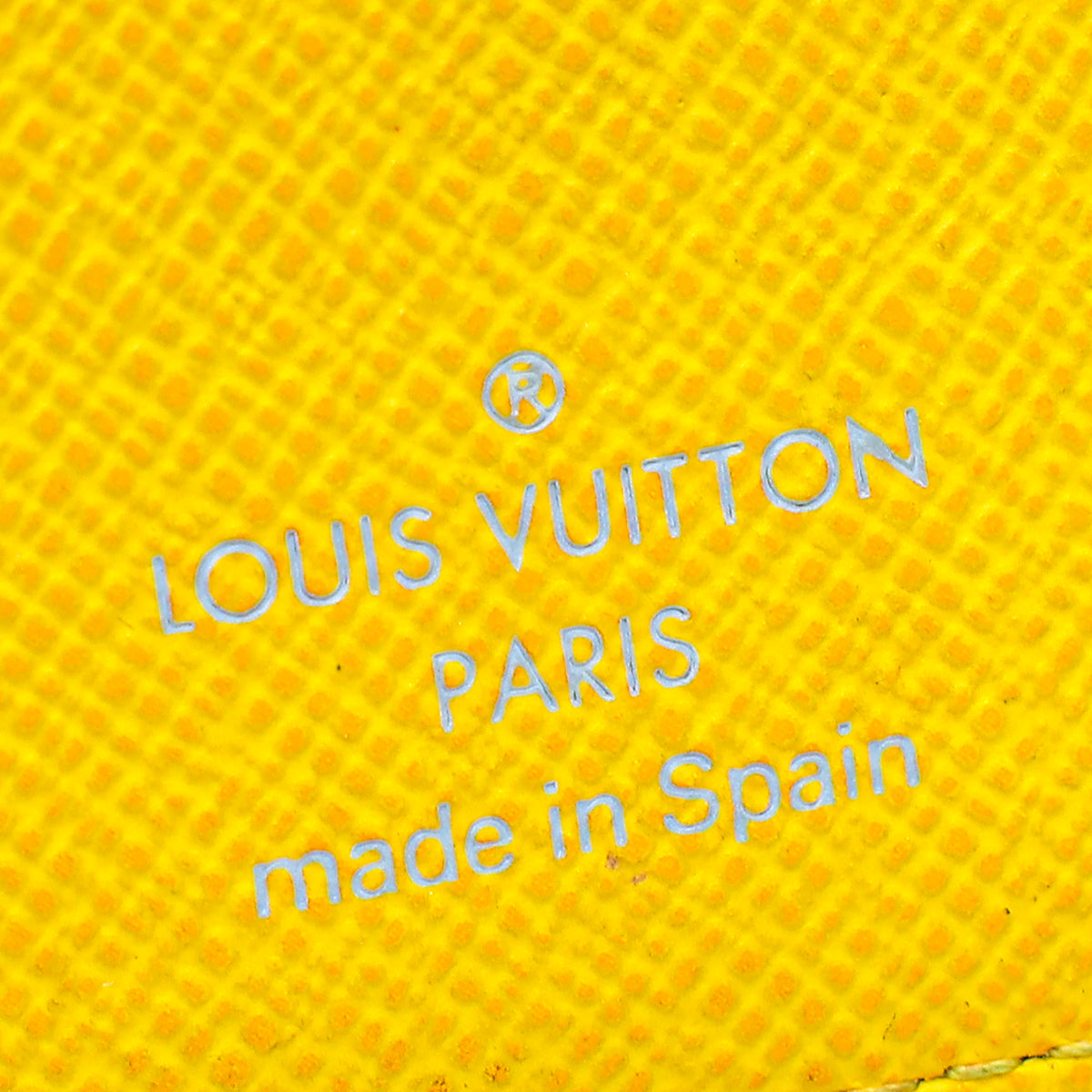 - الخامة : قماش أبيض متعدد الألوان مطلي بشعار المونوجرام والجلد الداخلي باللون الأصفر