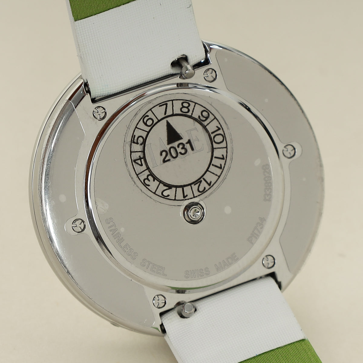 - Material: Stainless Steel Case with 68 Brilliant Cut Diamonds (Approx.0.61 Carats), Silver Dial with 11 Brilliant Cut Diamonds (Approx.0.09 Carats) with White Strap and Blue Alligator Interchangeable Strap