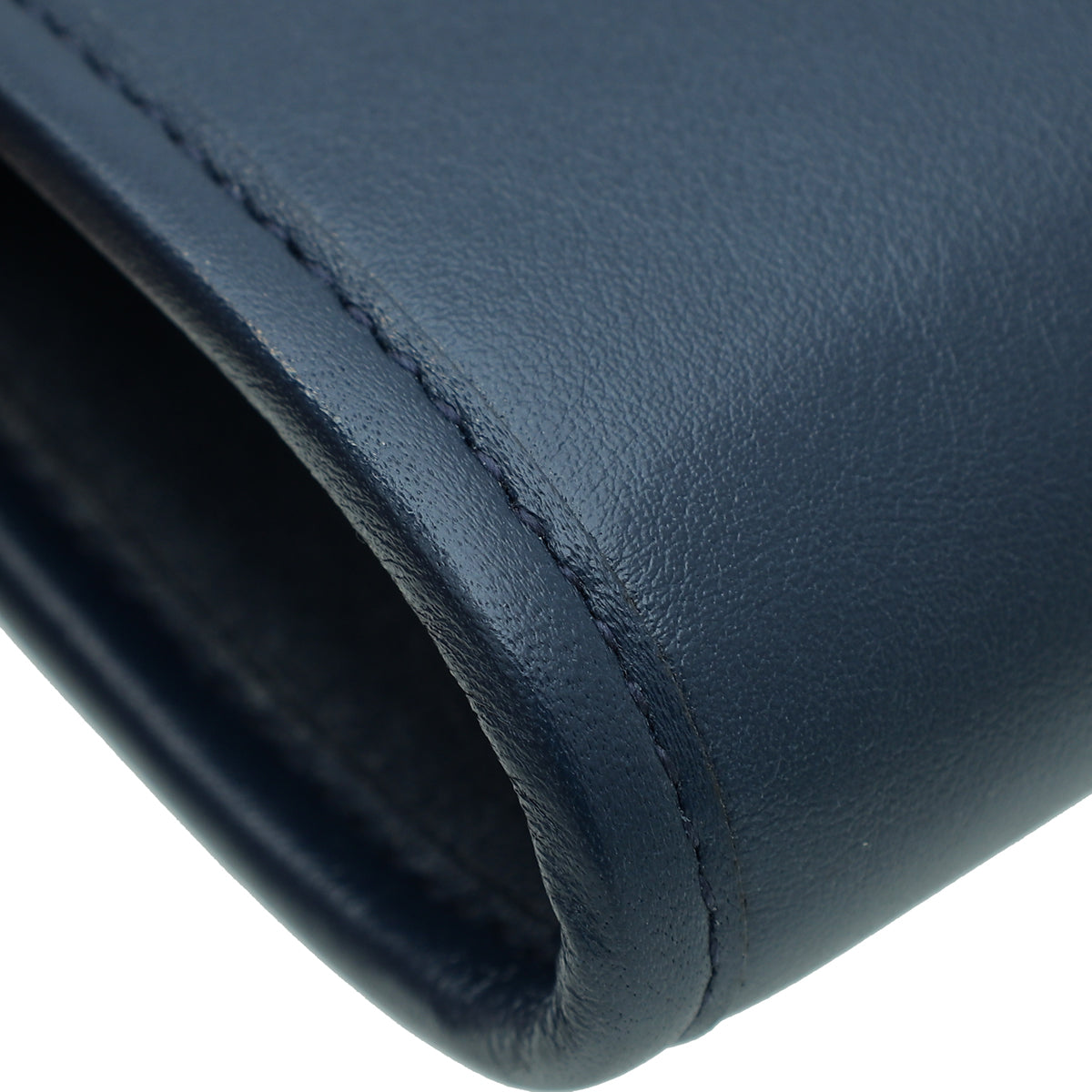 المواد: جلد عجل باللون الأزرق الداكن ومينا على شكل رأس النمر مع كريستالات وشبكة ويب باللون الأزرق الداكن/الأحمر