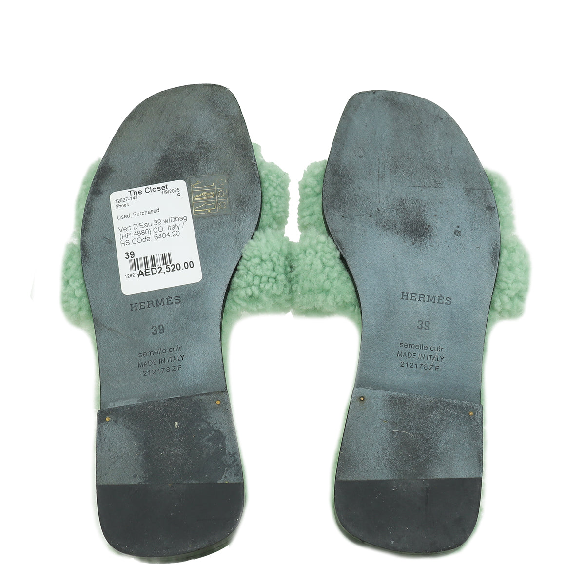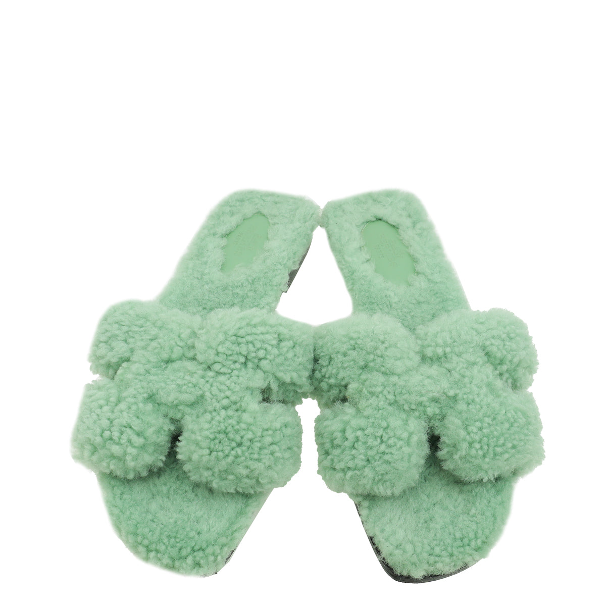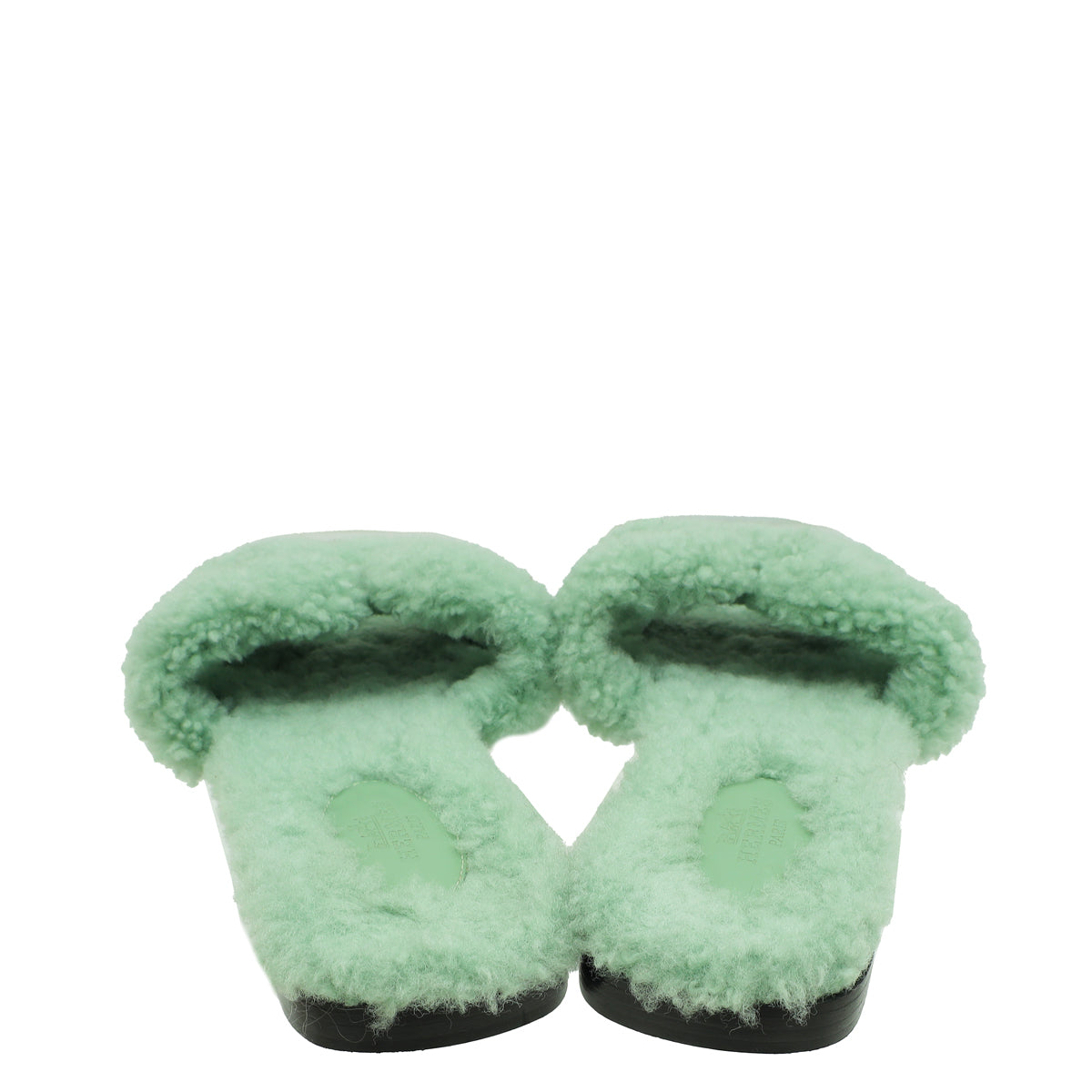 Hermes Vert D'Eau Shearling Oran Sandals 39