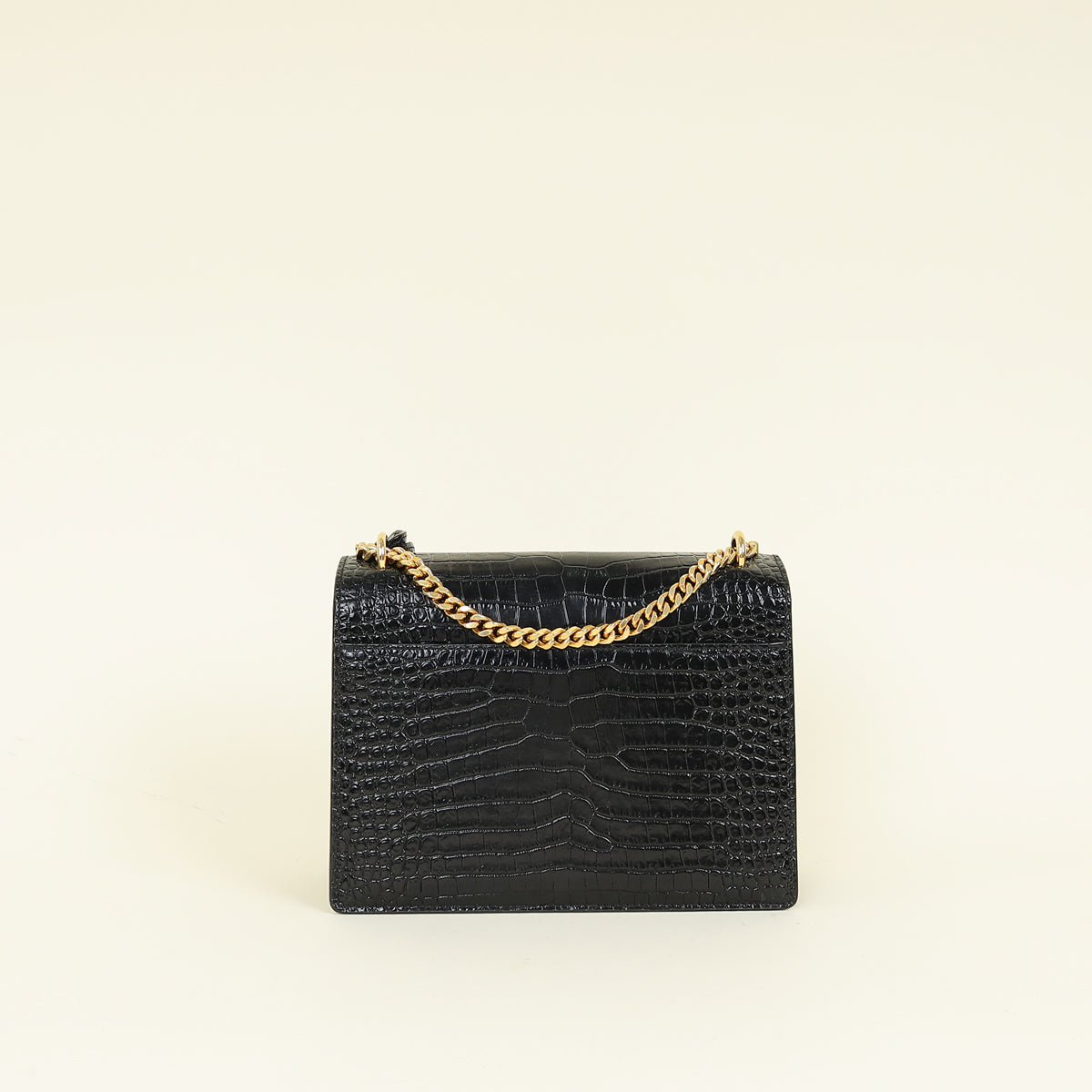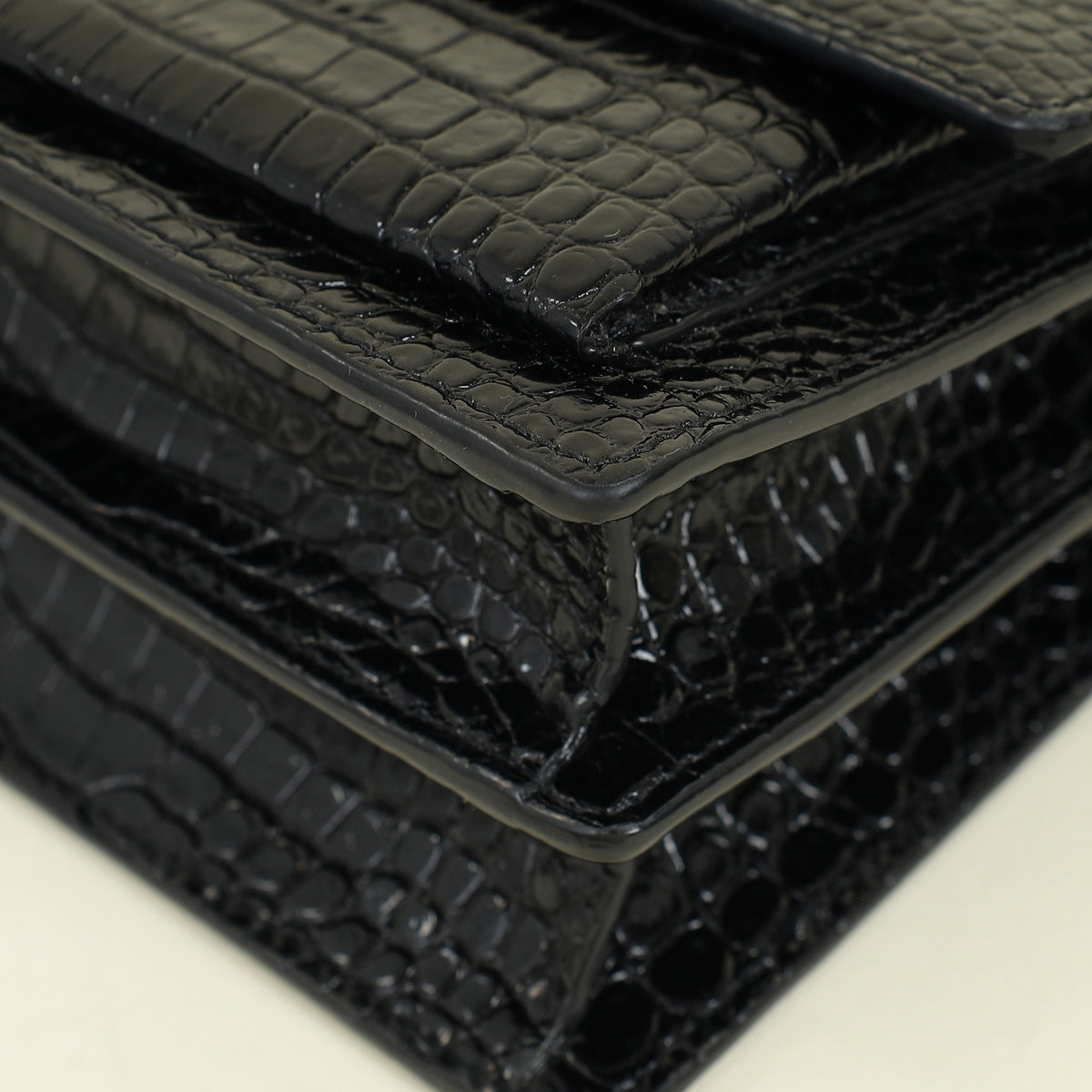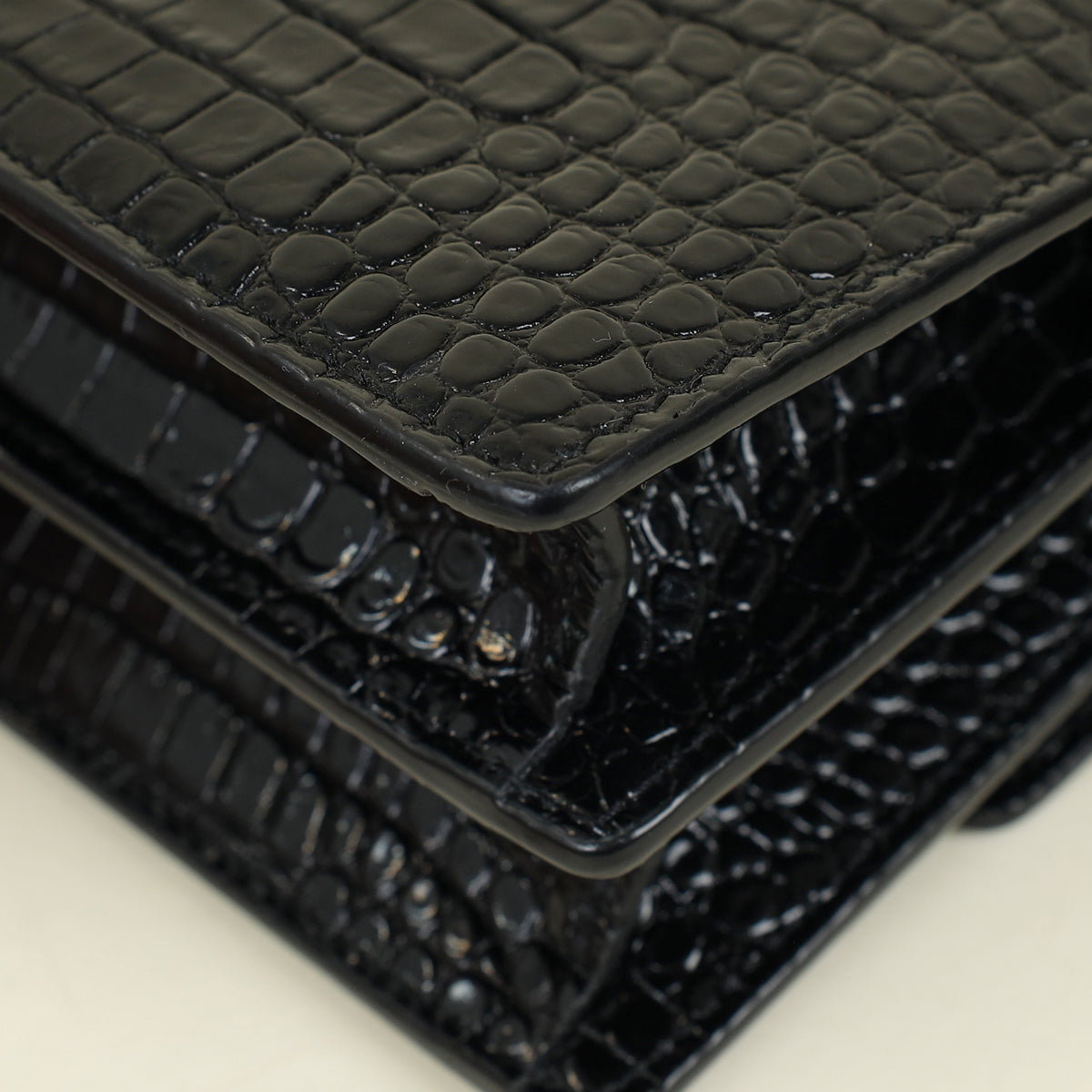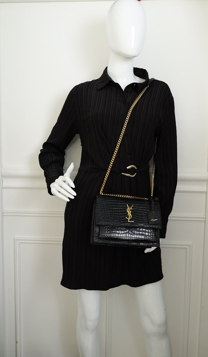 YSL Black Sunset Medium Croco Embossed Shoulder Bag