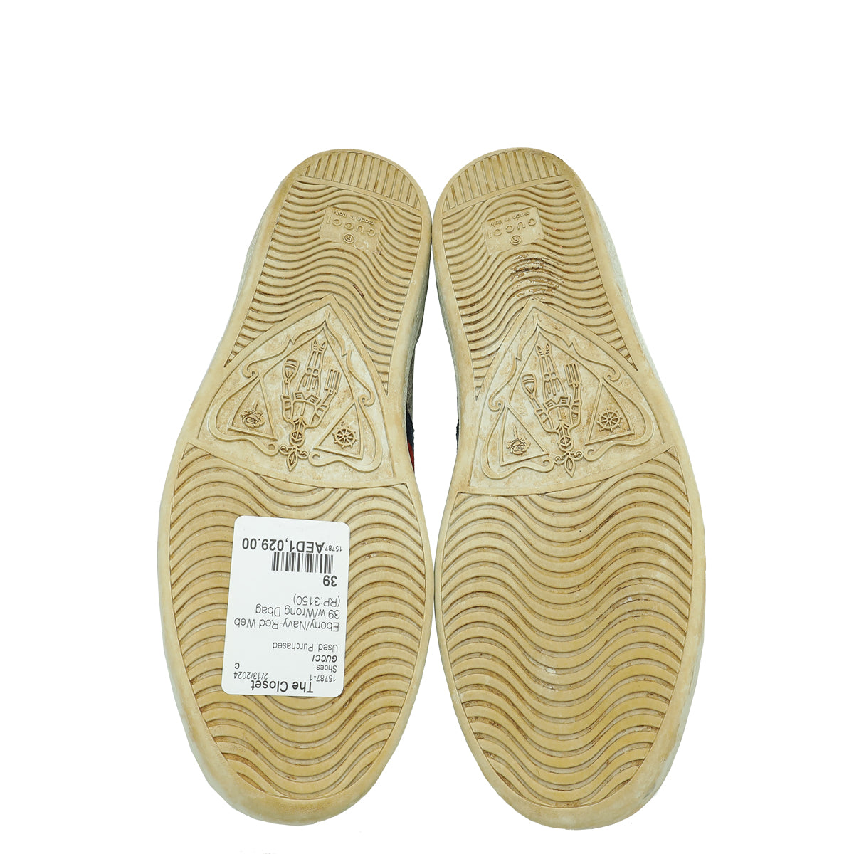 المادة : قماش سوبريم بنقش GG من خشب الأبنوس مع شبكة ويب باللون الكحلي/الأحمر وتفاصيل من جلد الثعبان الأحمر على كعب أحد الحذاء واللون الأزرق الداكن على الحذاء الآخر