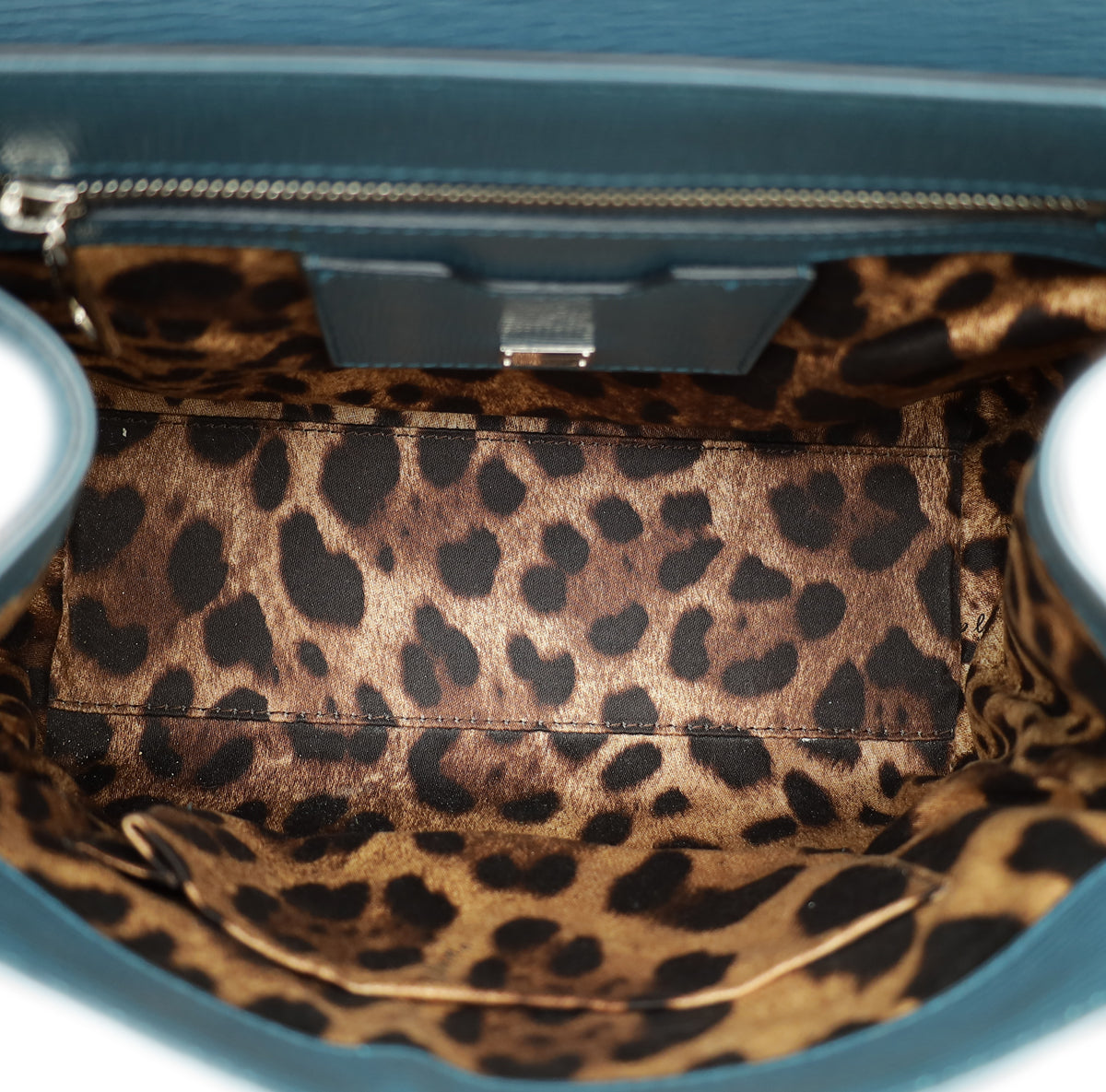 المواد : جلد الإغوانا المطبوع باللون الأزرق والرمادي وطباعة الفهد الداخلية