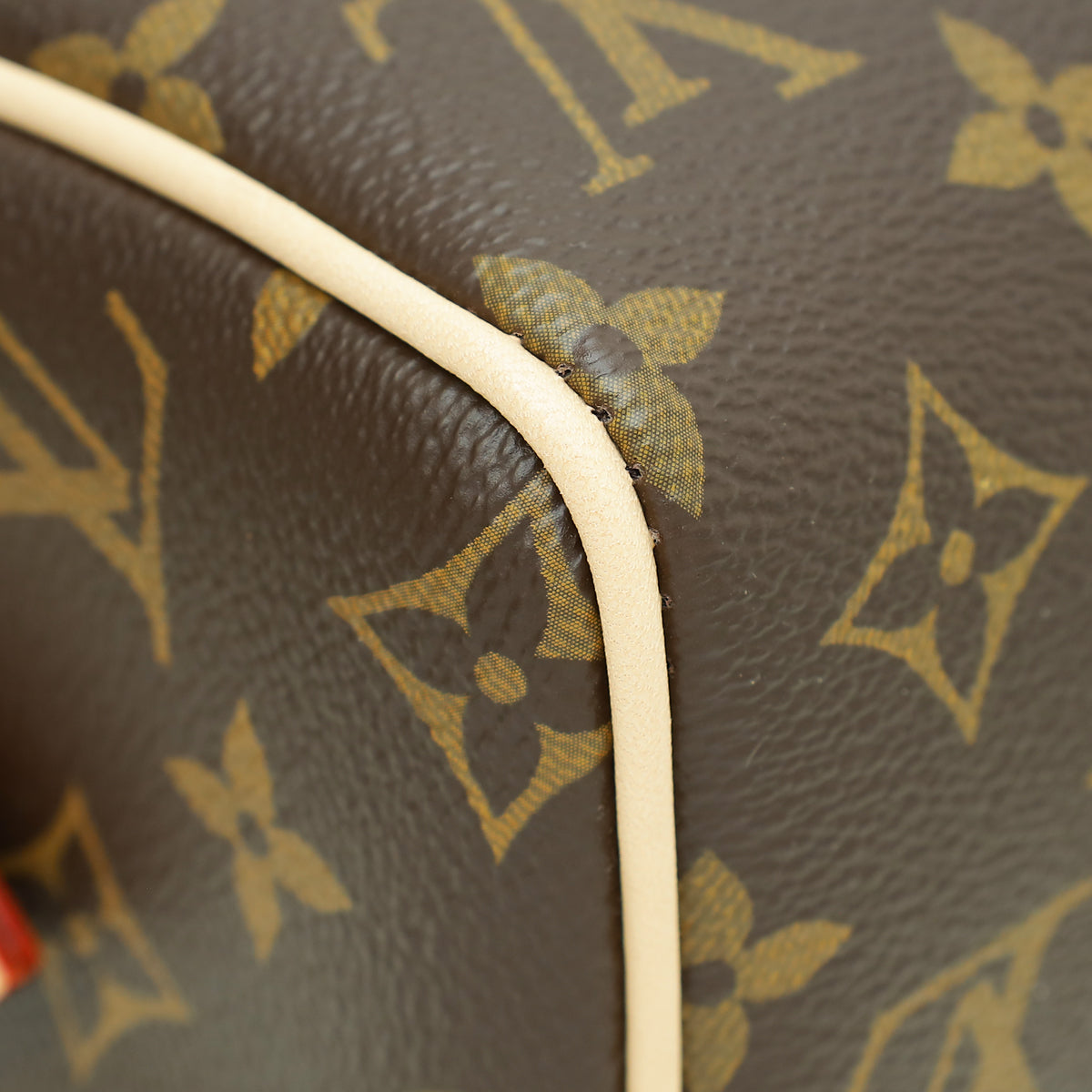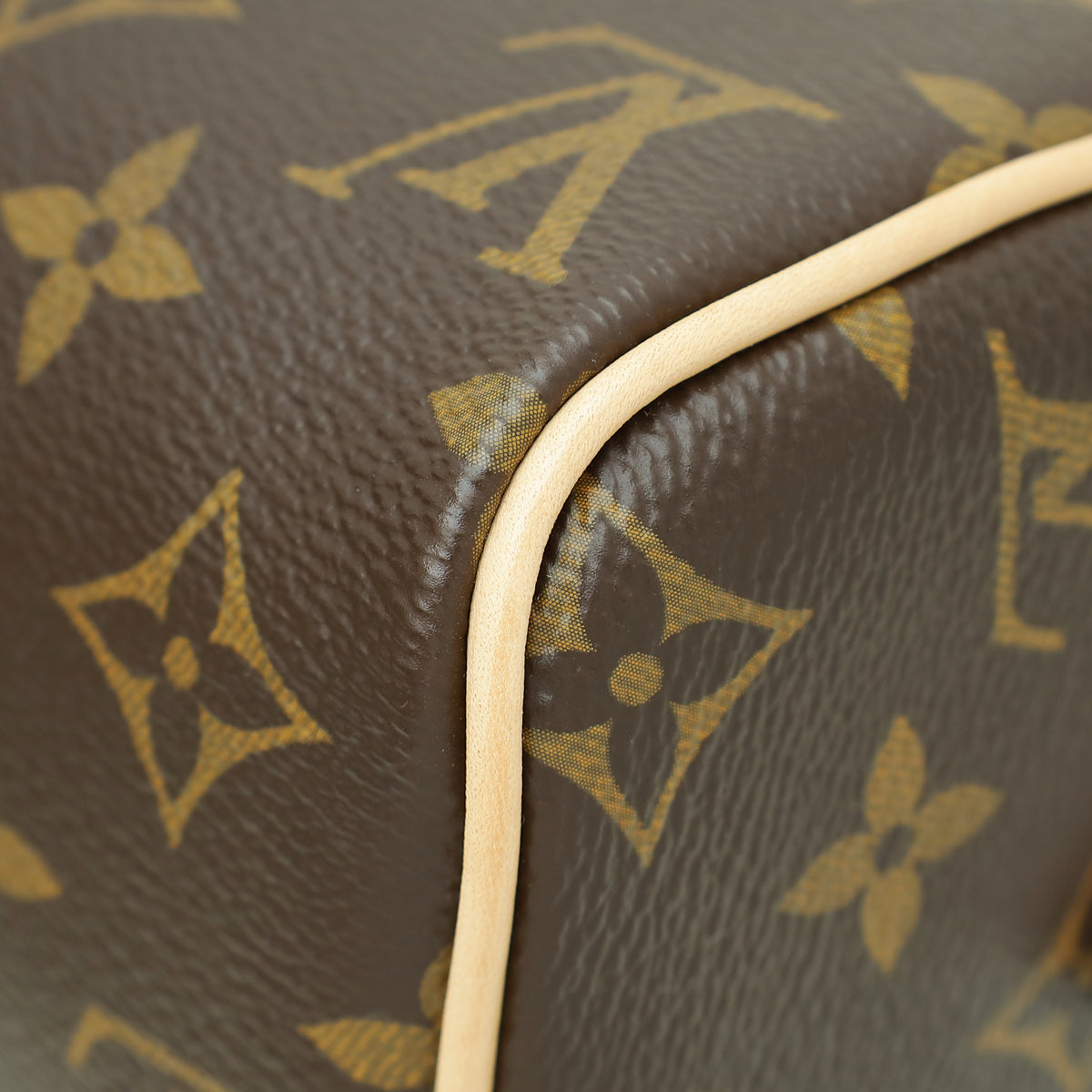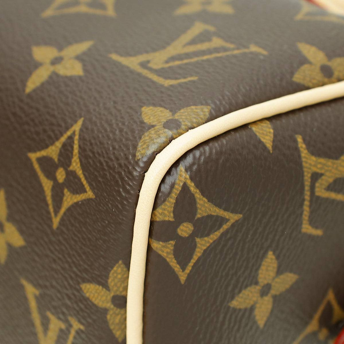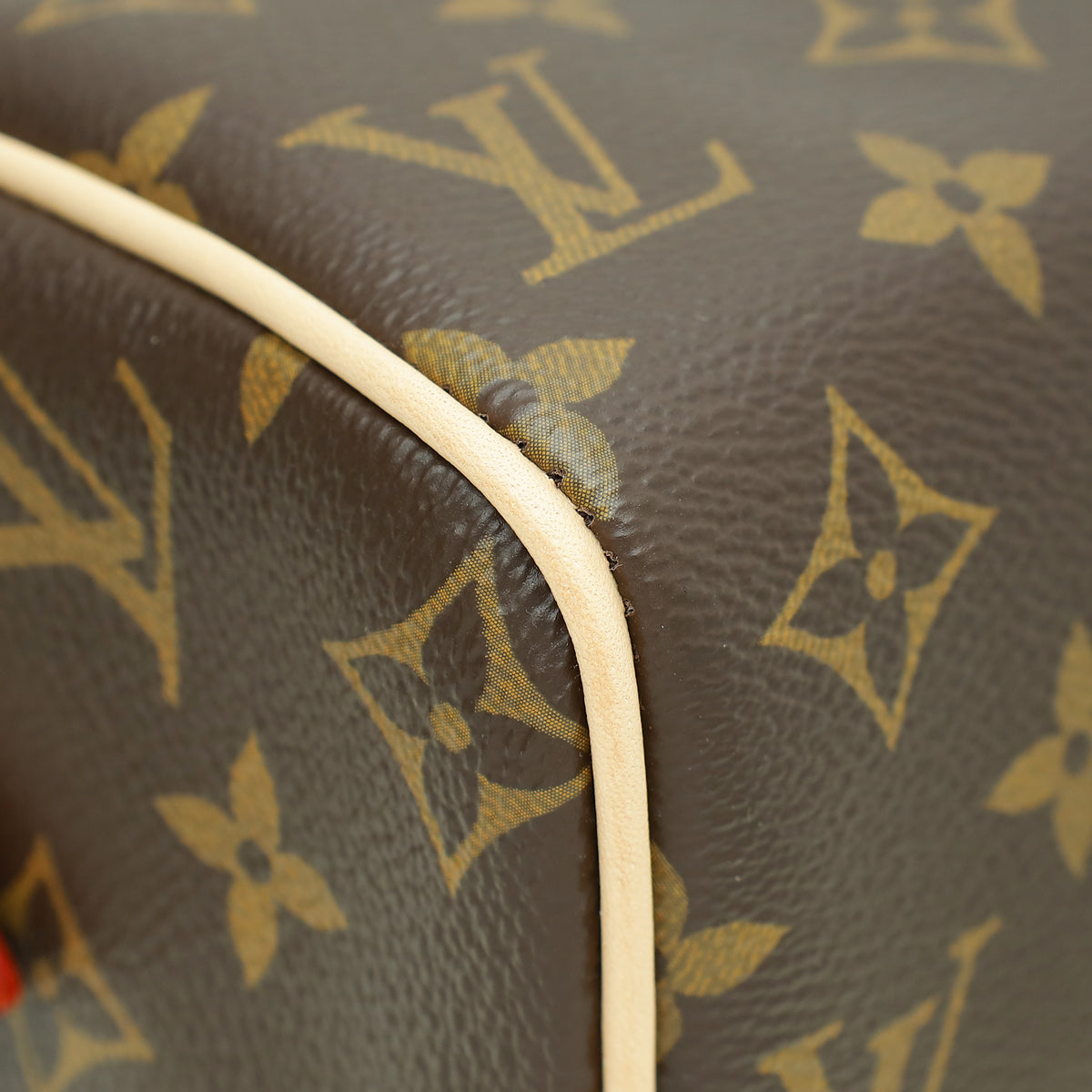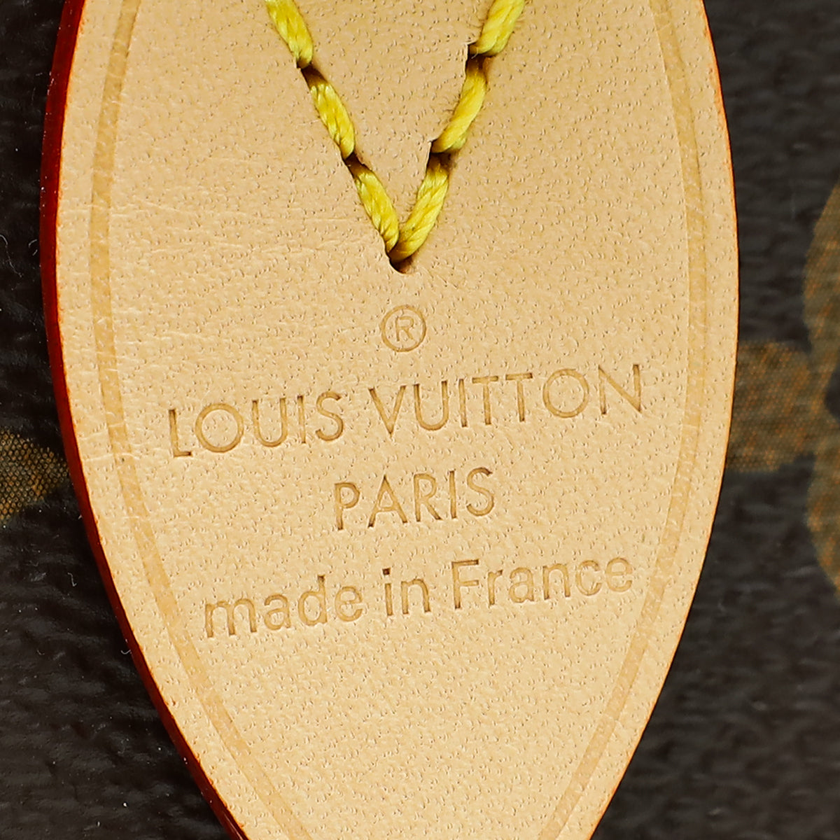 الخامة : قماش مطلي بنقش Monogram مع حزام باللون البيج وزخرفة من جلد البقر الطبيعي