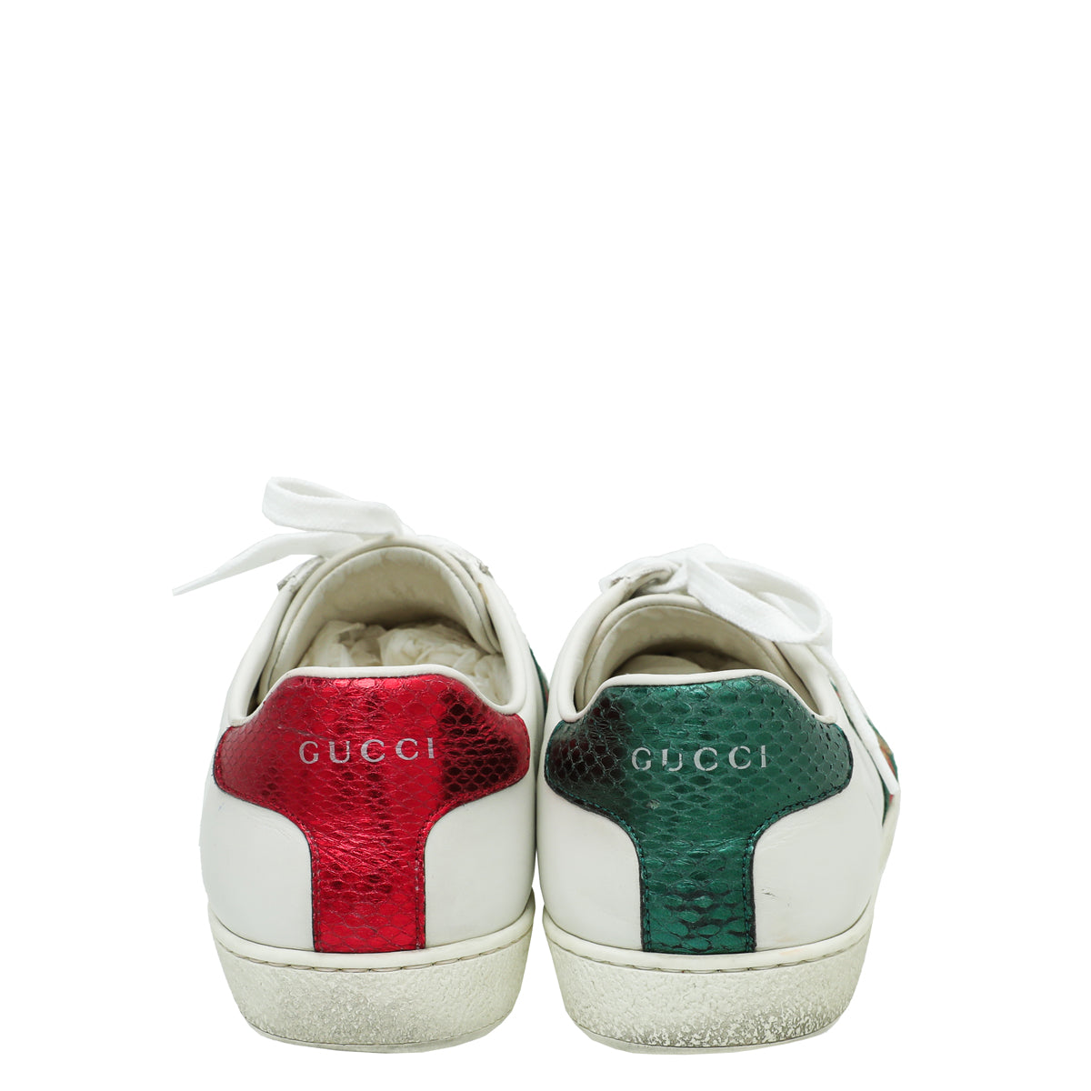 مادة : جلد أبيض مع شبكة أخضر/حمراء ونحلة مطرزة بالذهب مع تفاصيل جلد ثعبان أحمر على ظهر أحد الأحذية والأخضر على الجانب الآخر.