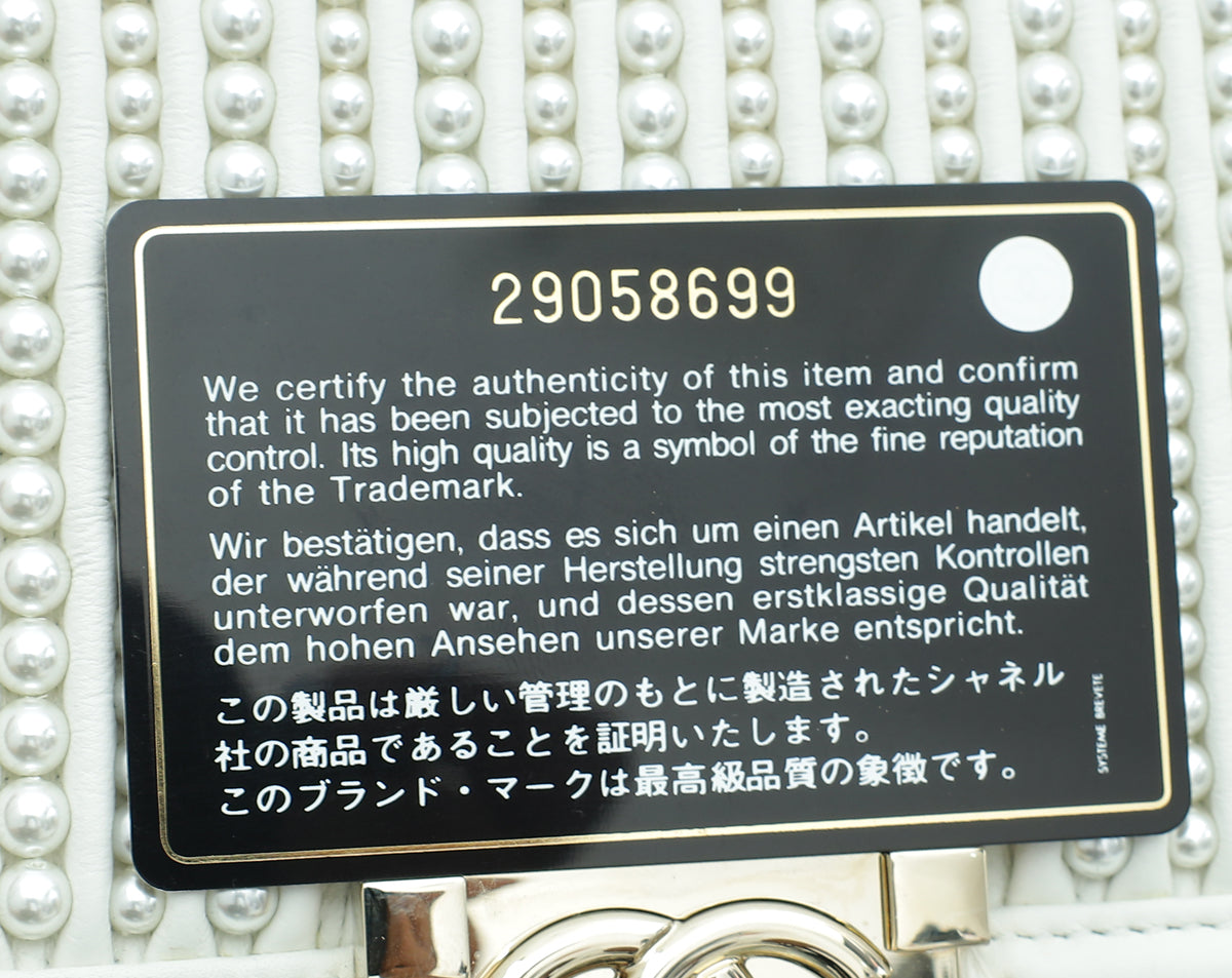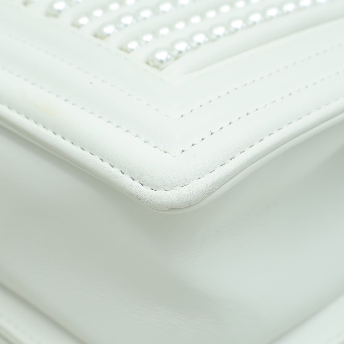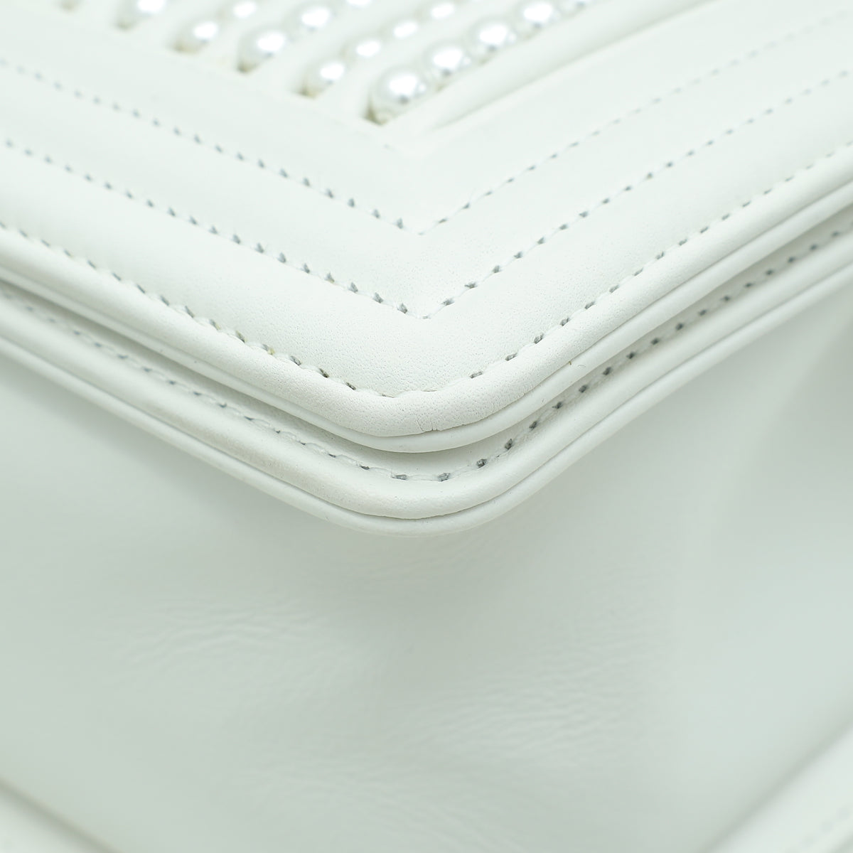 Material: White Quilted Calfskin Leather with Faux Pearl Embellished