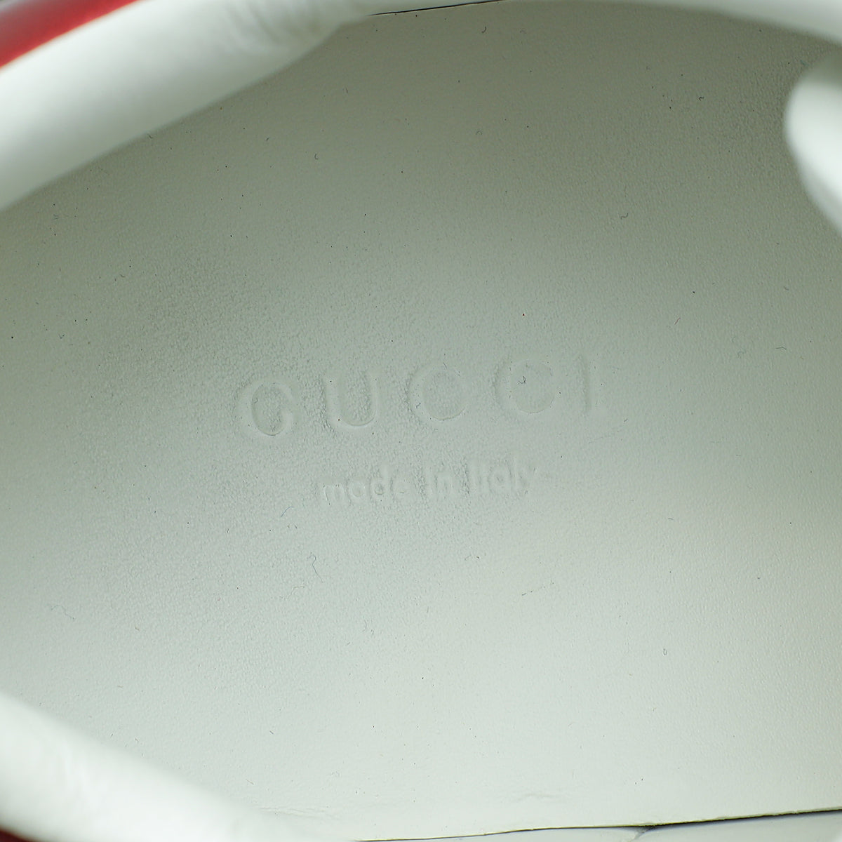 Material: White Leather with Navy Blue/Red Web, Gold Embroidered Bee, Crystals oh Heel, Red Leather Detail on The Back of One Shoe and Blue Leather Detail on The Back of The Other Shoe