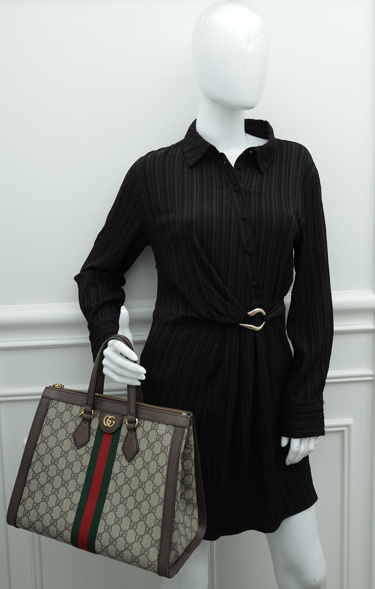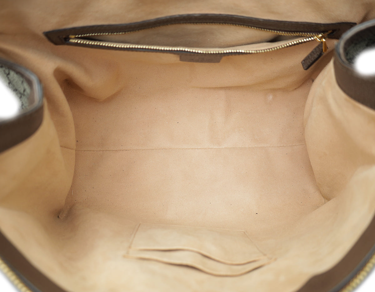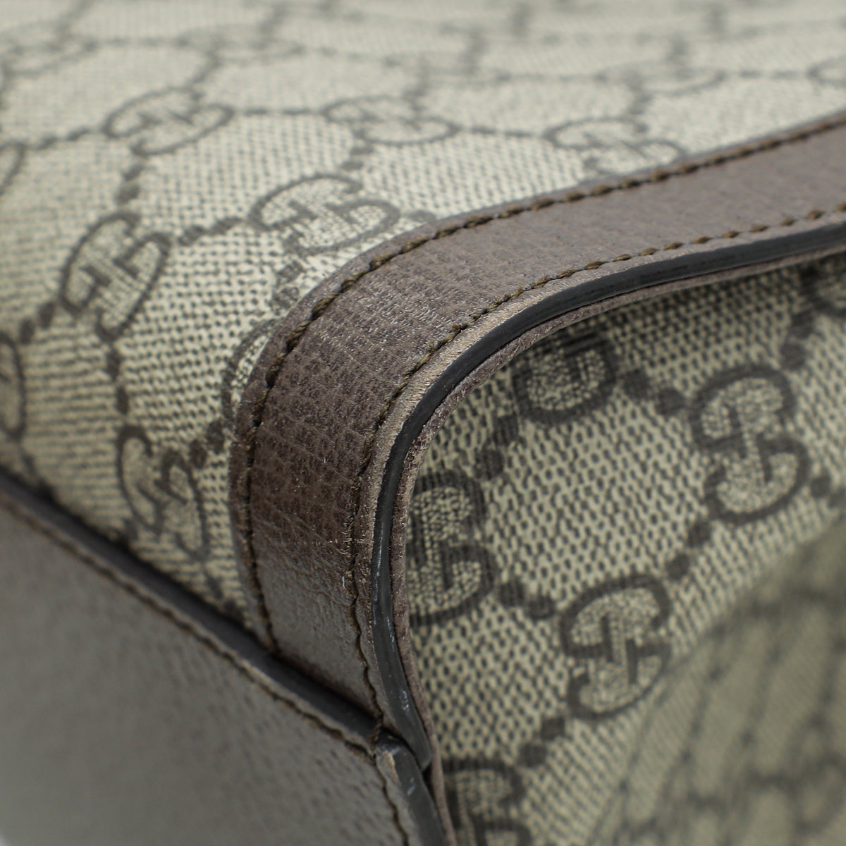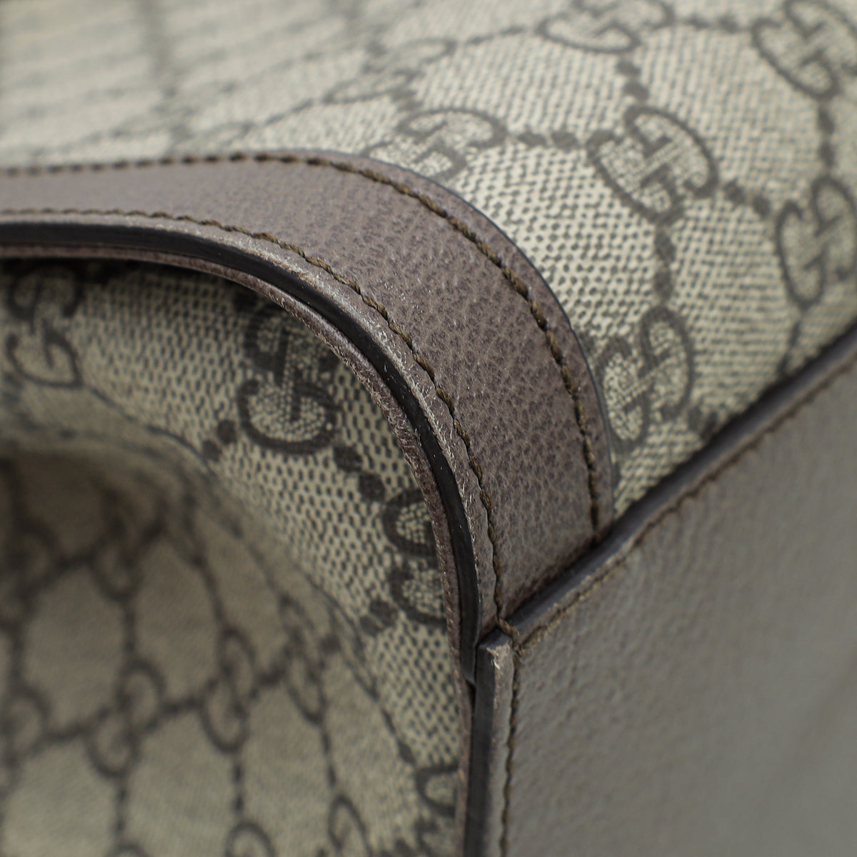 المواد: قماش سوبريم بنقش GG باللون الأبنوسي وزخرفة من الجلد باللون البني وشريط ويب باللون الأخضر/الأحمر