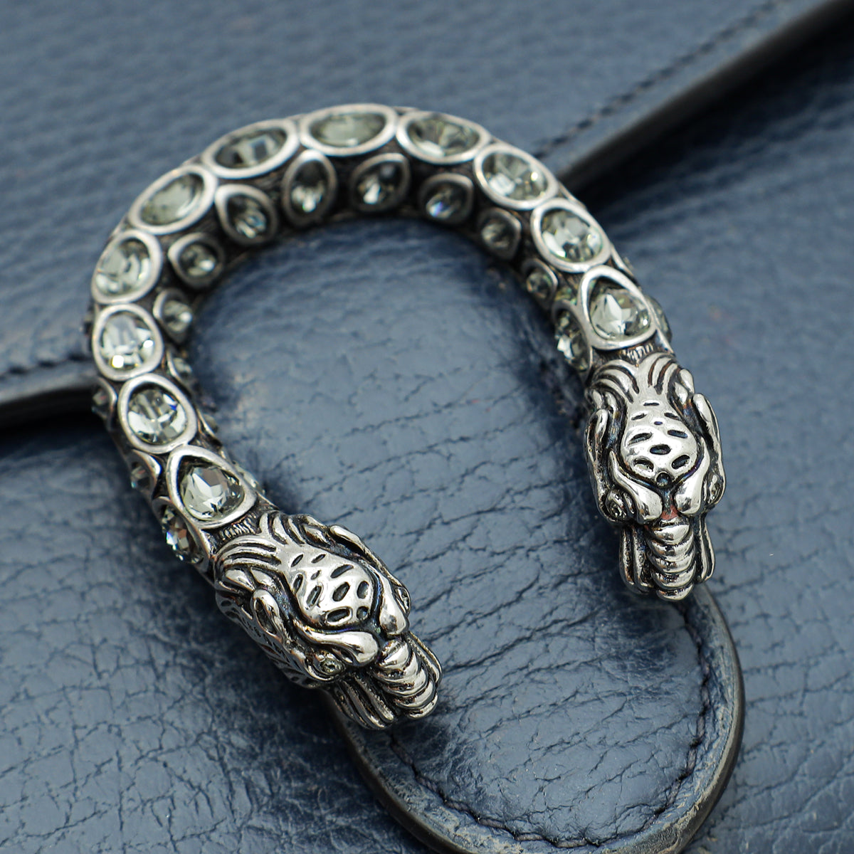 المواد: جلد باللون الأزرق الداكن ورأس نمر للإغلاق مرصع بالكريستال