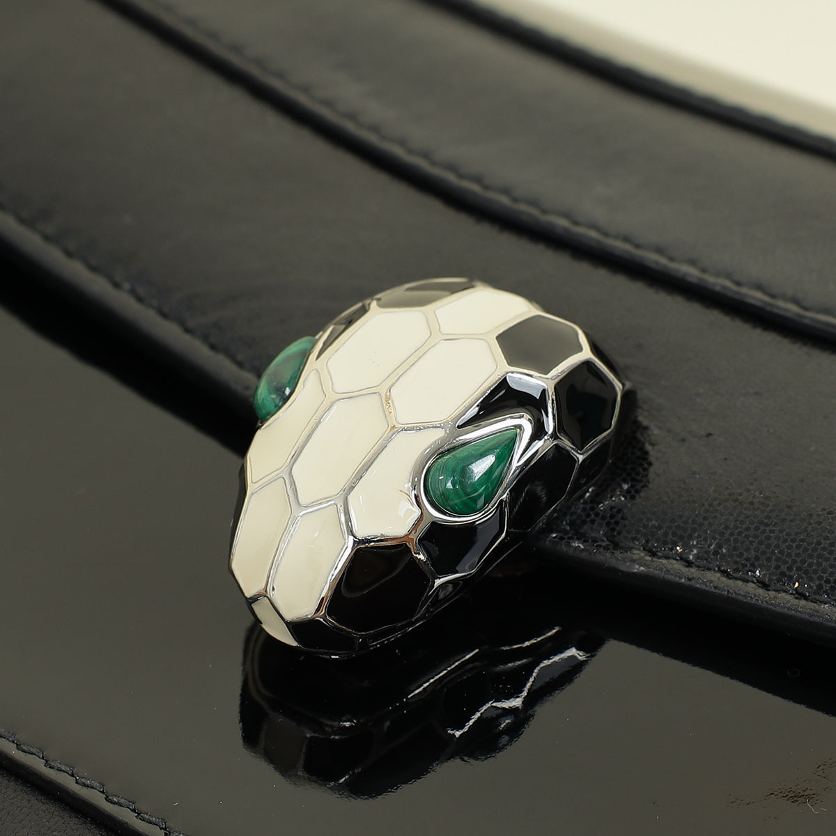 Material: Shimmer Leather and Lambskin Patent Leather with Black/White Enamel and Eyes in Green Malachite