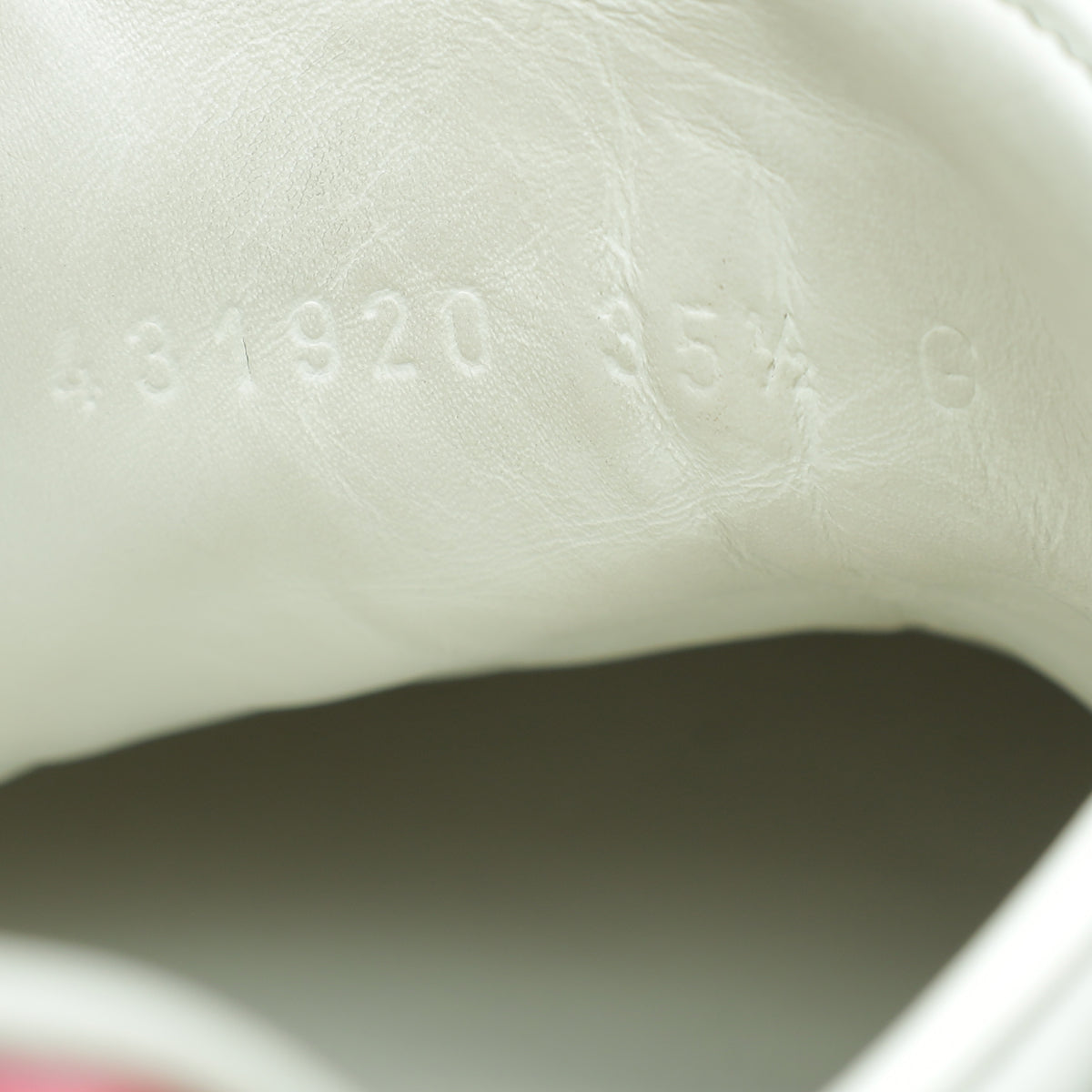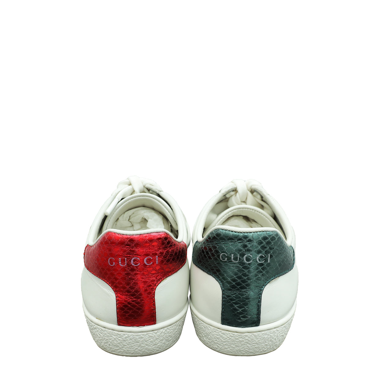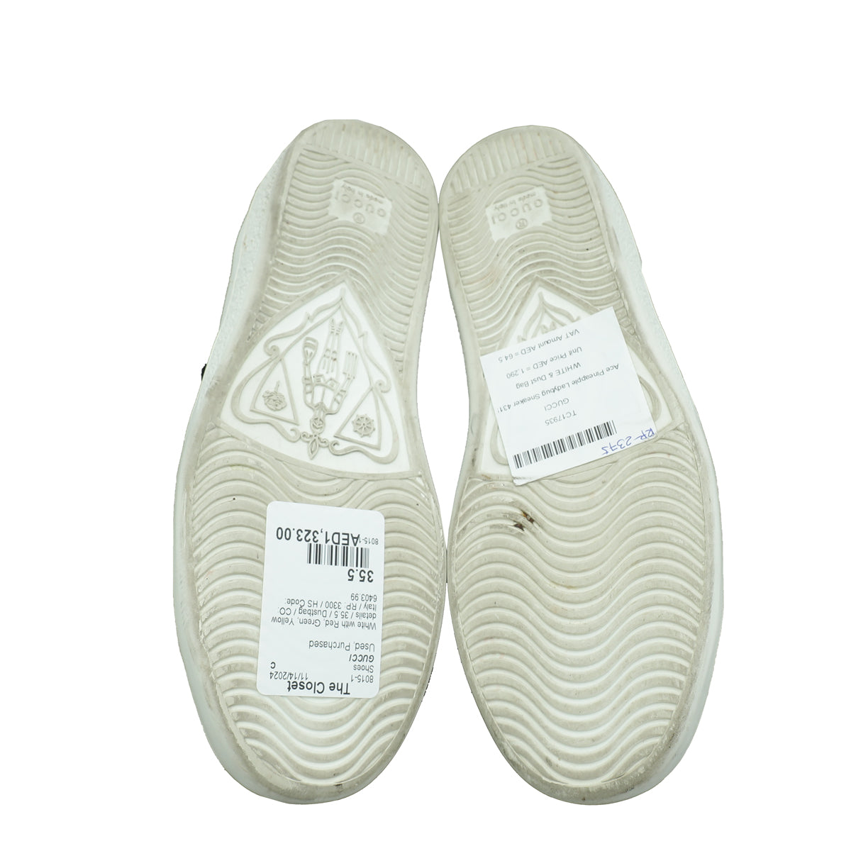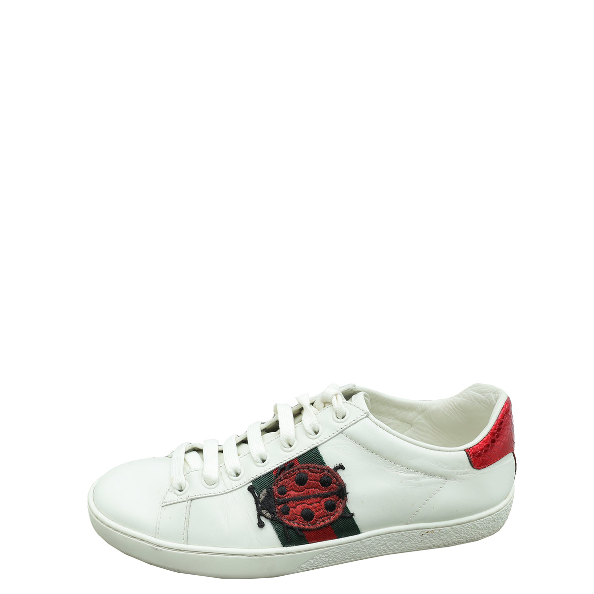 Material: White Leather with Green/Red Web Embroidered Patches of Ladybug, Yellow Stars, and Pineapple and Red Snakeskin Leather Detail on The Back of One Shoe and Green on The Other.