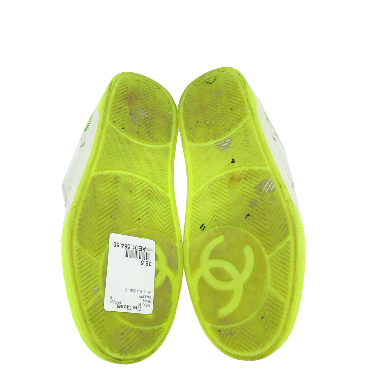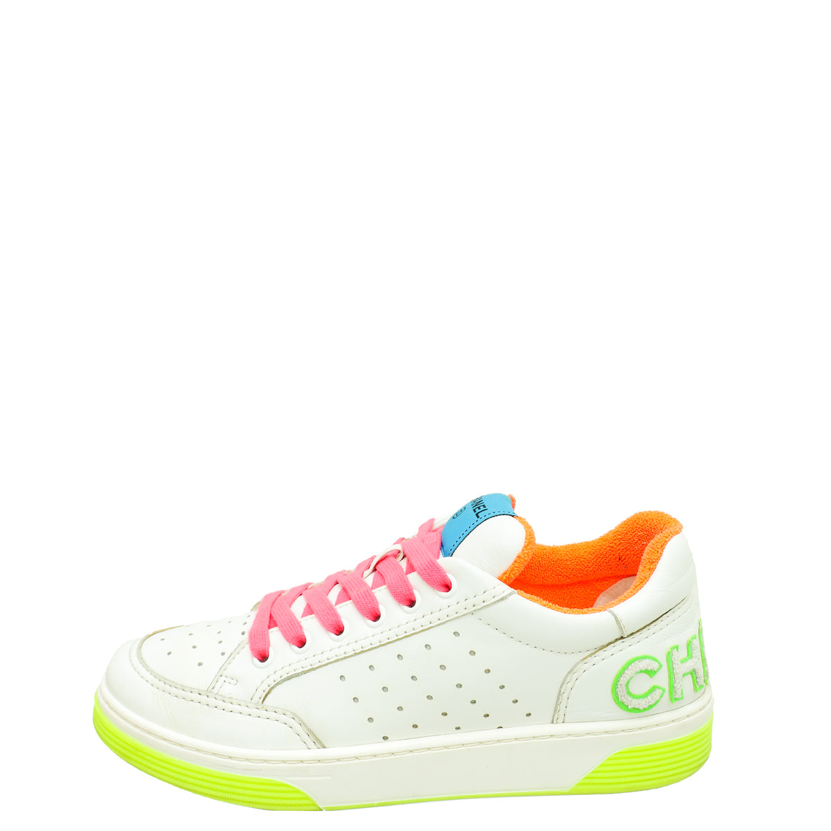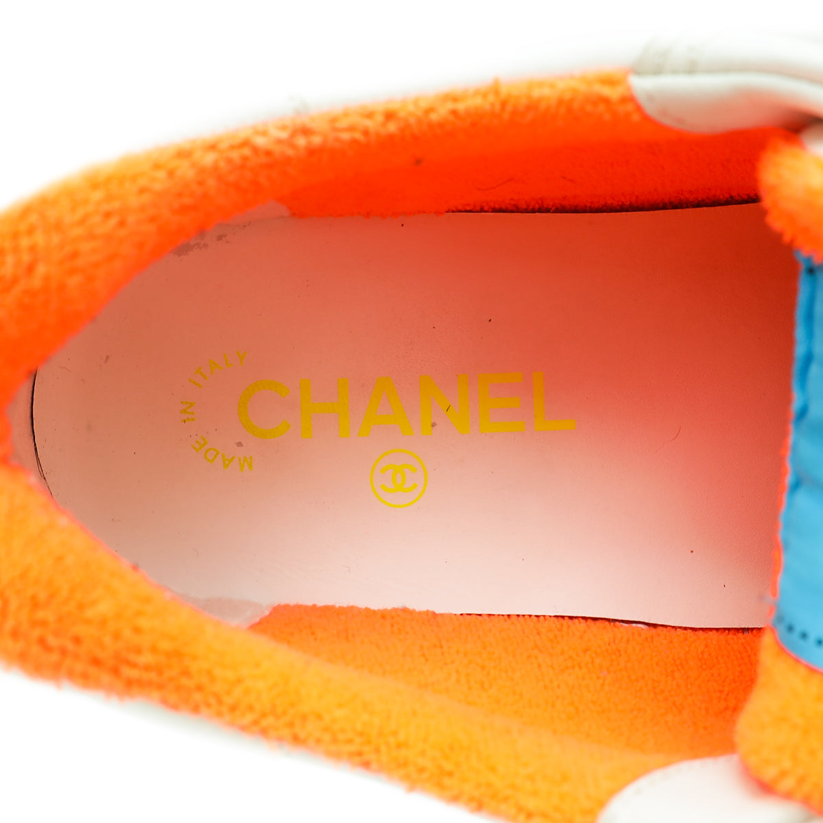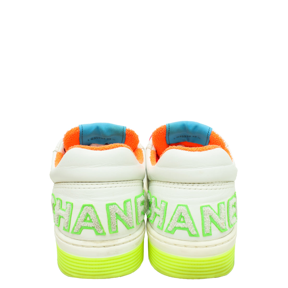 - Material: White Calfskin Leather and Multicolor Terry Cloth 'CHANEL' Logo On The Back