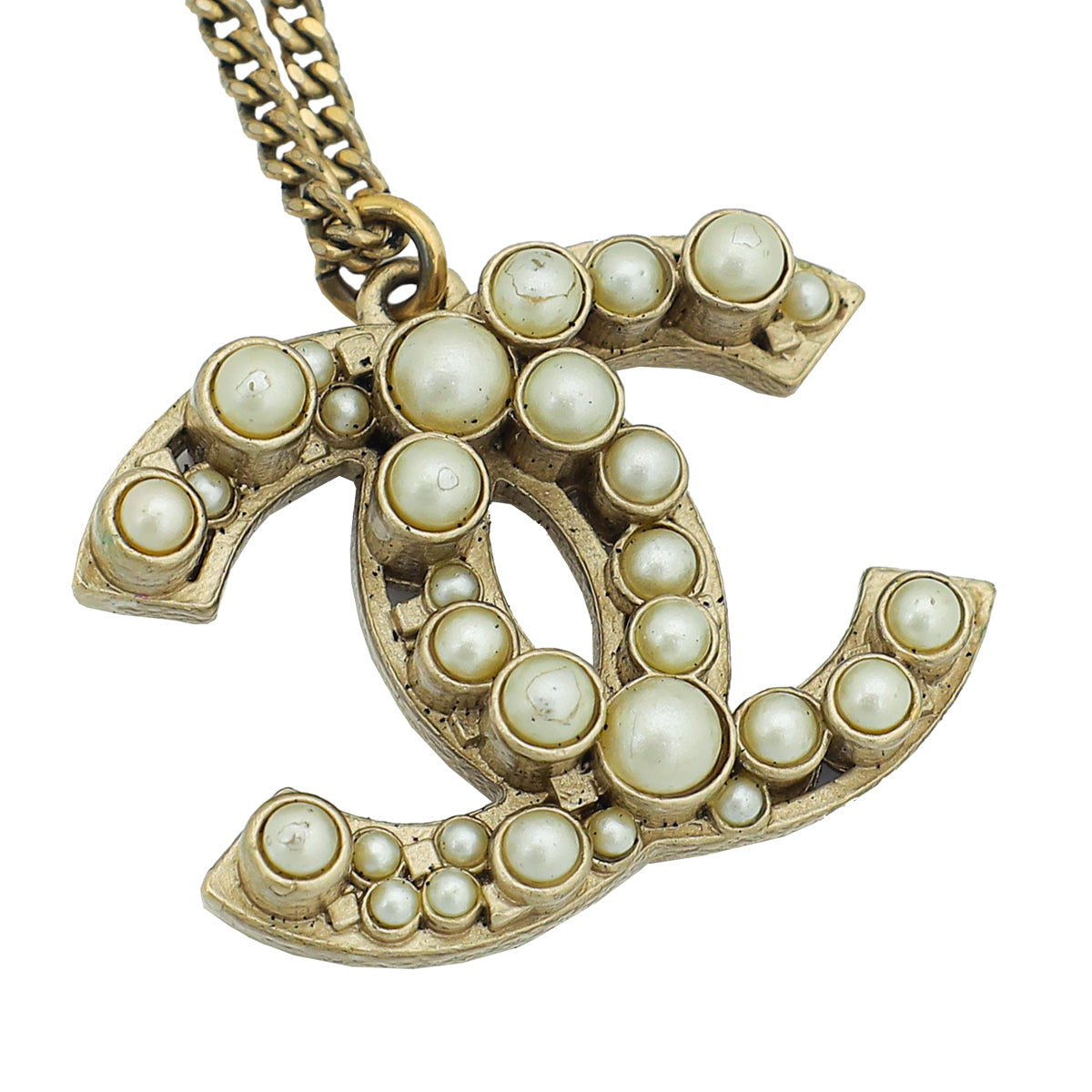 Material: Light Gold Tone Metal CC Logo with Faux Pearls