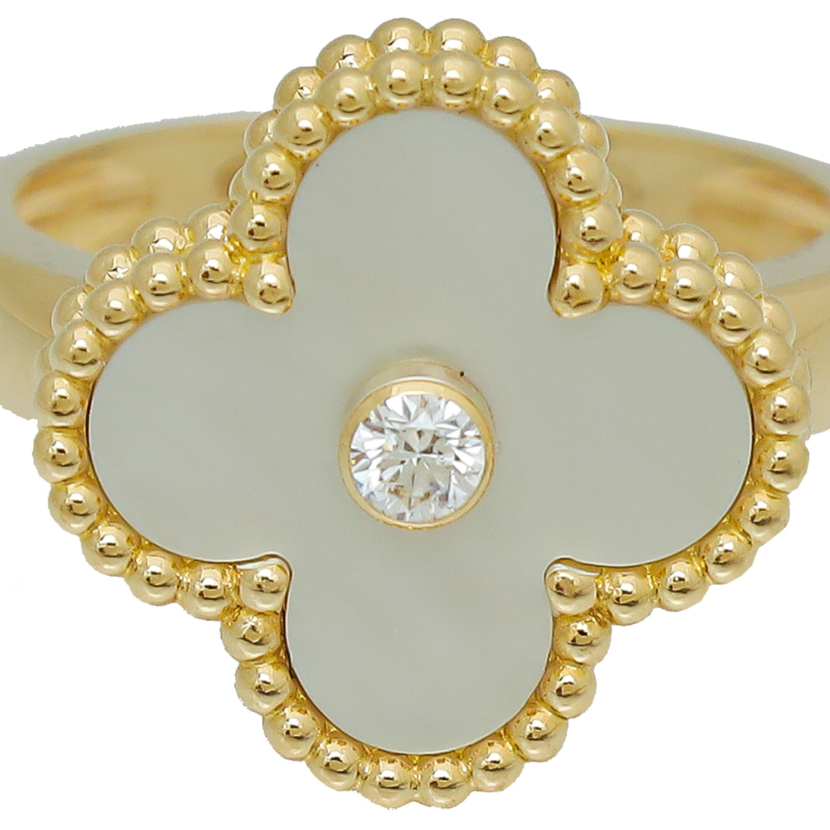 Van Cleef & Arpels 18K Yellow Gold MOP Diamond Vintage Alhambra Ring 51