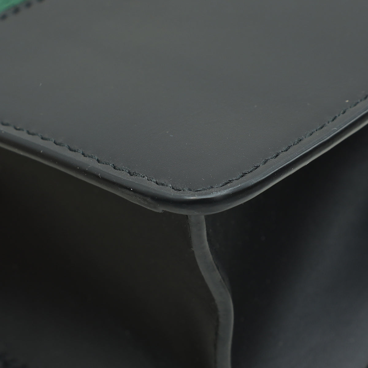 Material: Black Smooth Calf Leather with Green/Red Web Detail and Red/Blue Fabric Shoulder Strap