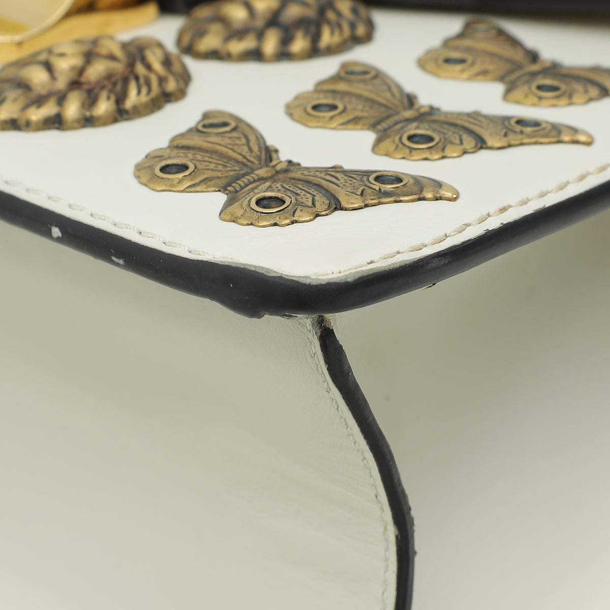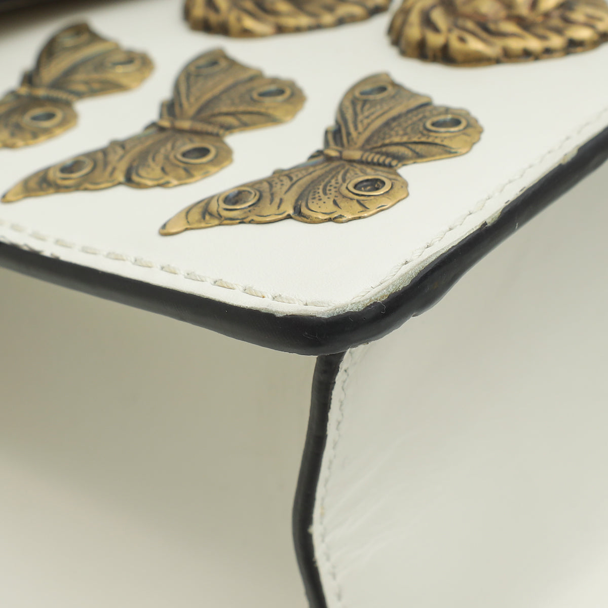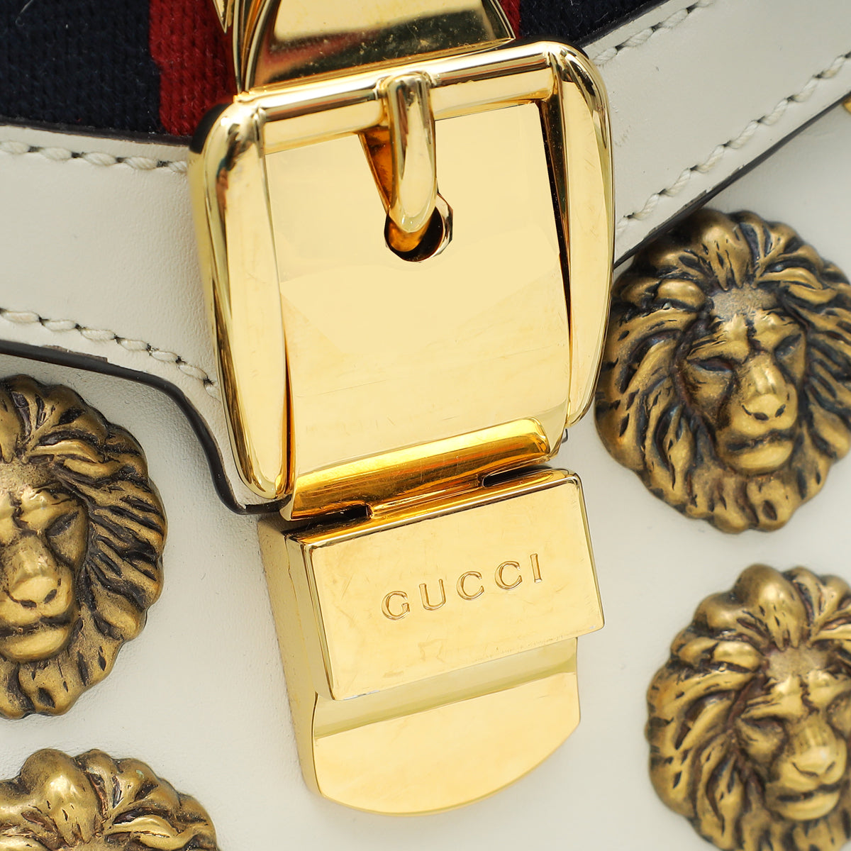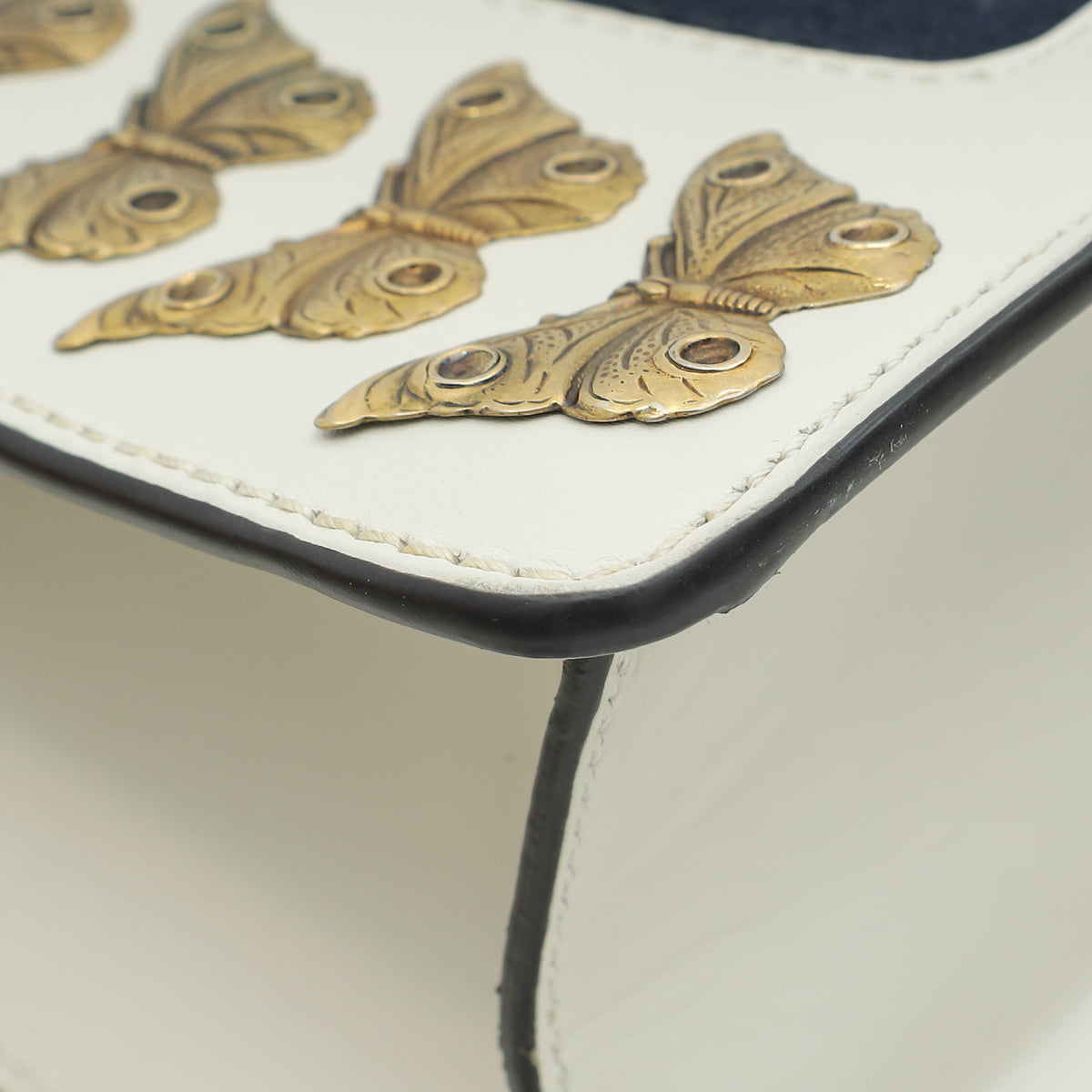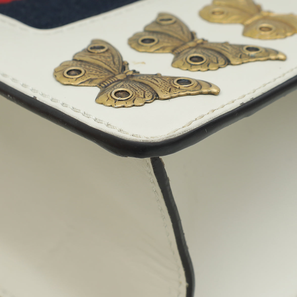 Material: White Smooth Calf Leather with Navy/Red Web Detail, Aged Gold Butterflies and Lion Heads Studs and Red/Blue/White Fabric Shoulder Strap