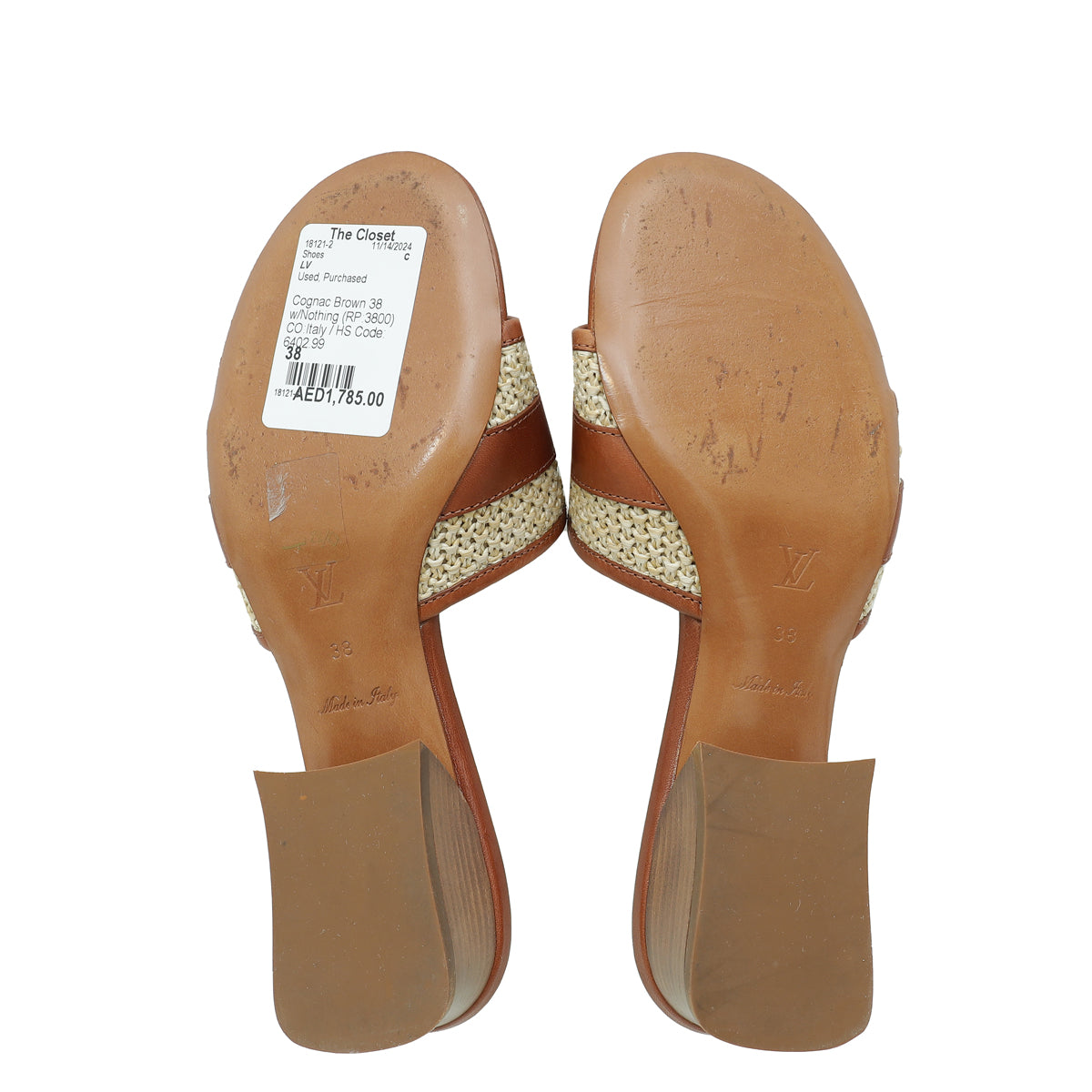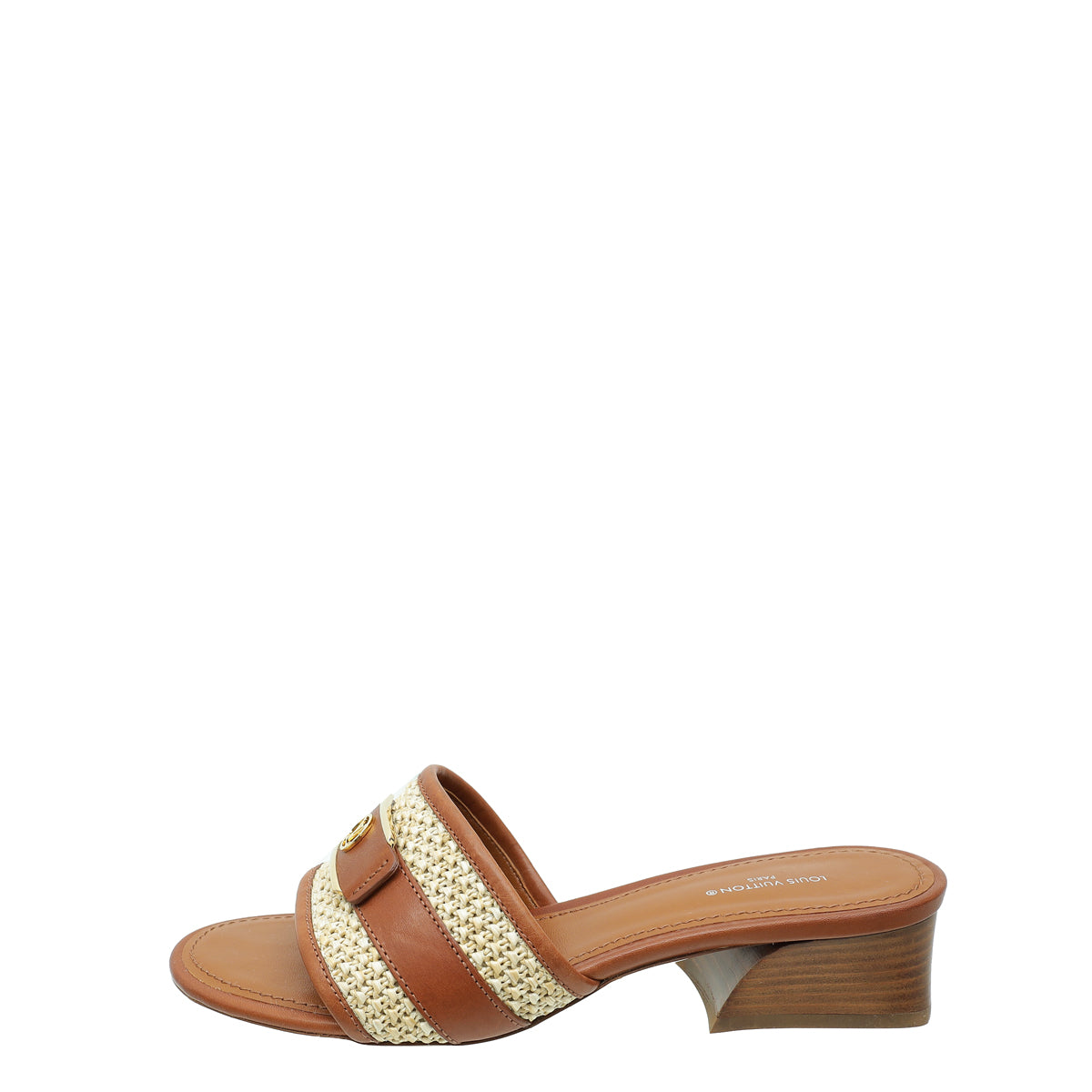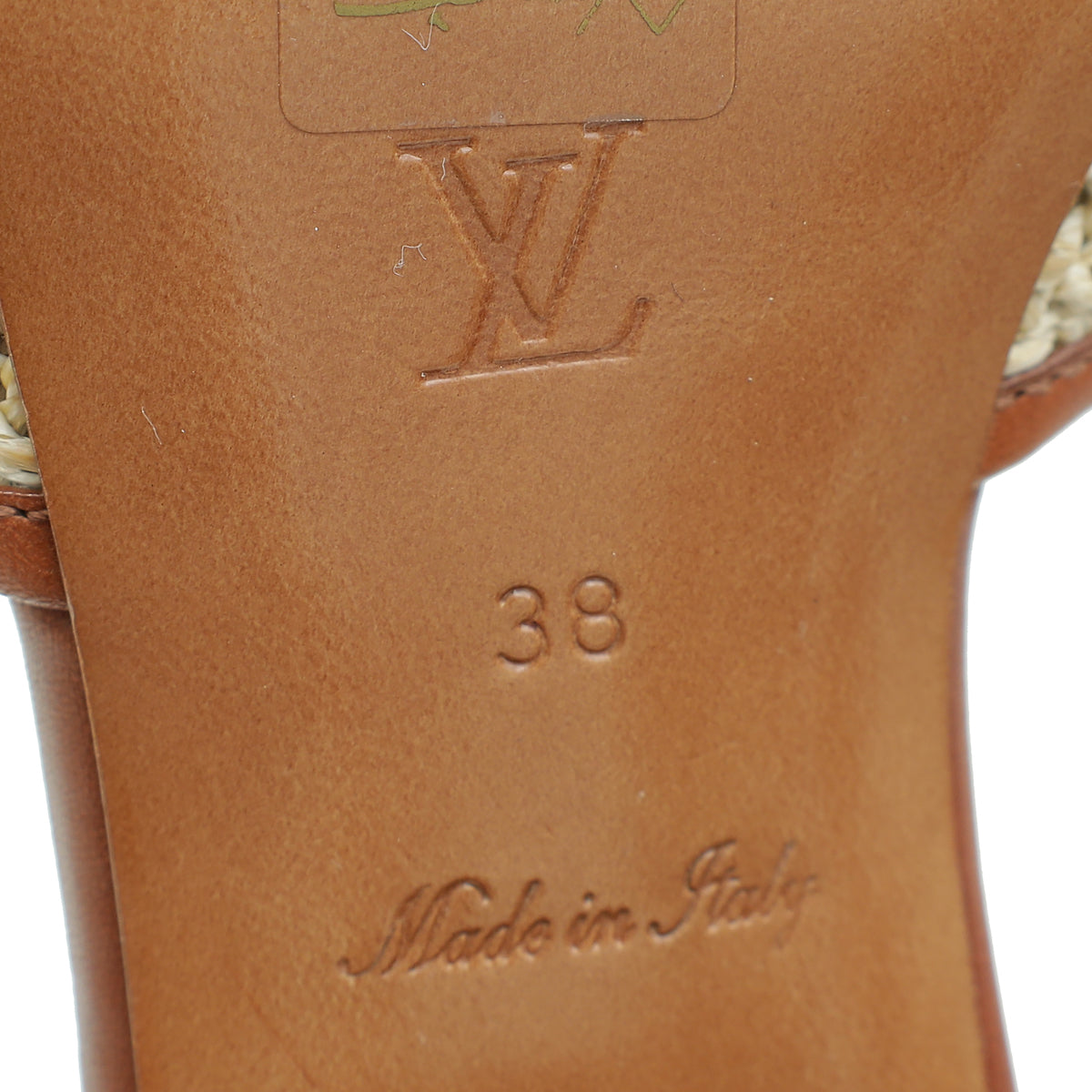Louis Vuitton Cognac Brown Raffia Calfskin Lock It Heeled Mules 38
