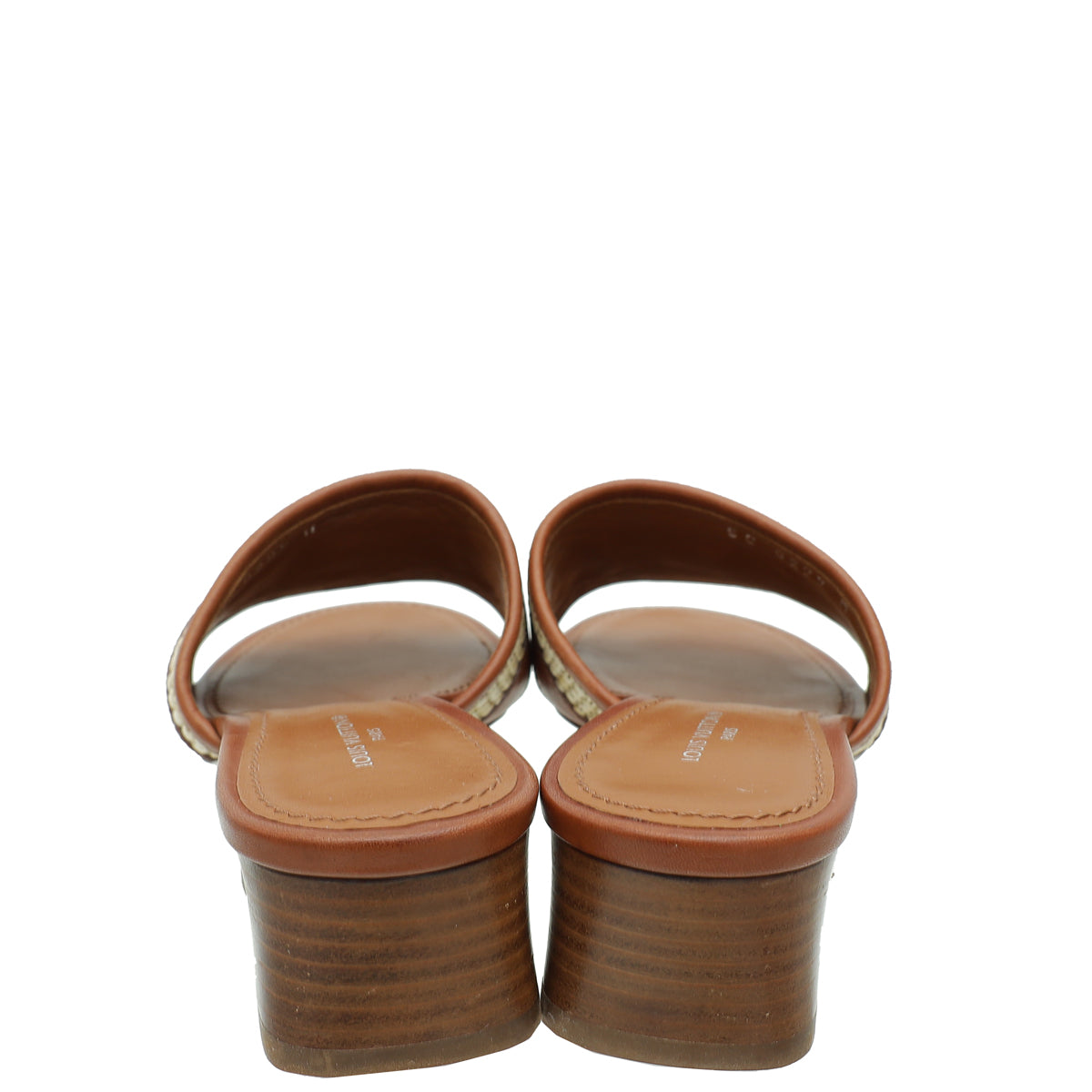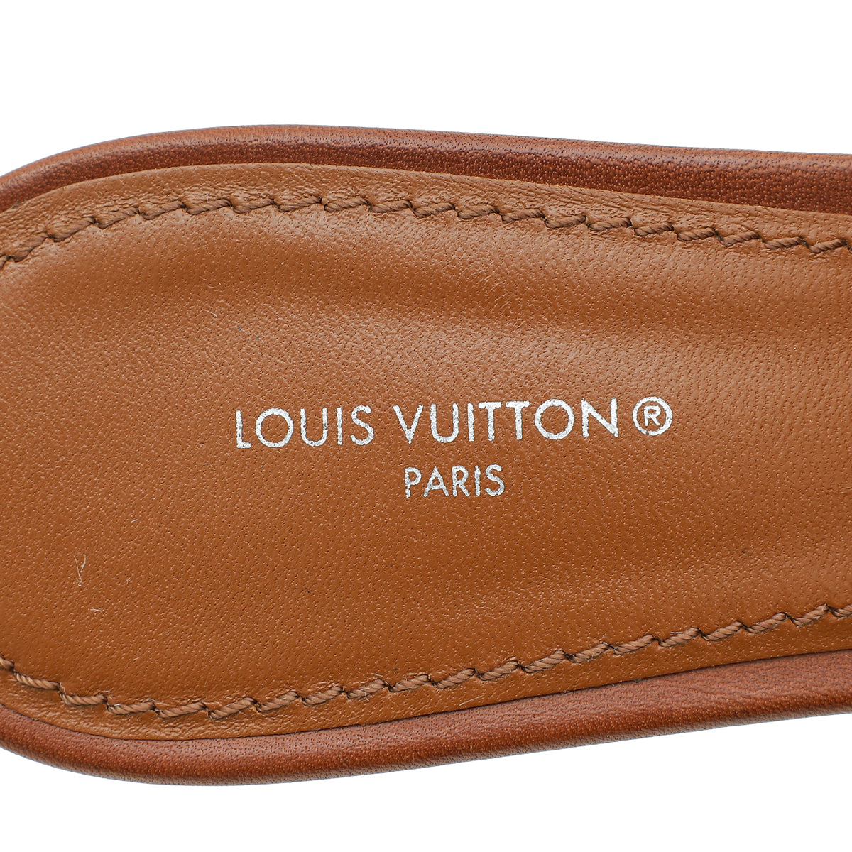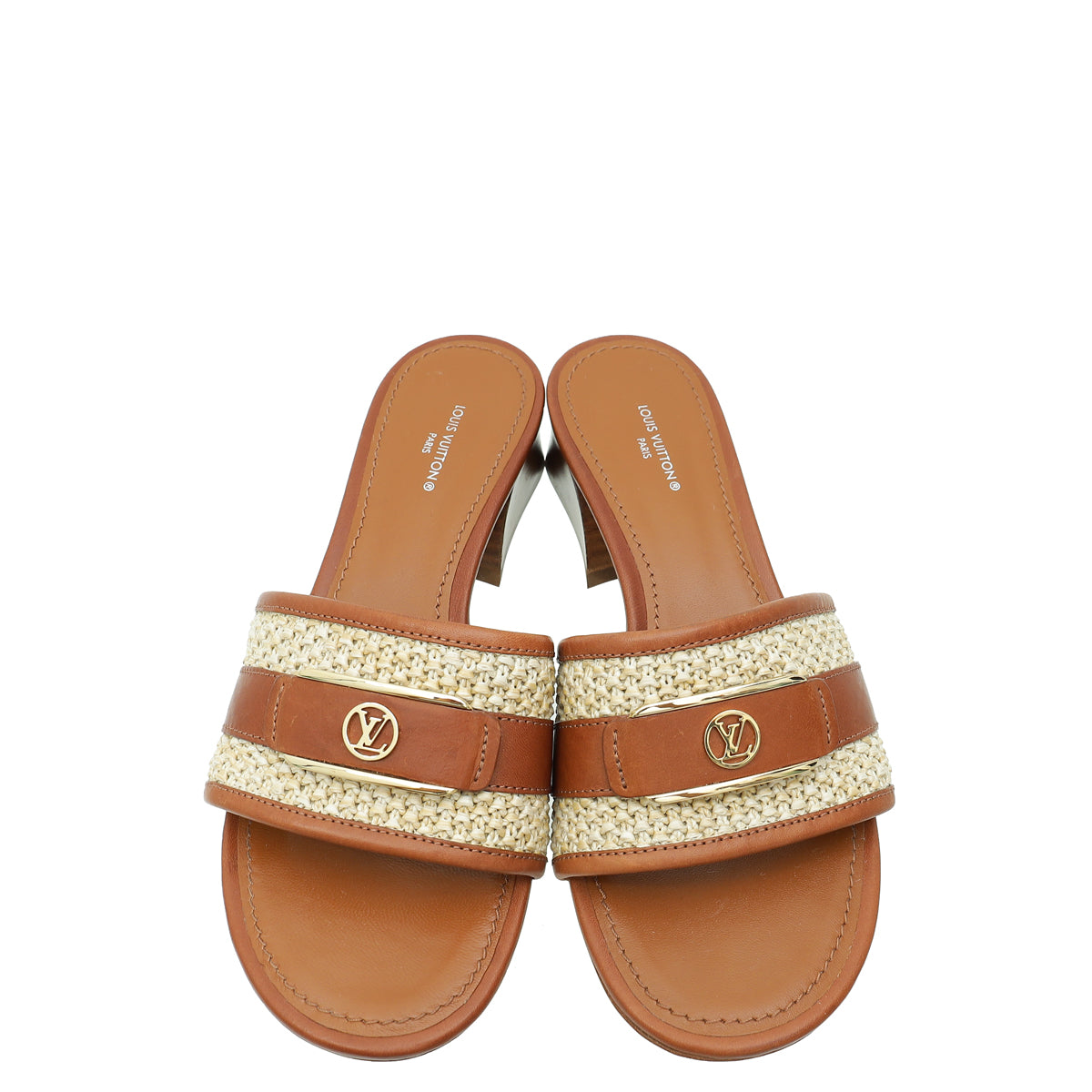Louis Vuitton Cognac Brown Raffia Calfskin Lock It Heeled Mules 38