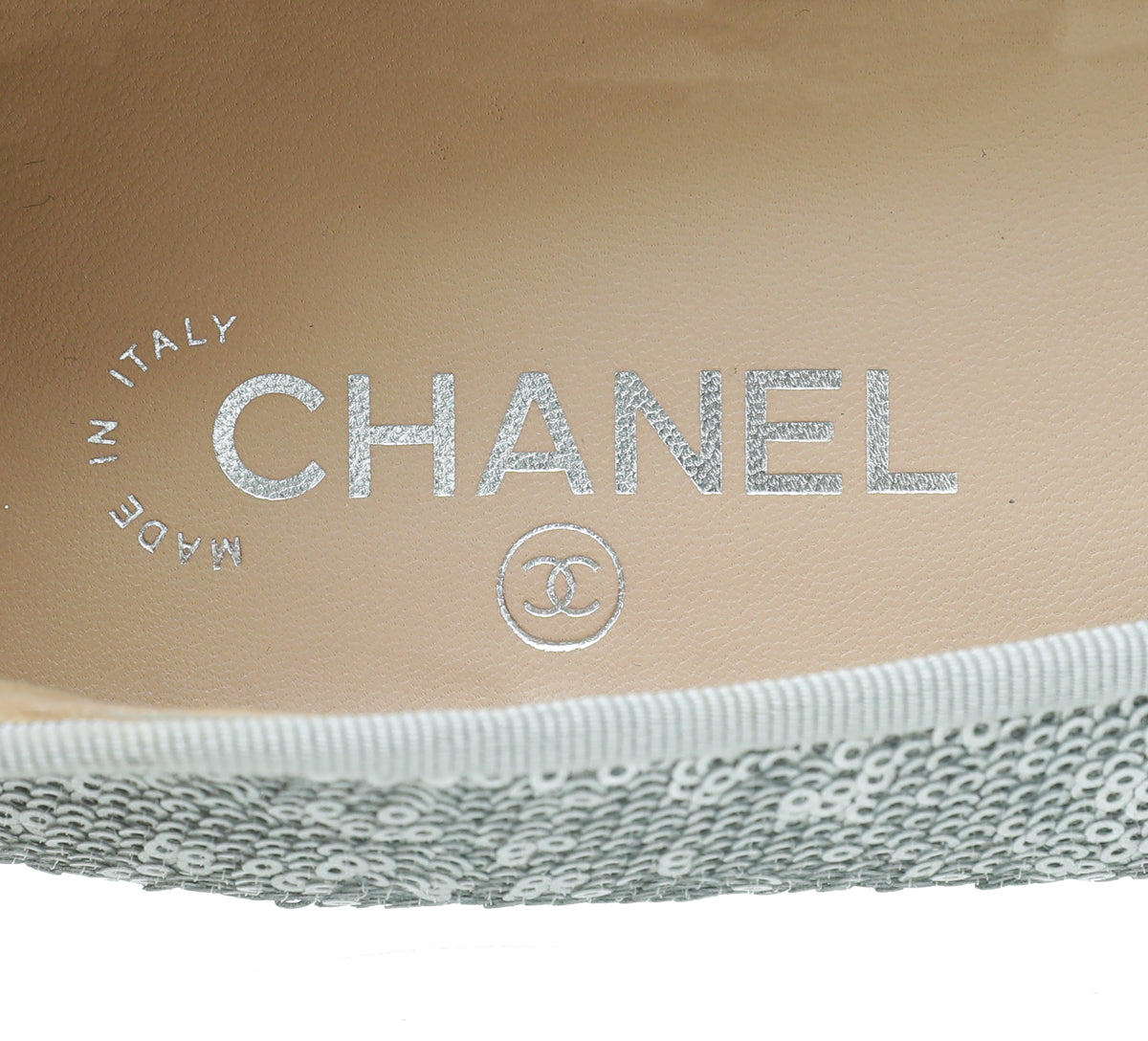 Chanel Metallic Silver CC Cap Toe Sequins Flat Ballet 38