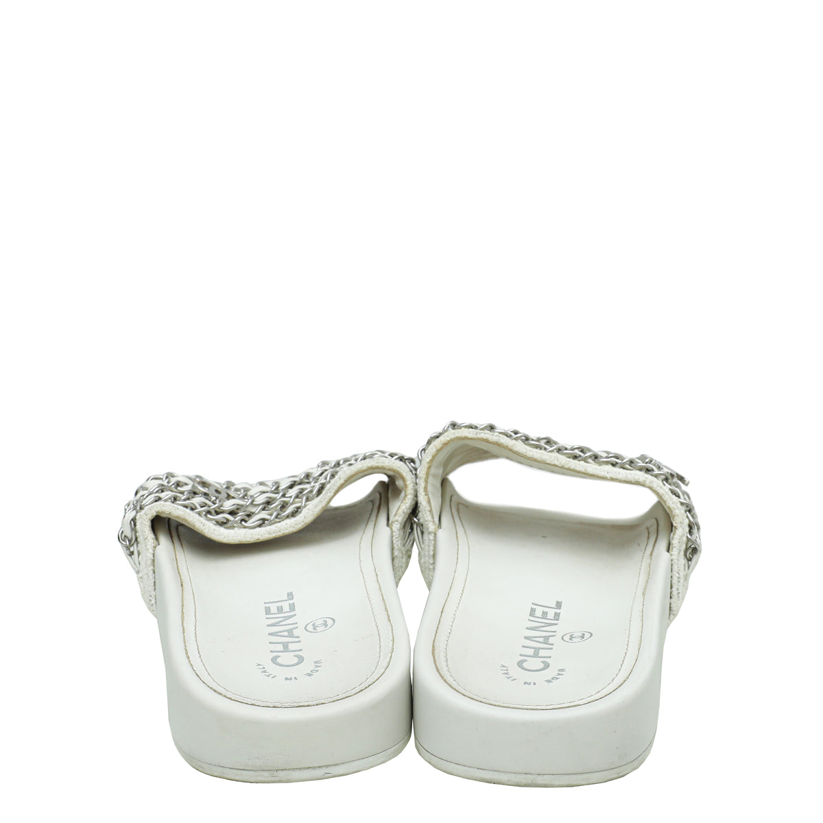 Chanel White Satin CC Charm Chain Slide Sandal 37