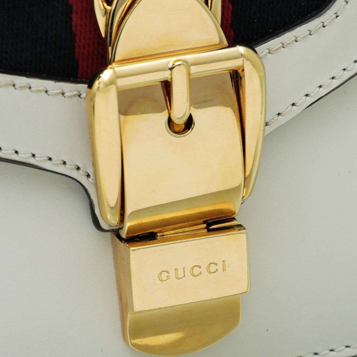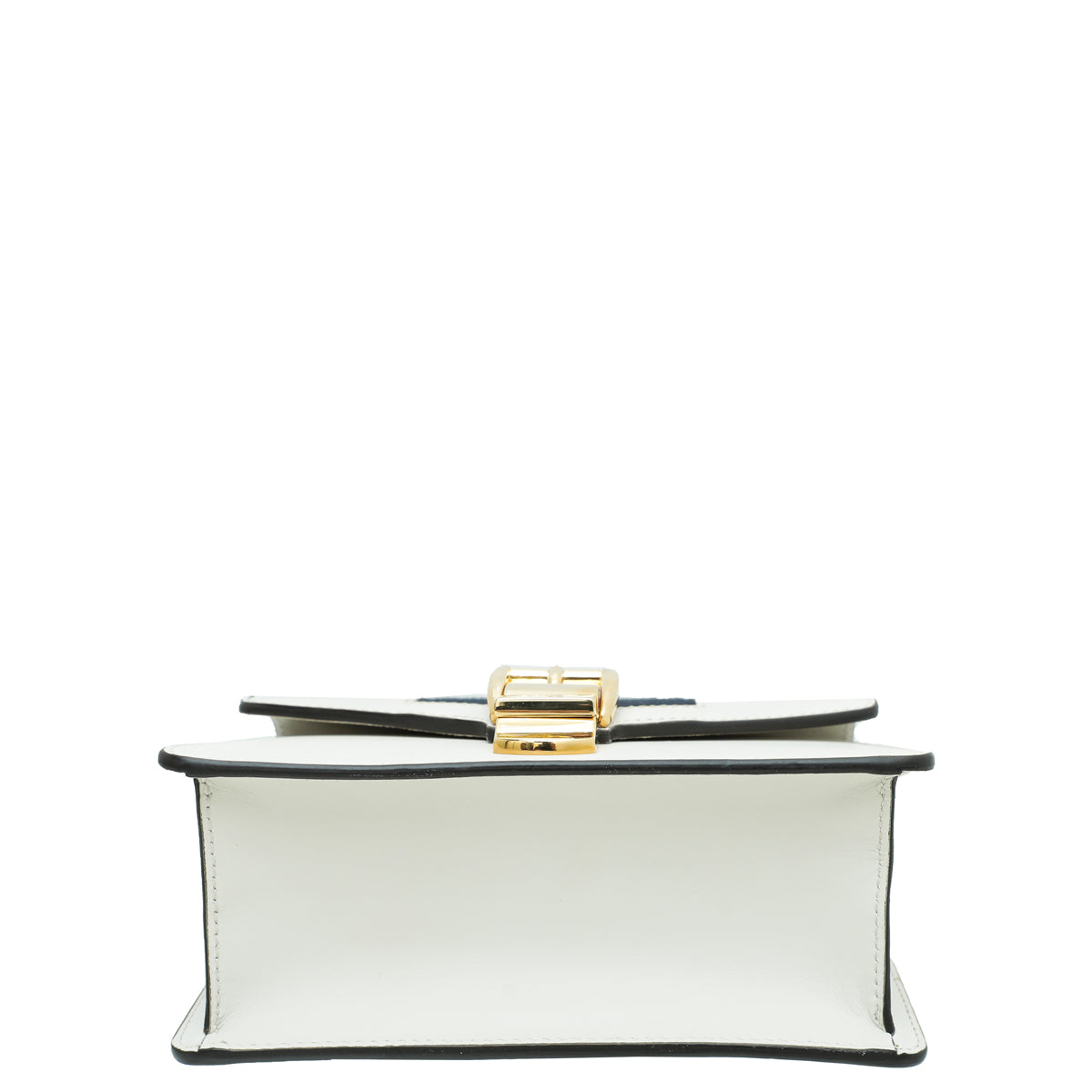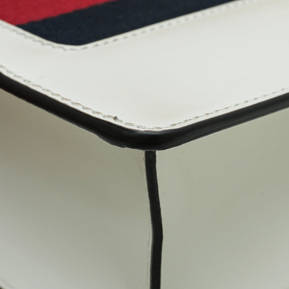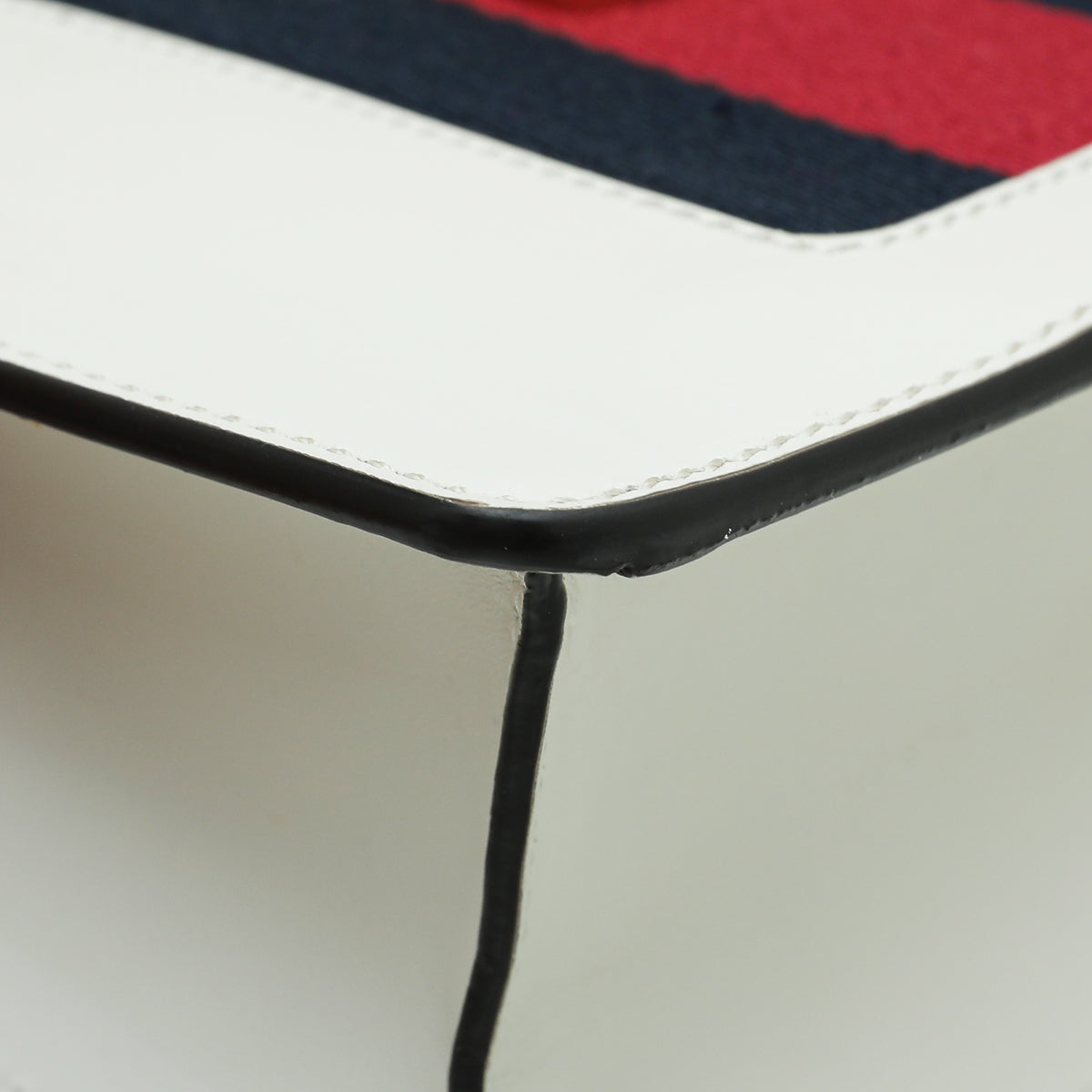 Material: White Leather with Navy/Red Web Detail and Red/Blue/White Fabric Shoulder Strap