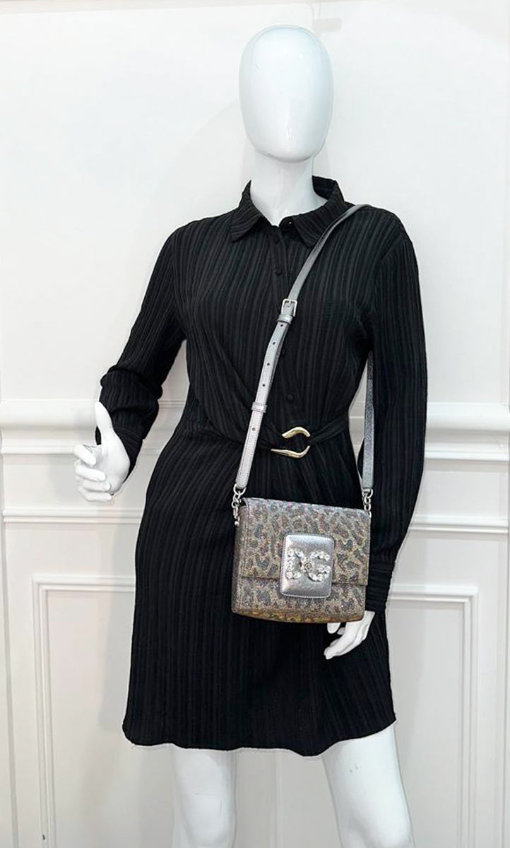Material: Metallic Silver Leopard-Print with DG Crystals and Leather Trim