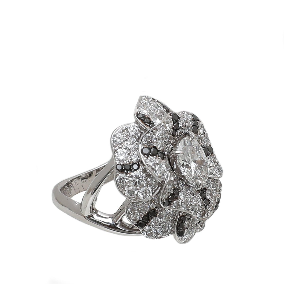 Chanel 18K White Gold Camellia Oval Solitaire W- White & Black Diamond Ring 51