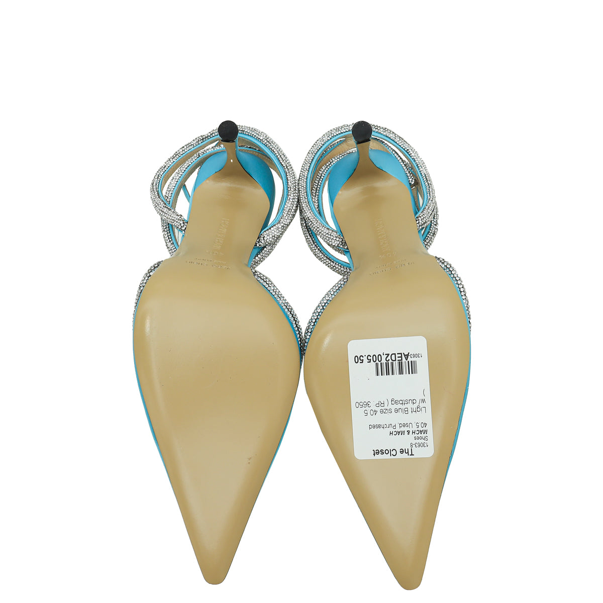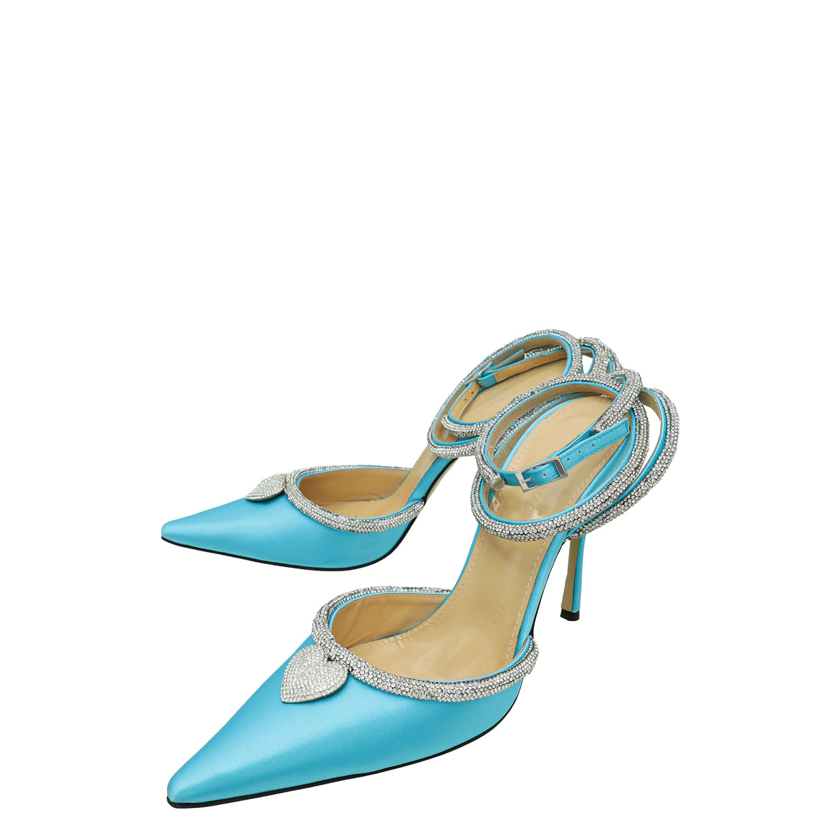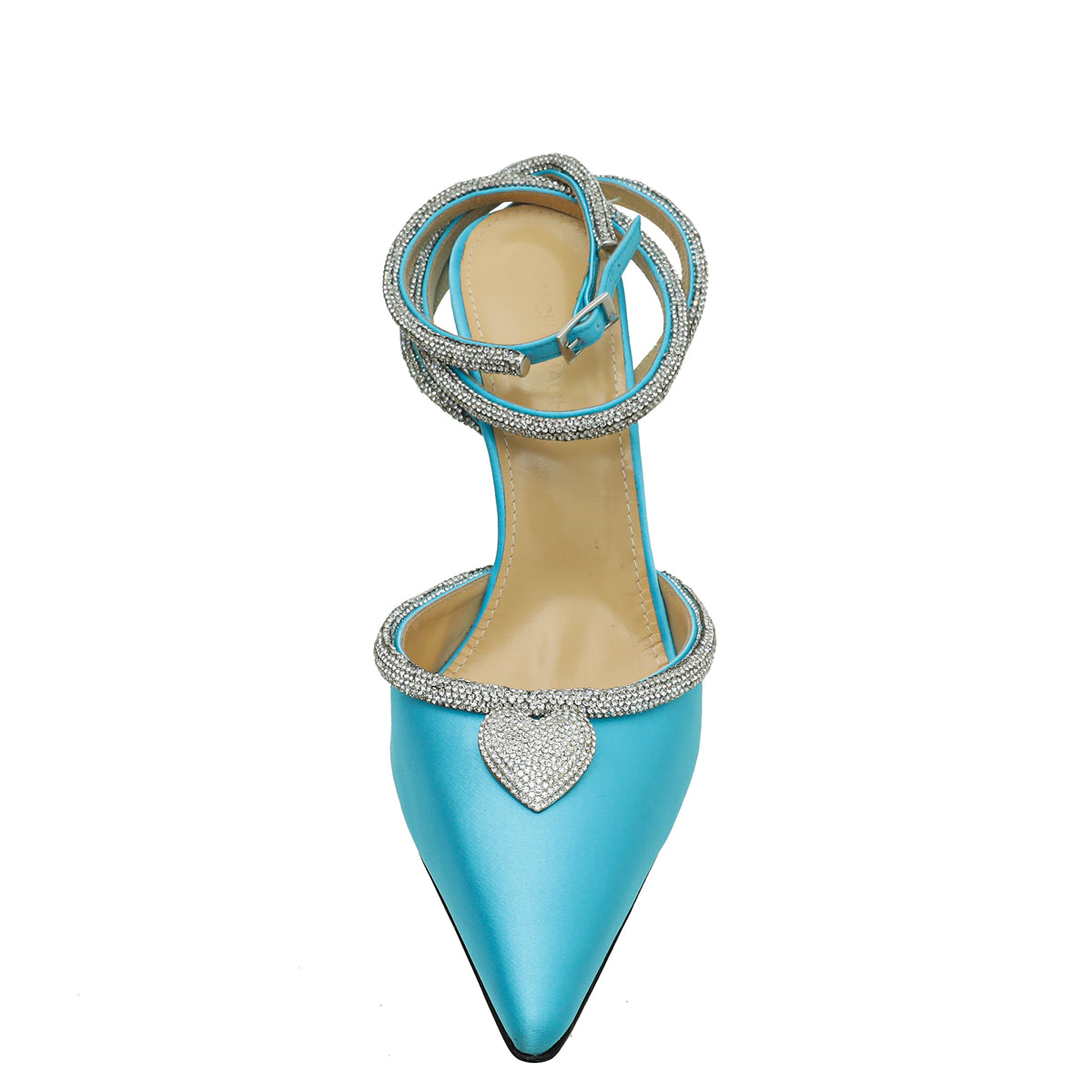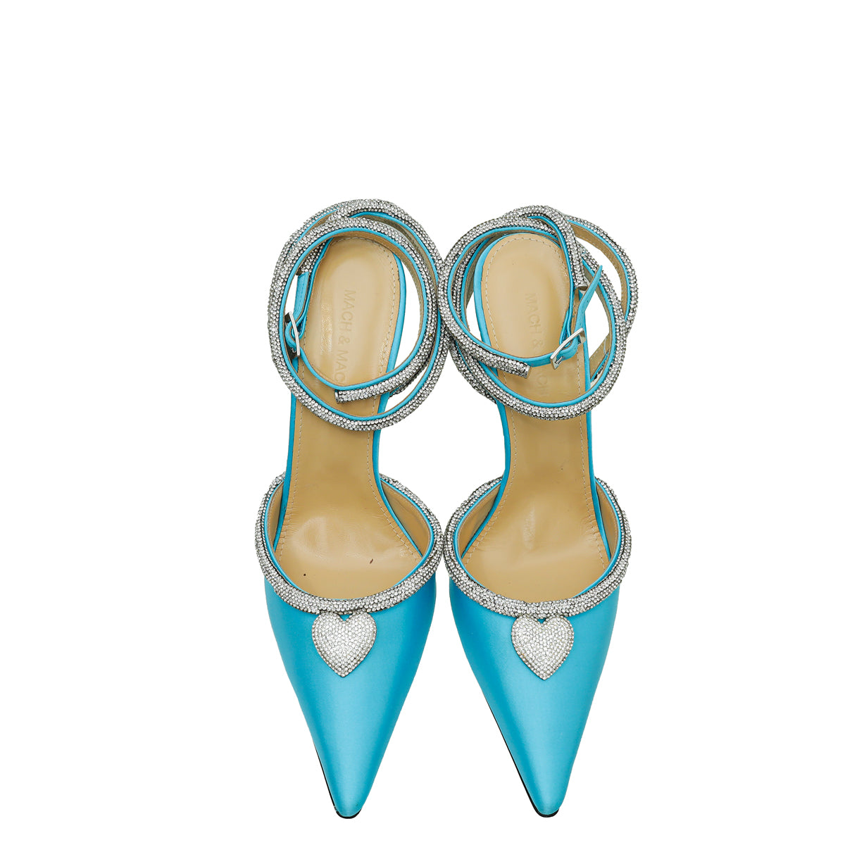 Mach & Mach Light Blue Satin Crystal Heart Embellished Ankle Strap Pumps 40.5