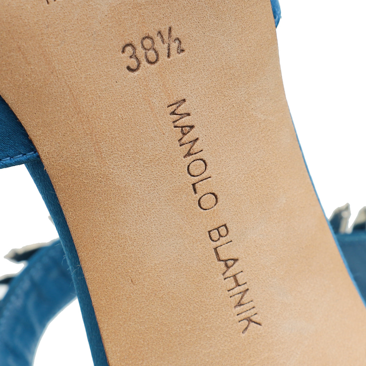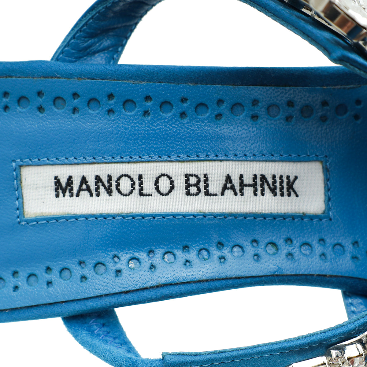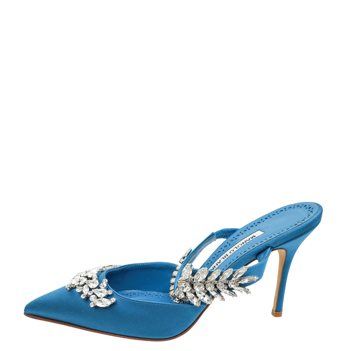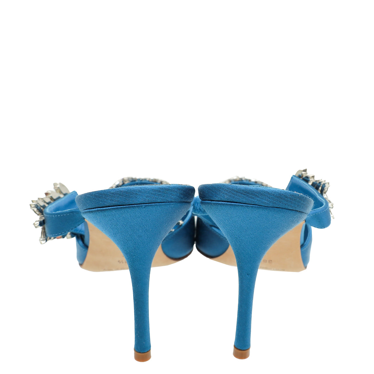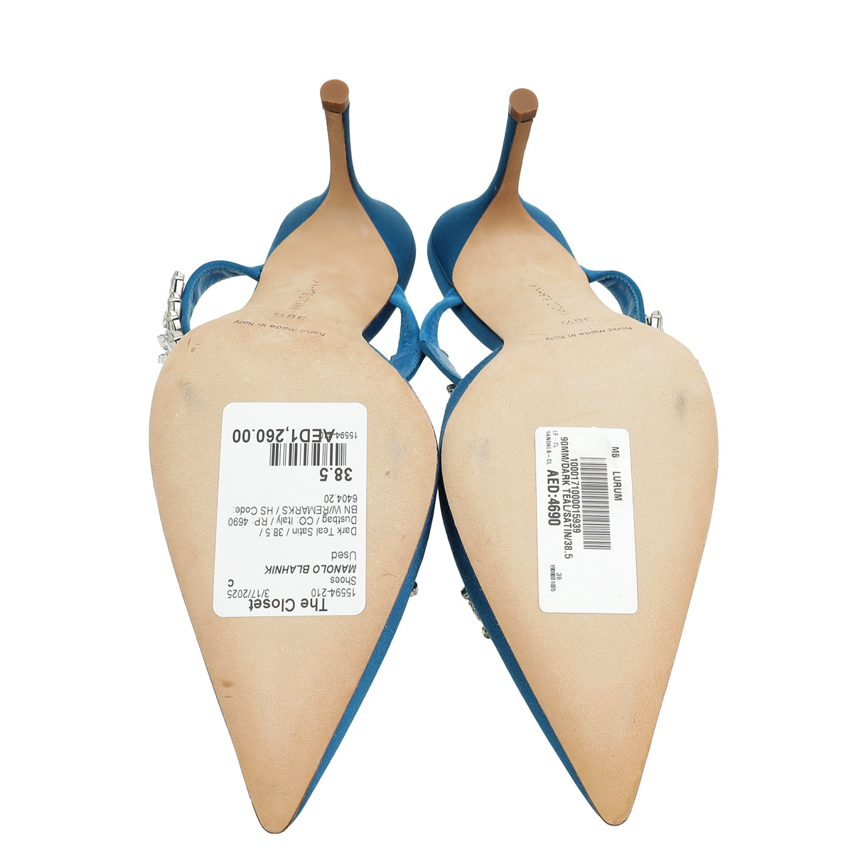 Manolo Blahnik Dark Teal Lurum Satin Crystal Slingback Mules 38.5