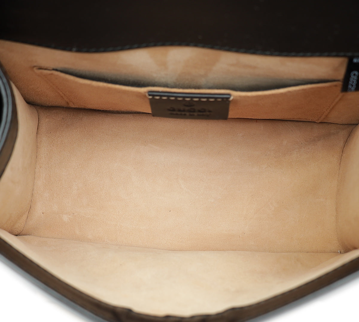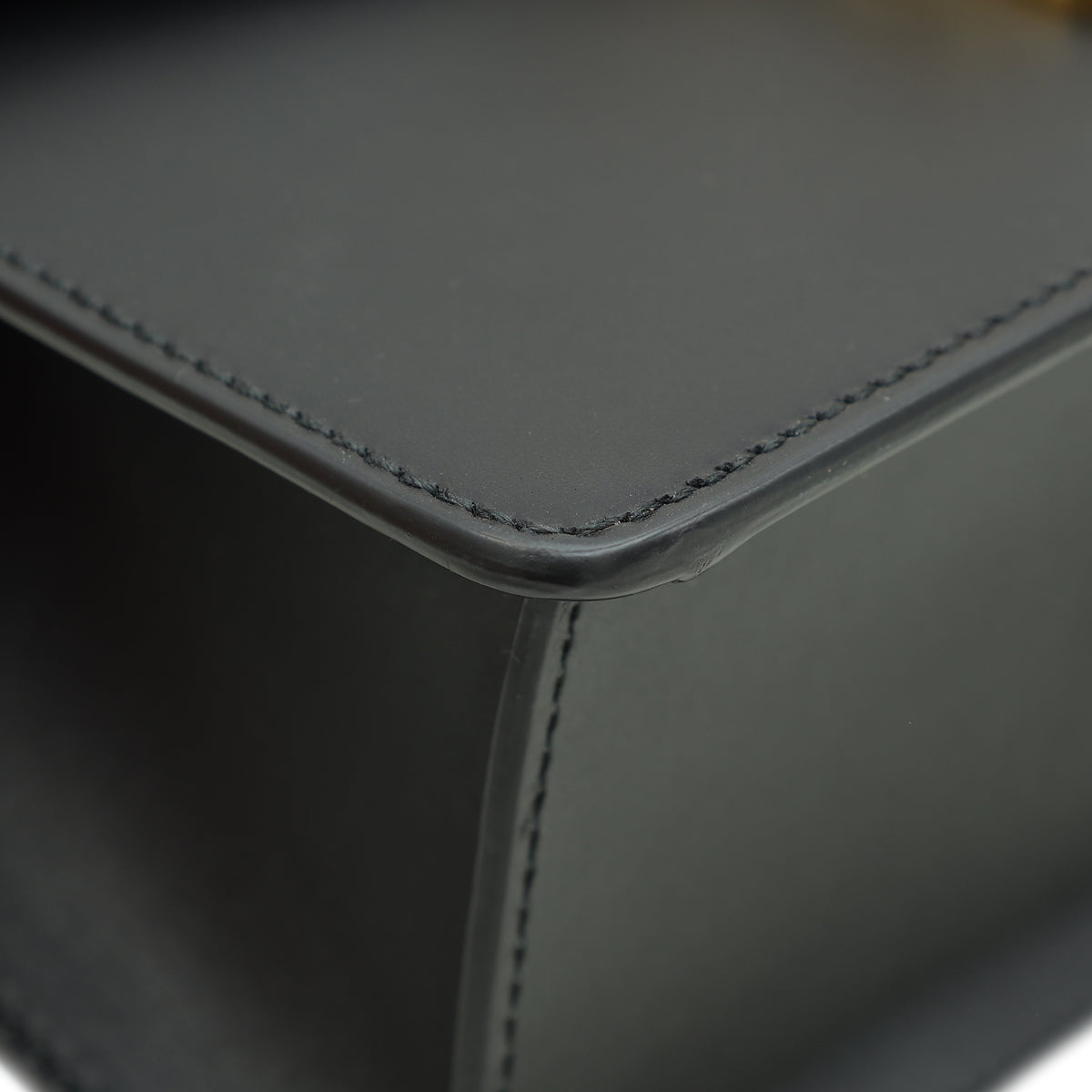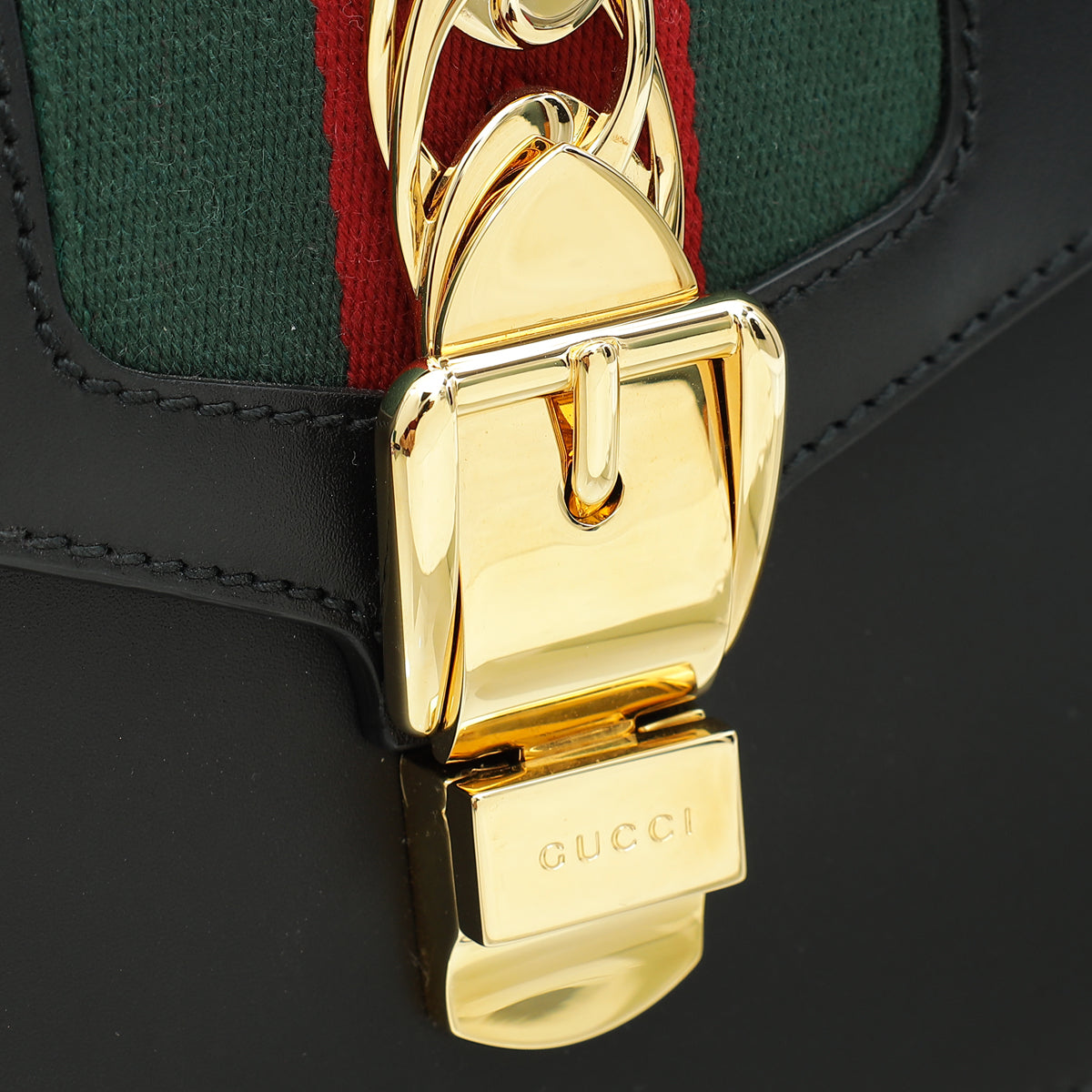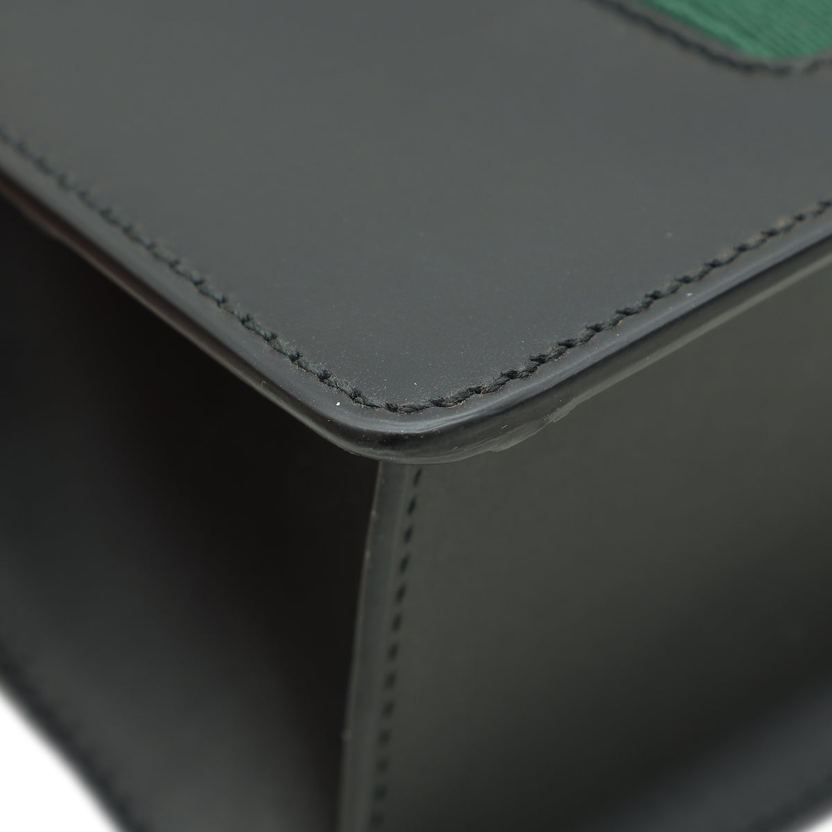 Material: Black Smooth Calf Leather with Green/Red Web Detail and Red/Blue/White Fabric Shoulder Strap