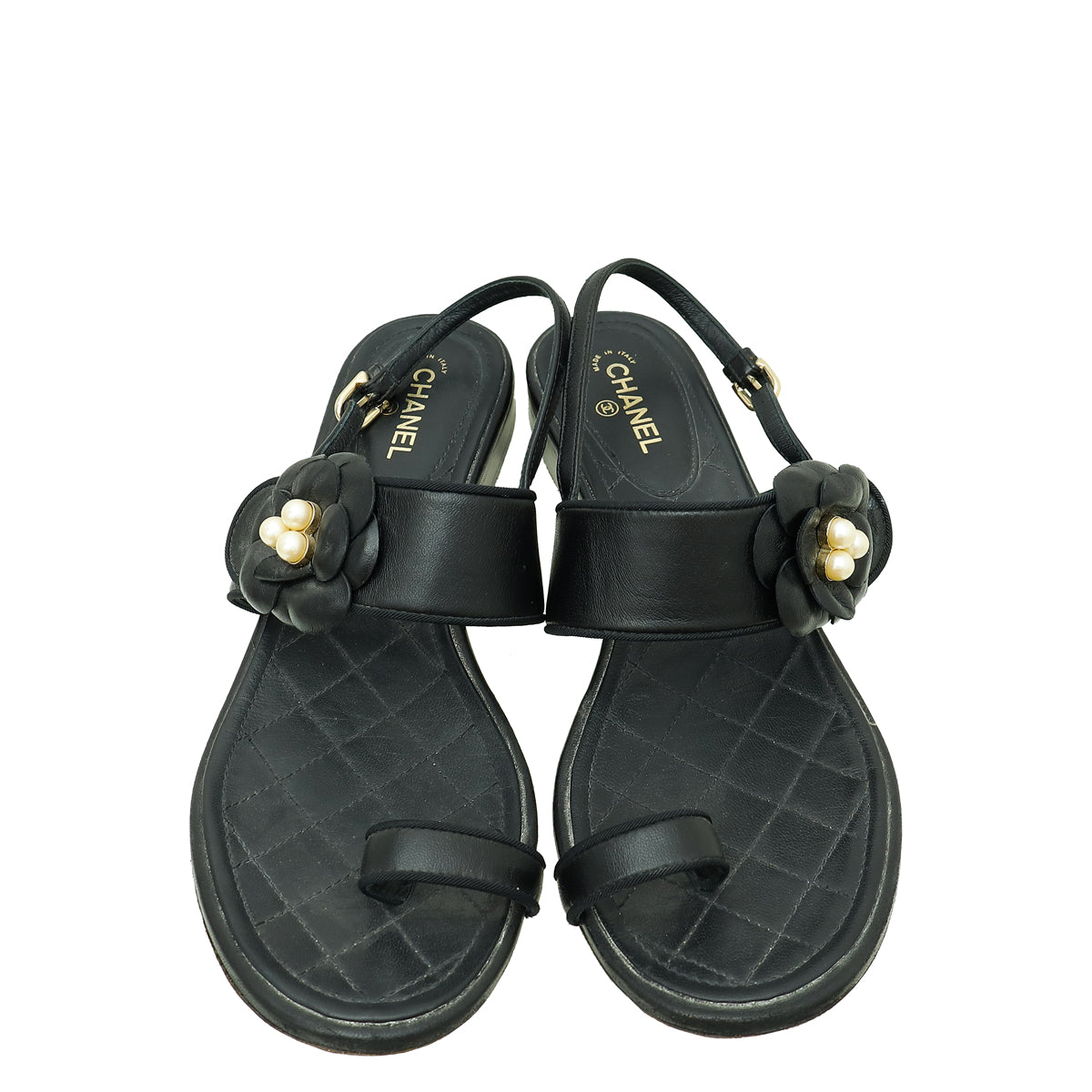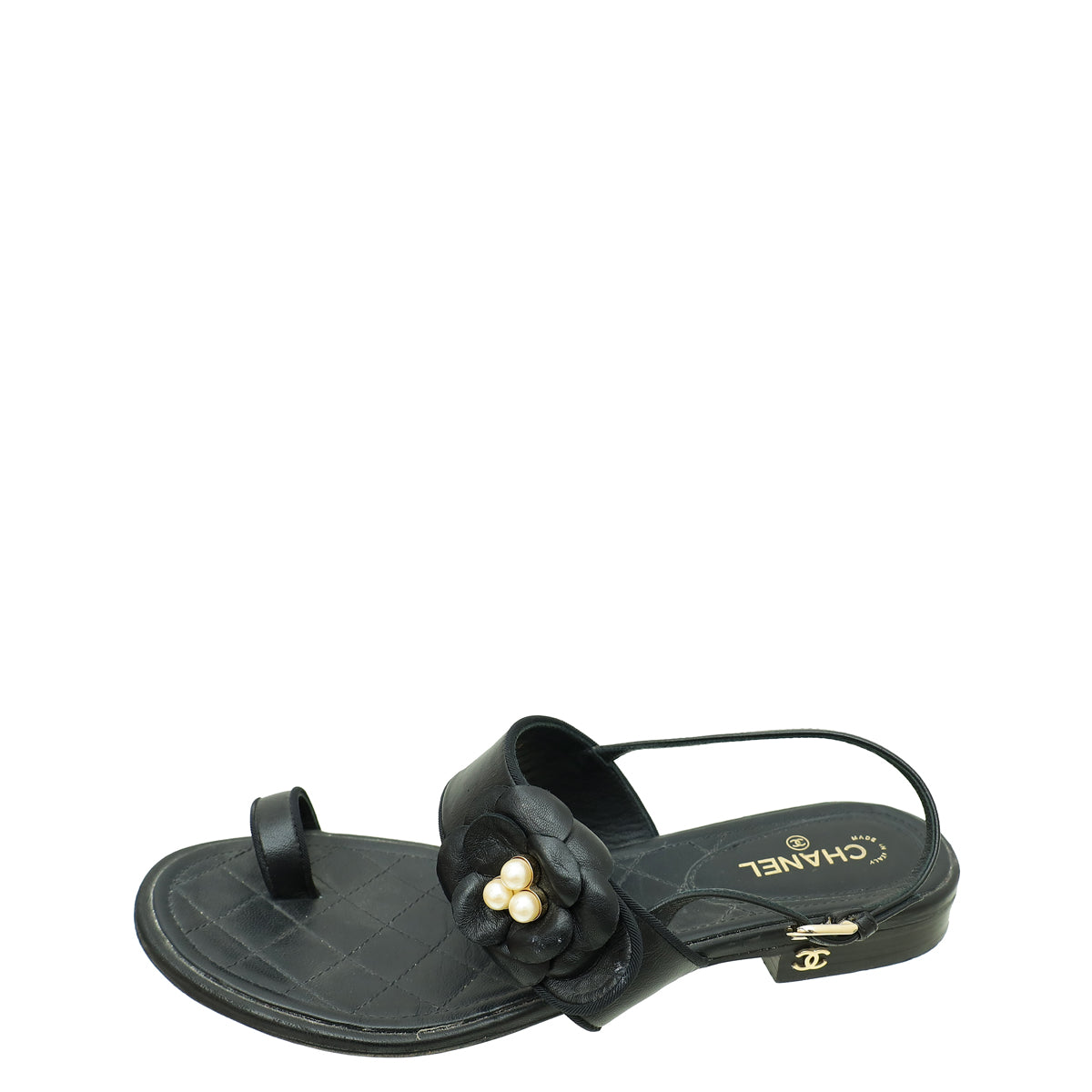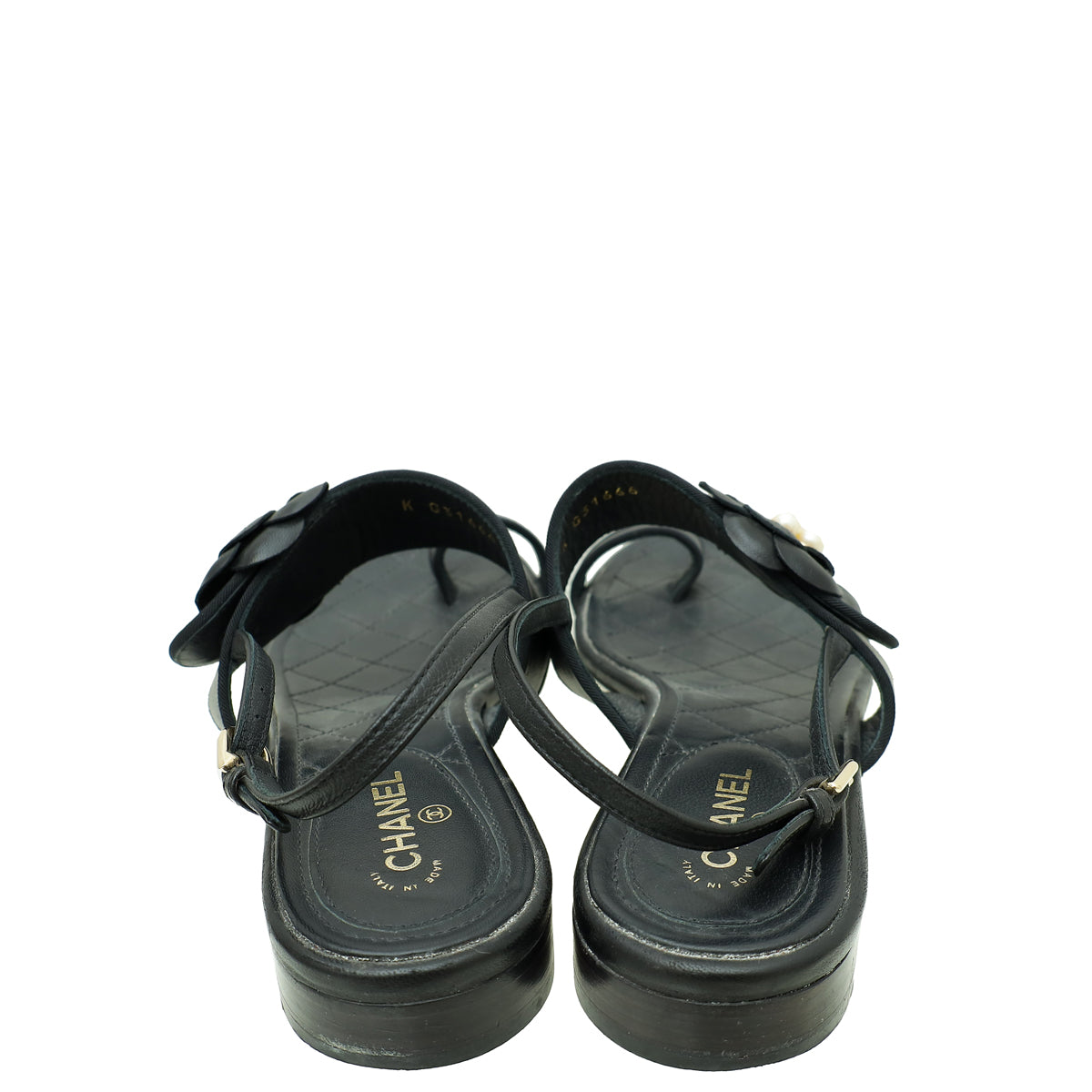 Chanel Black CC Pearl Camellia Flower Flat Sandal 37.5