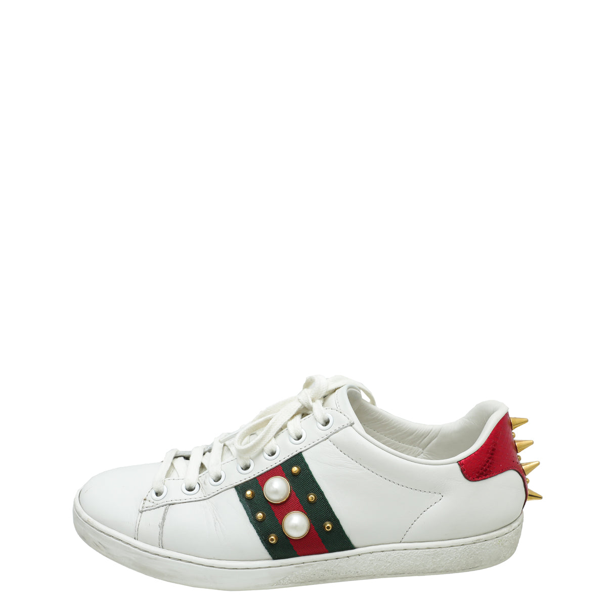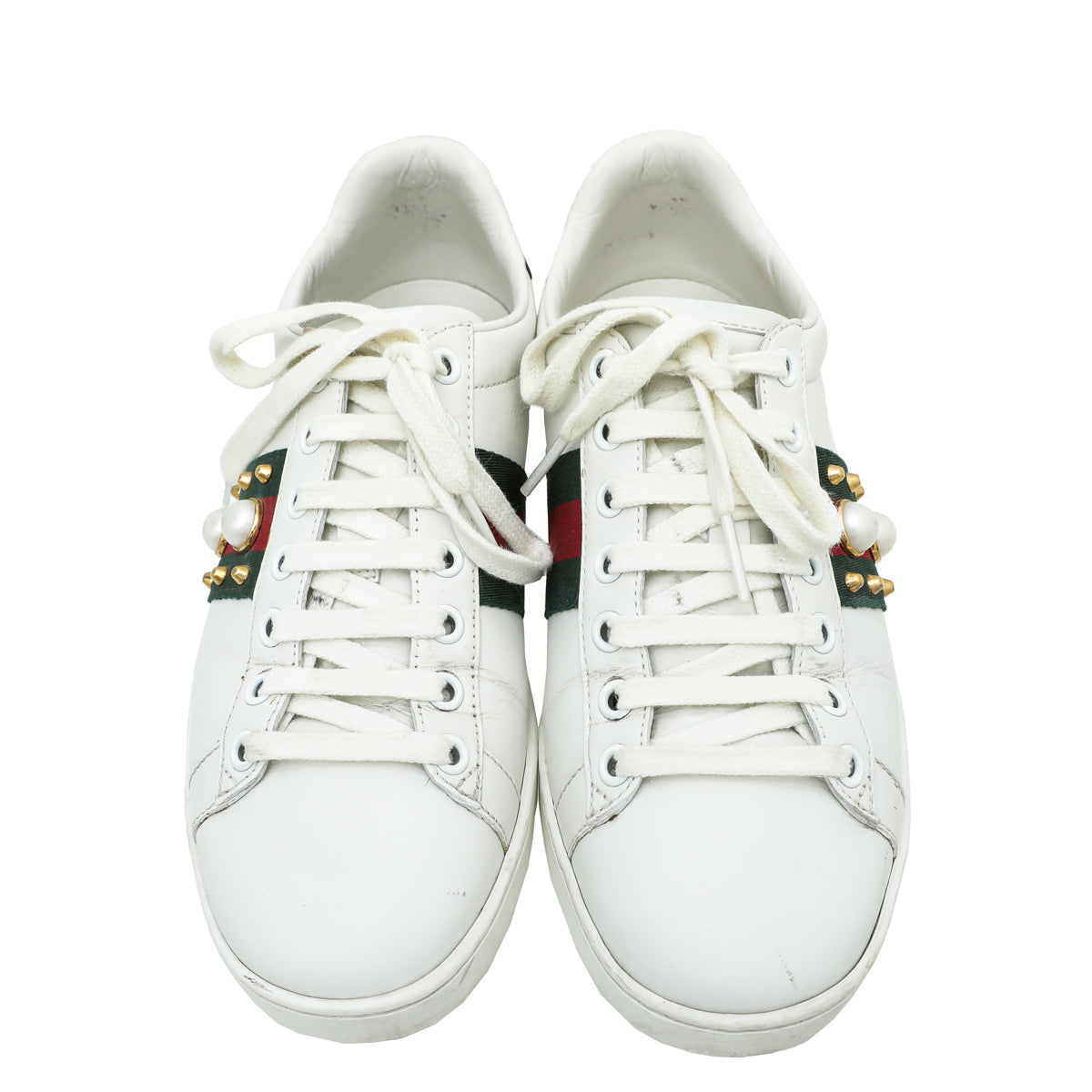 Gucci White Ace Web Pearl Stud Sneaker 36-Gucci-THE CLOSET