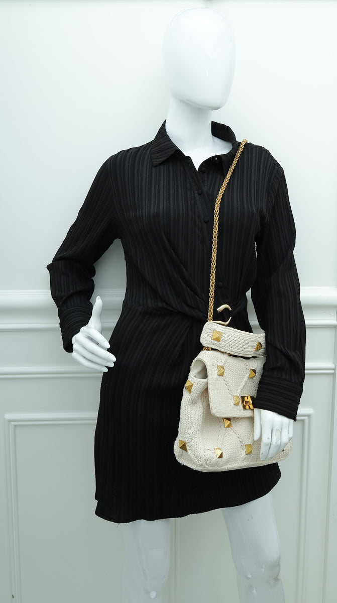 Valentino Ecru Roman Stud Knitted Shoulder Bag Large