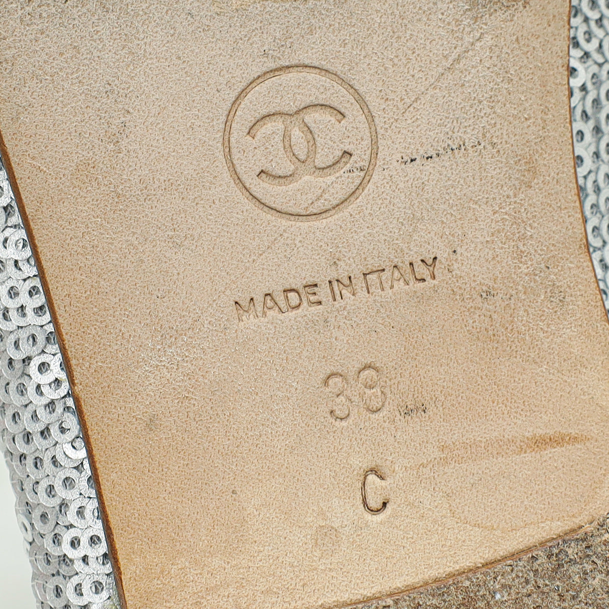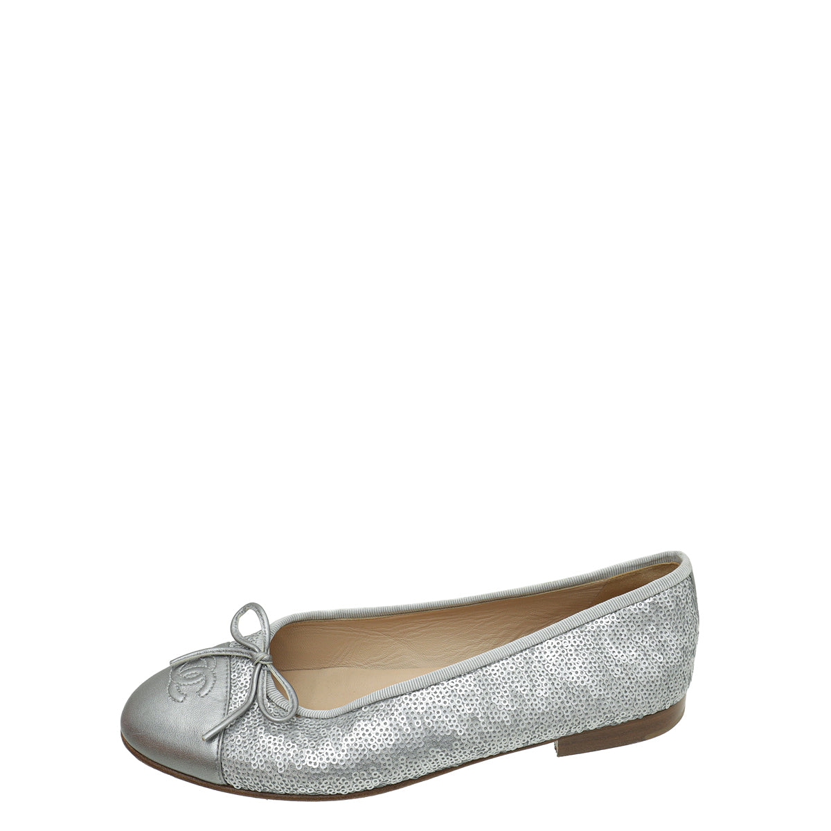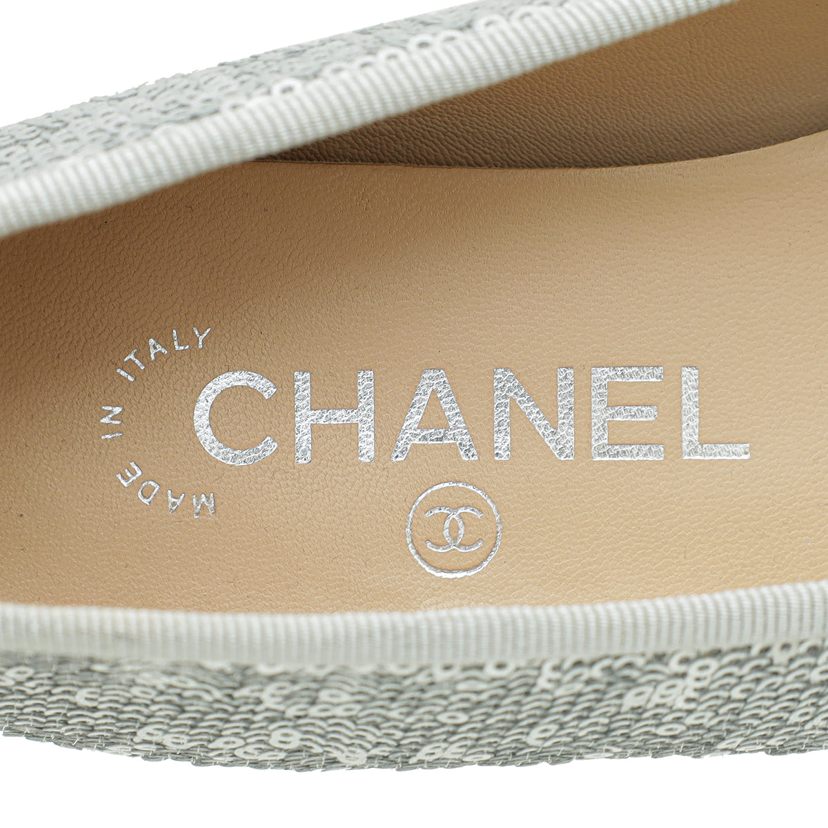 Chanel Metallic Silver CC Cap Toe Sequins Ballerina Flat 38
