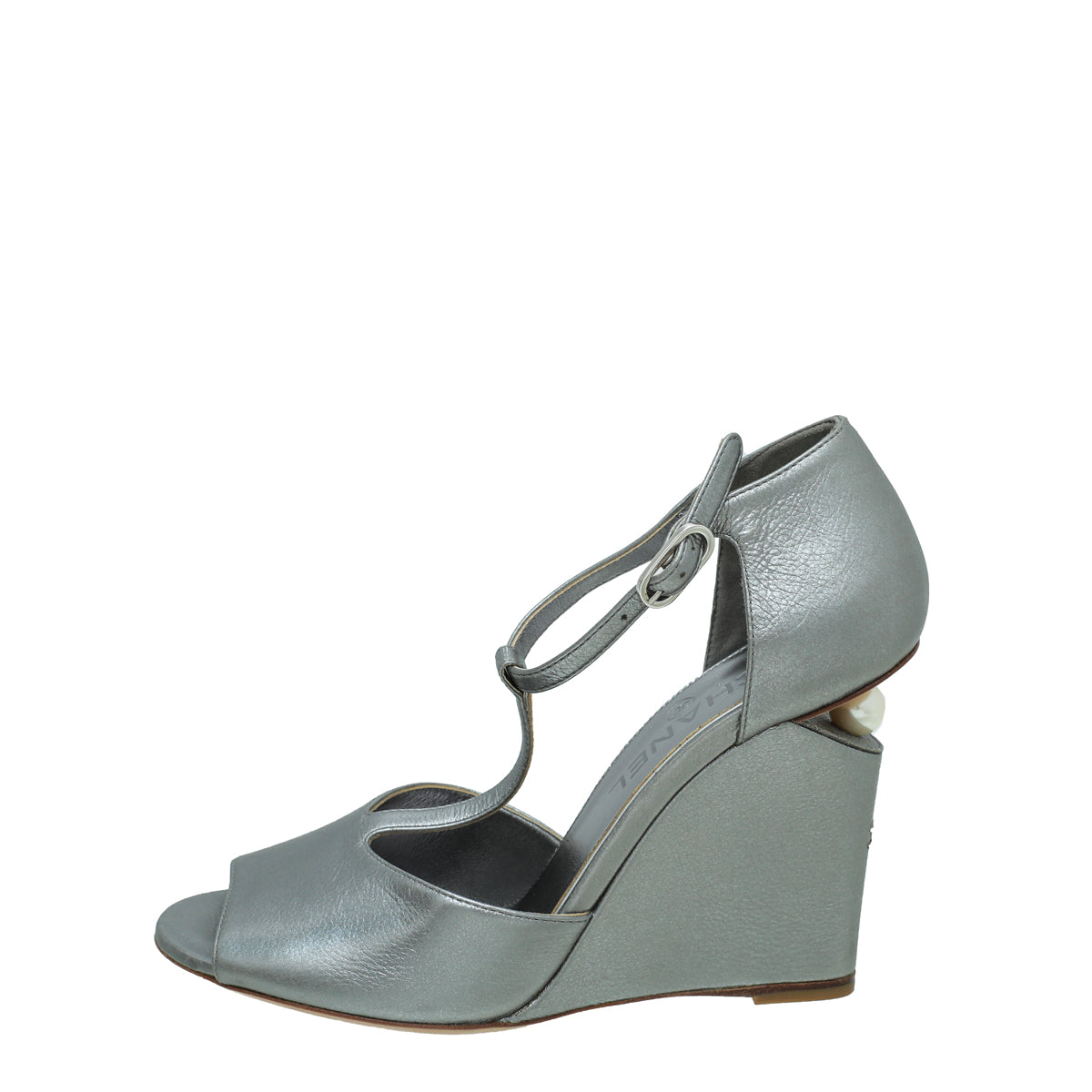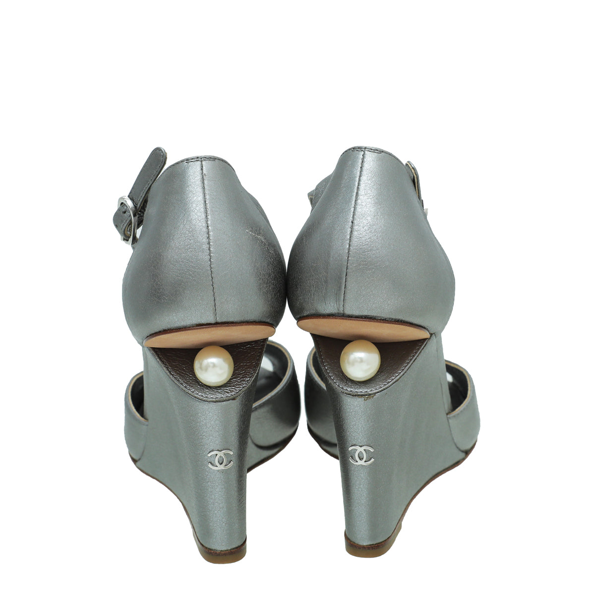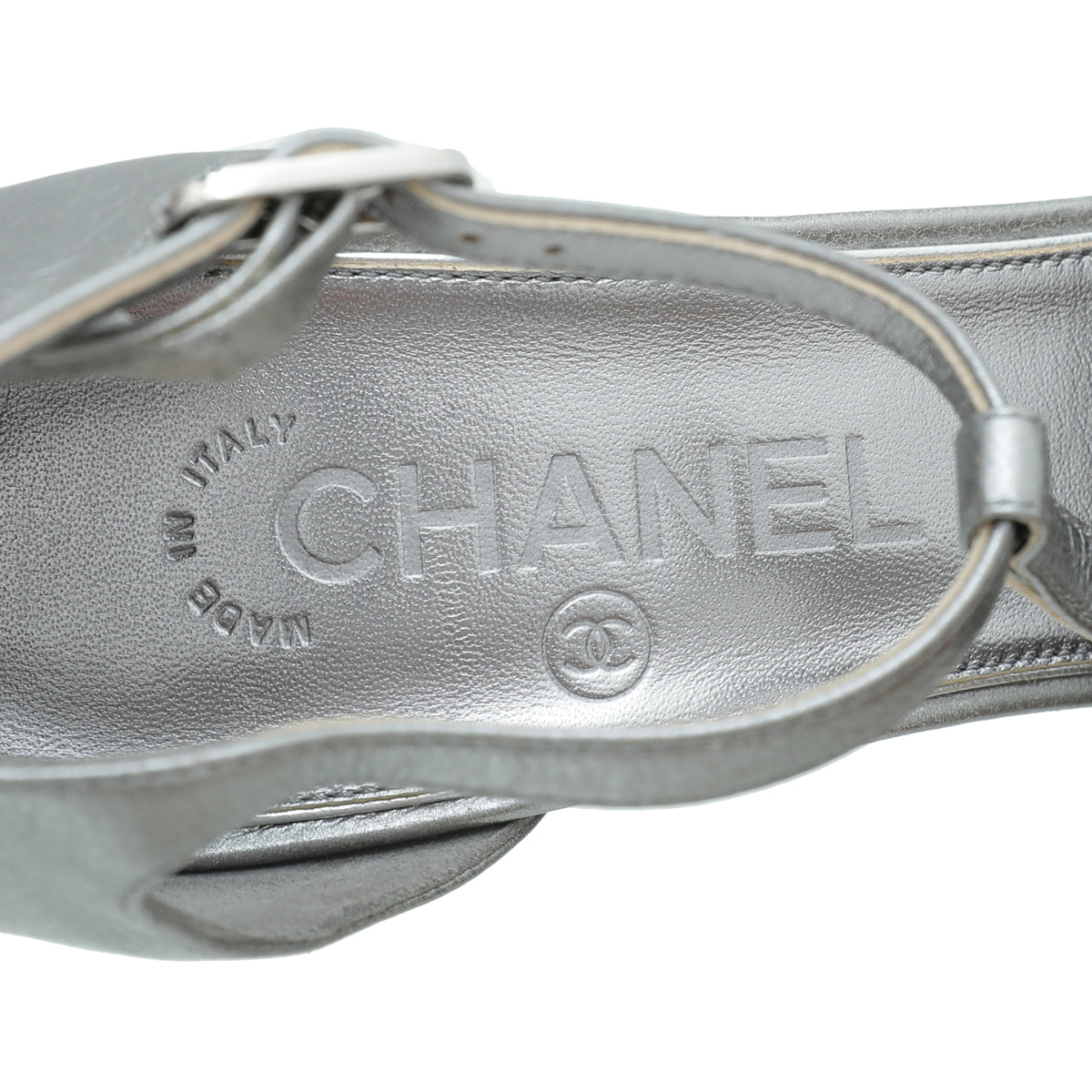 Chanel Metallic Silver T Strap CC Pearl Wedge Sandals 38