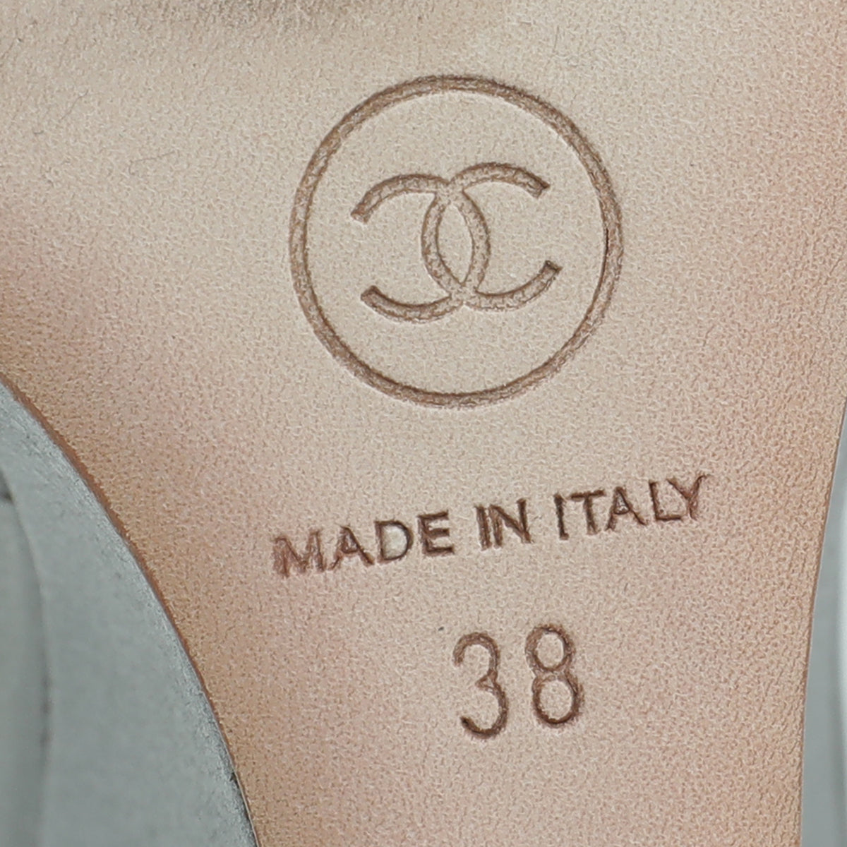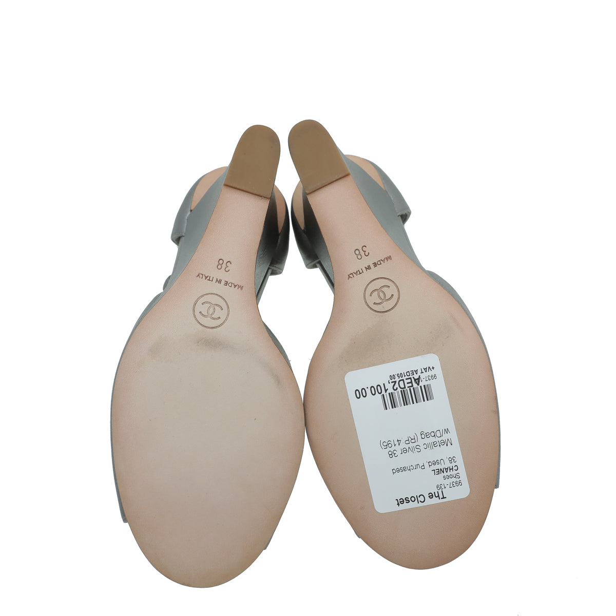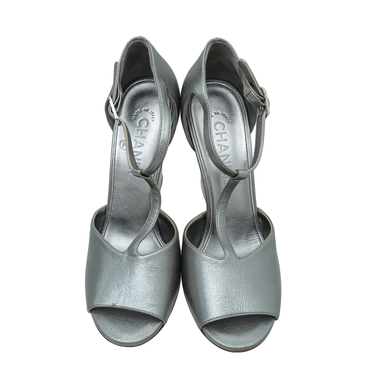 Chanel Metallic Silver T Strap CC Pearl Wedge Sandals 38