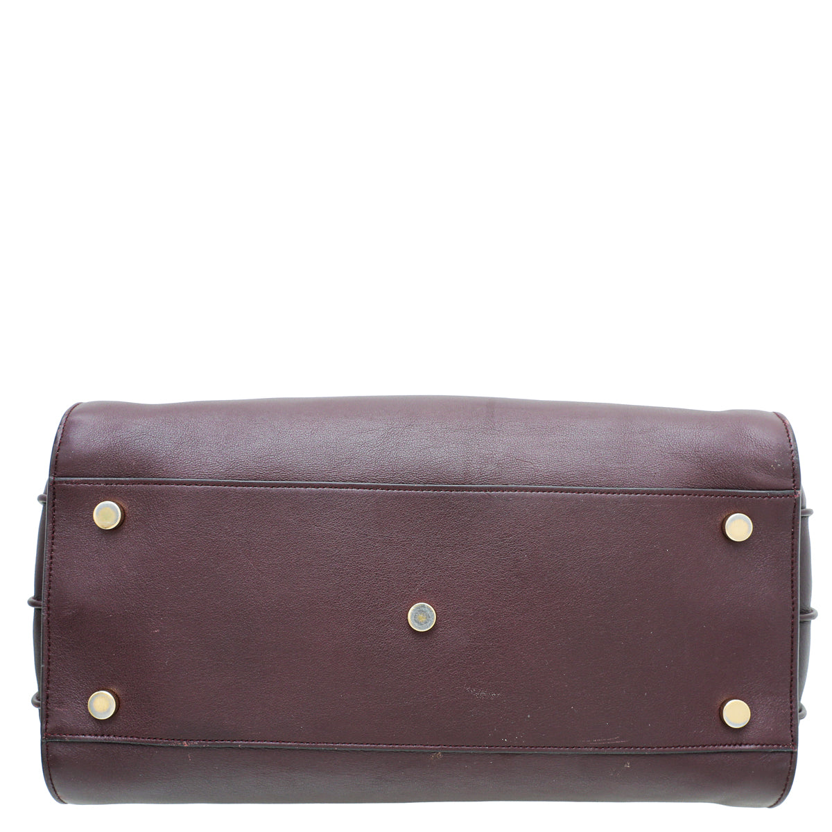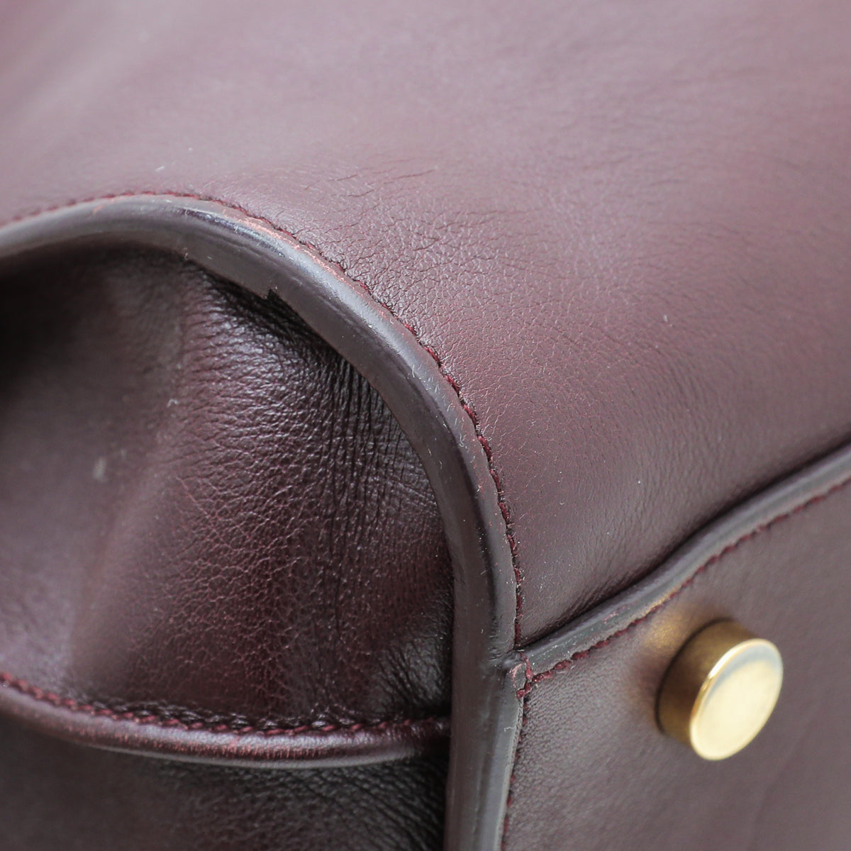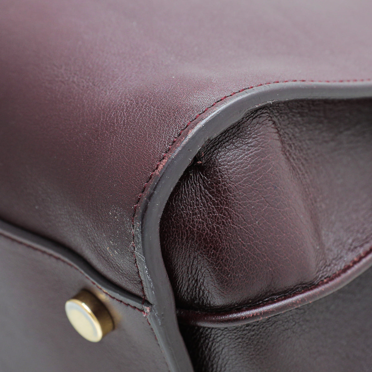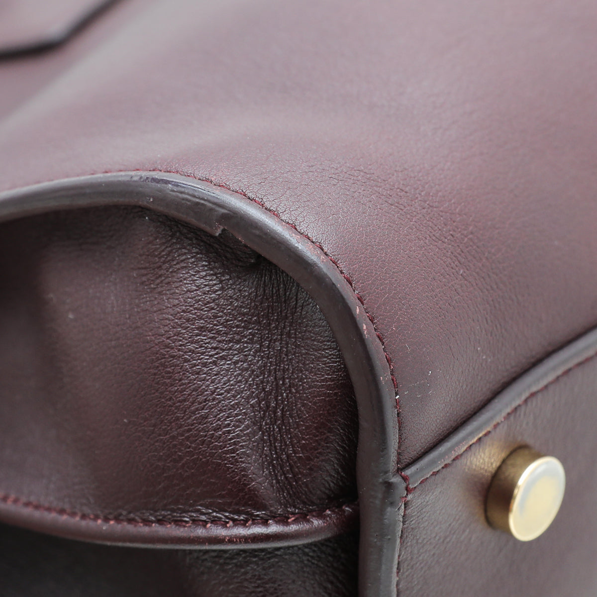 Exterior: good condition, with scratches on the hardware, corners, stain on leather and showing normal signs of use.