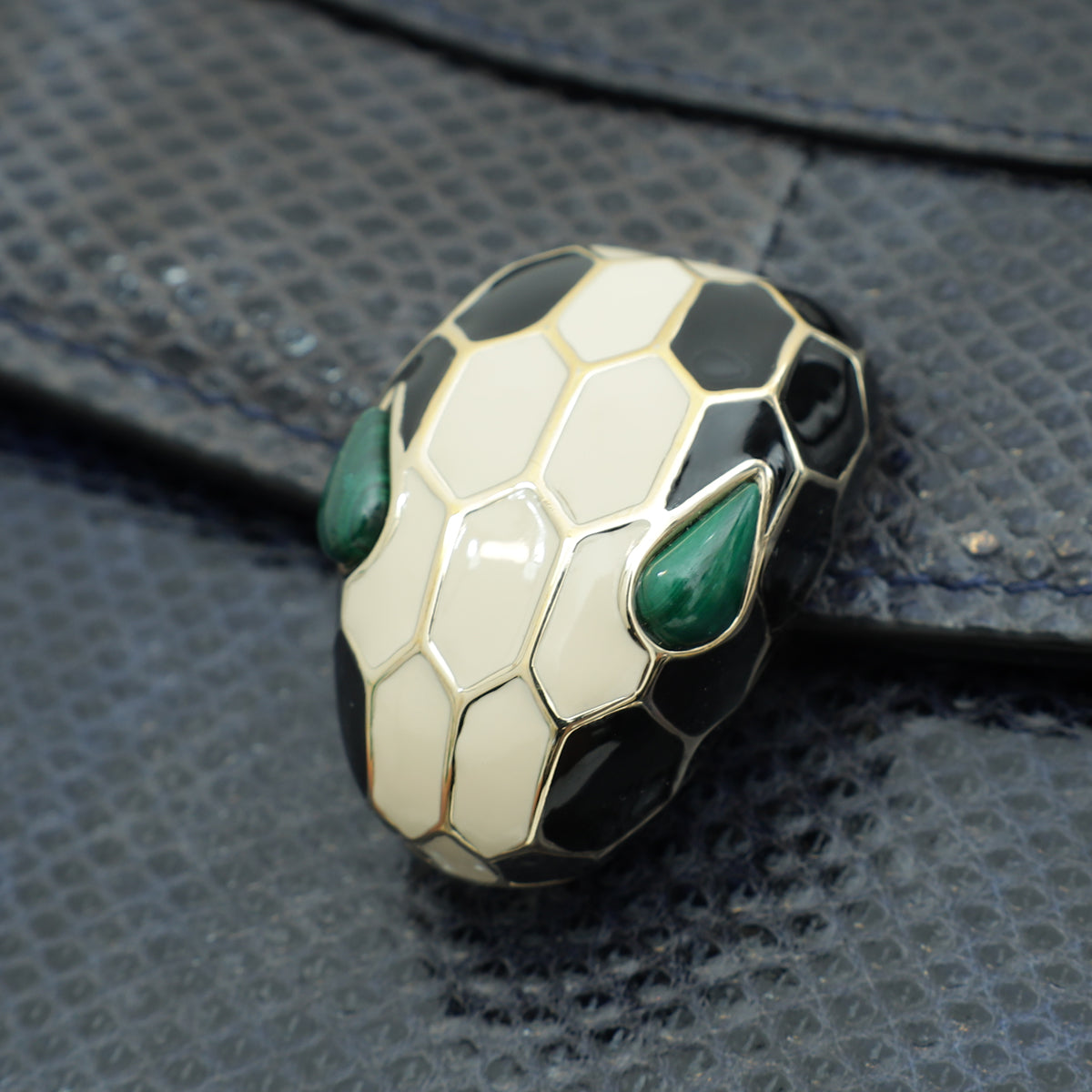 - Material: Navy Blue Karung Snakeskin Leather with Black/White Enamel with Eyes in Green Malachite