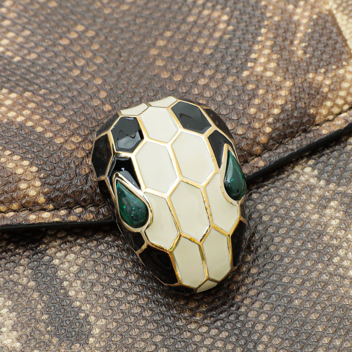 - Material: Brown Karung Snakeskin Leather with Black and White Enamel with Eyes in Green Malachite