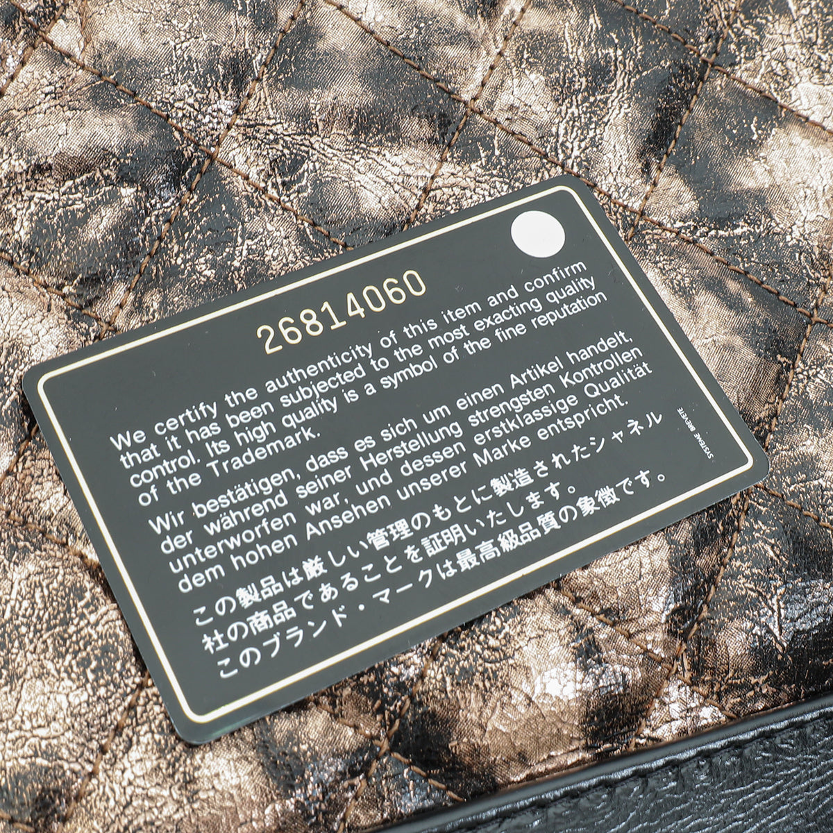 - Material: Black/Bronze Quilted Calfskin Leather