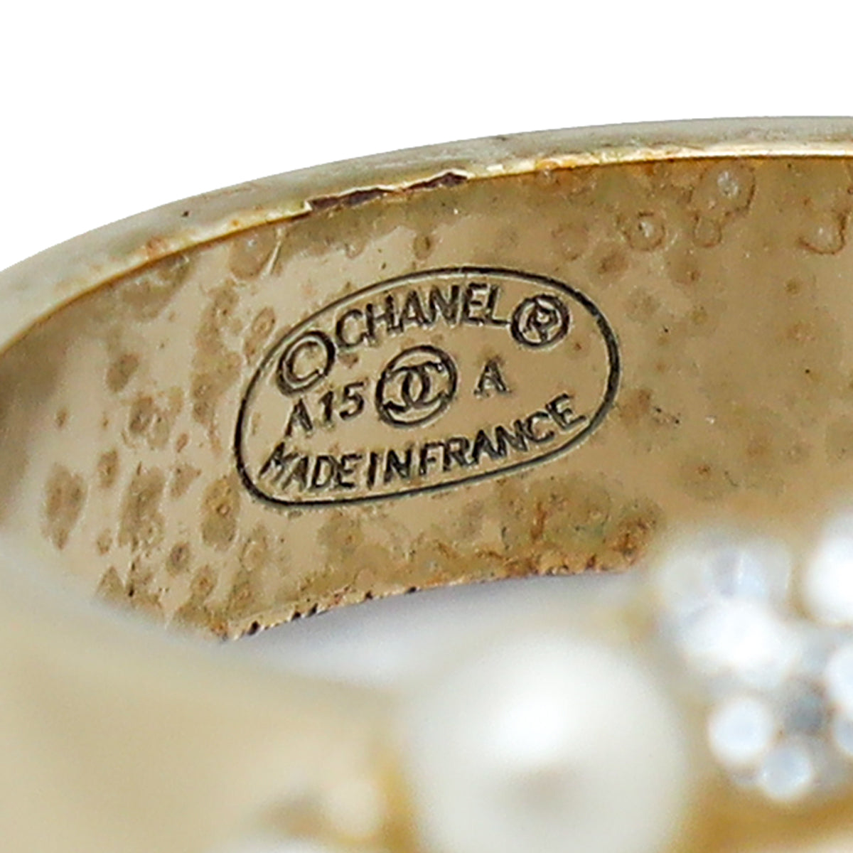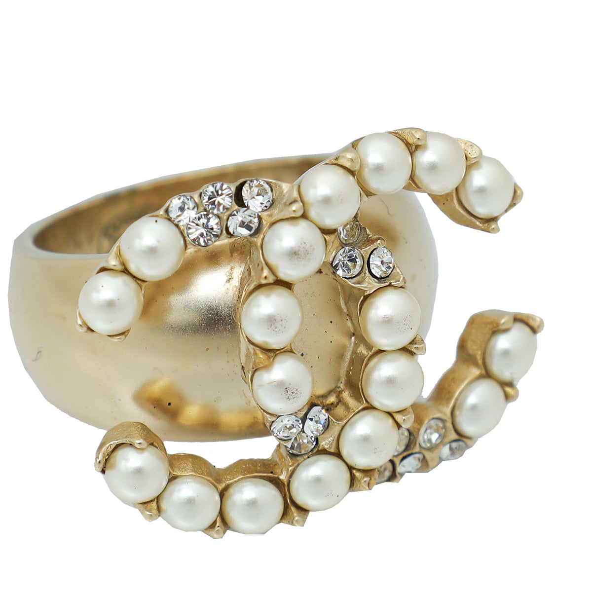 Chanel Ivory Faux Pearl Crystal CC Ring 52