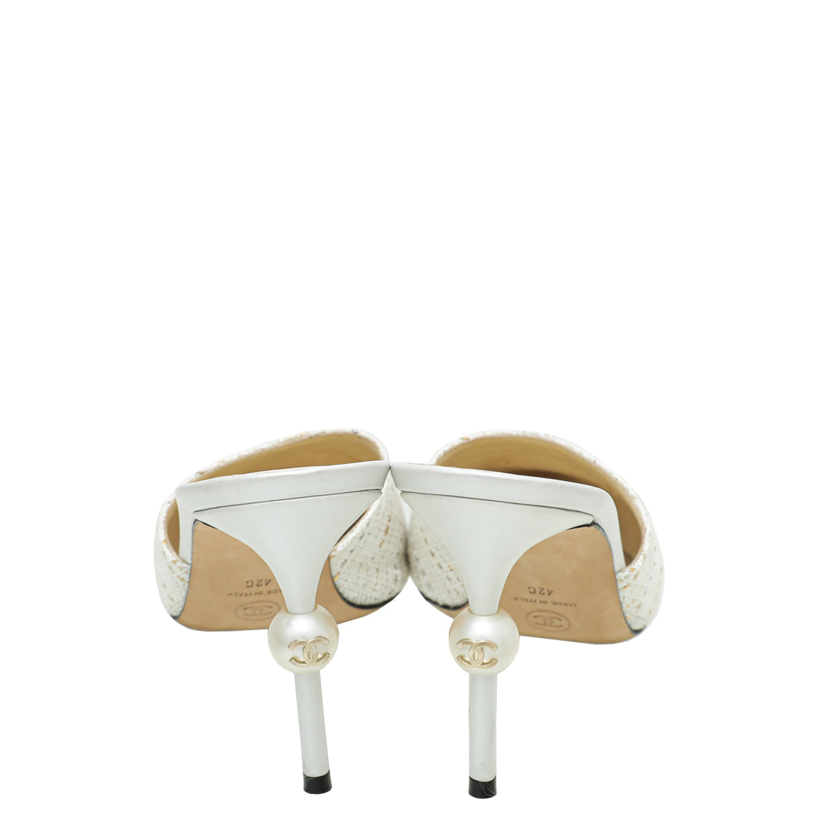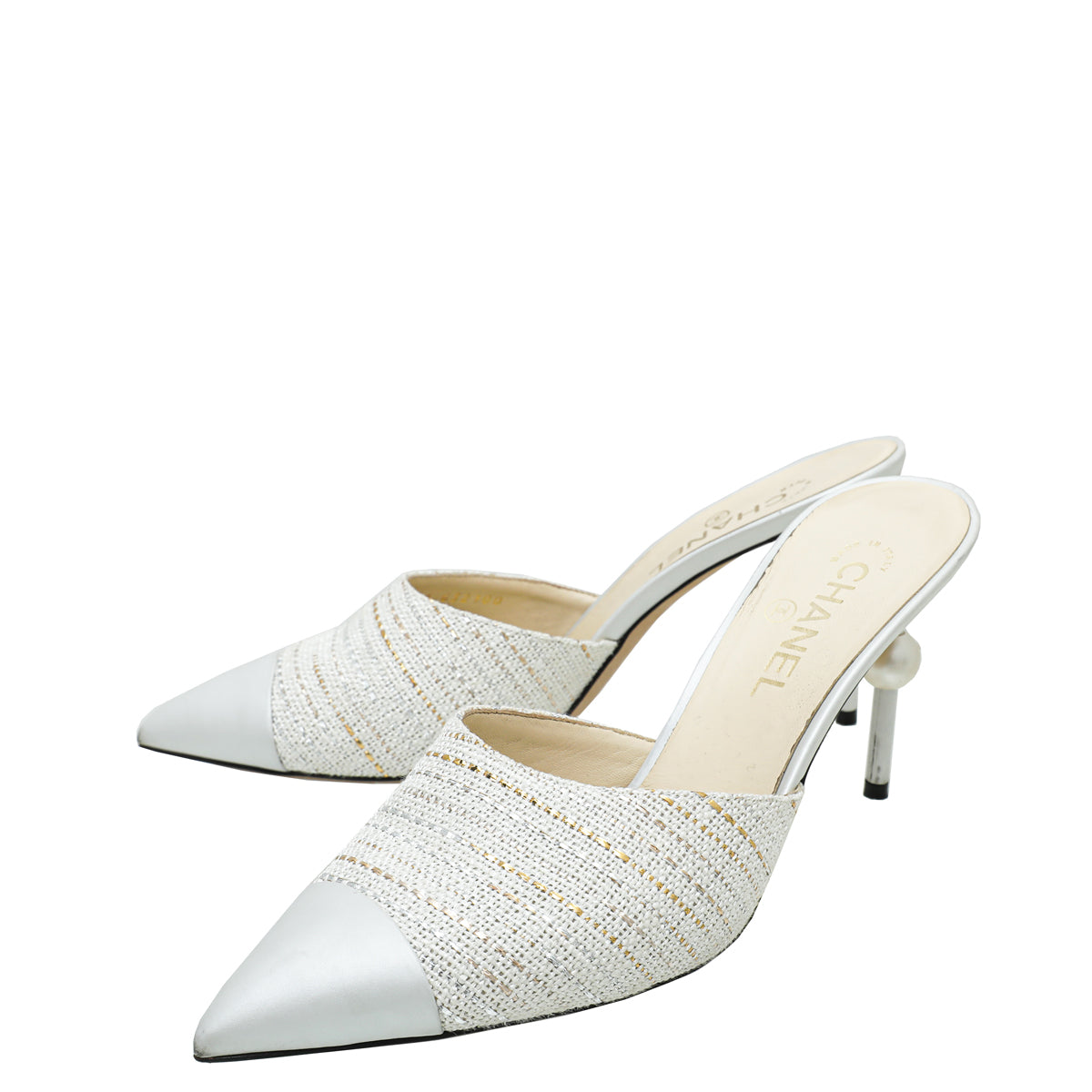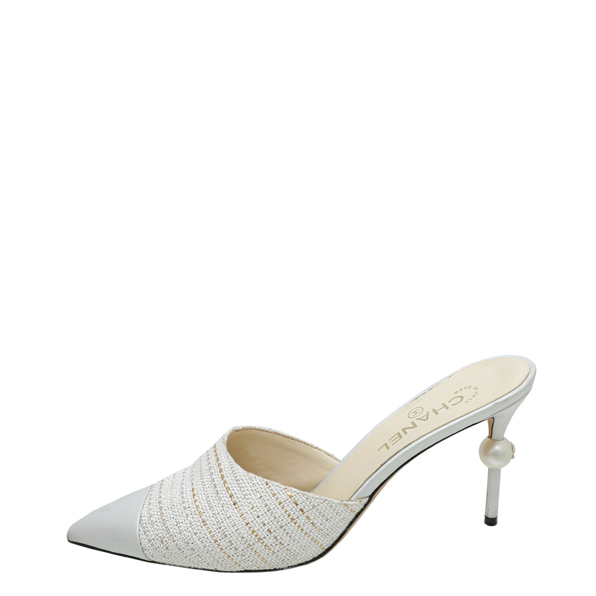 Chanel Light Silver CC Tweed Cap Toe Pearl Heel Mules 42