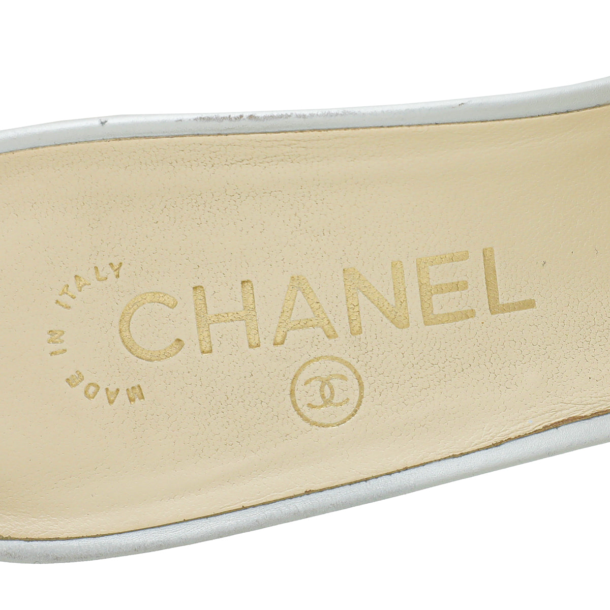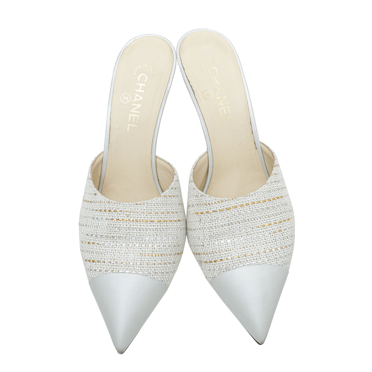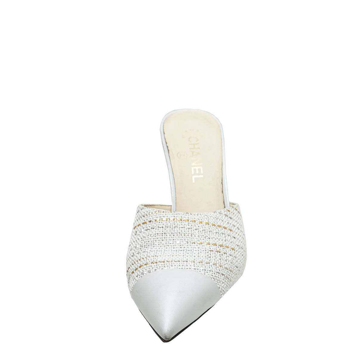 Chanel Light Silver CC Tweed Cap Toe Pearl Heel Mules 42