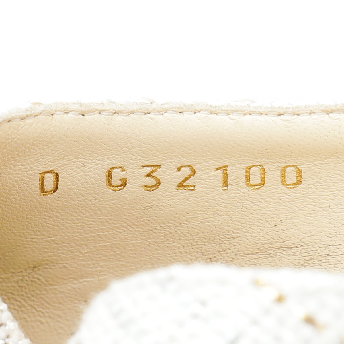 Material: Light Silver Tweed with Leather Trim Cap Toes and Faux Pearl on Heels