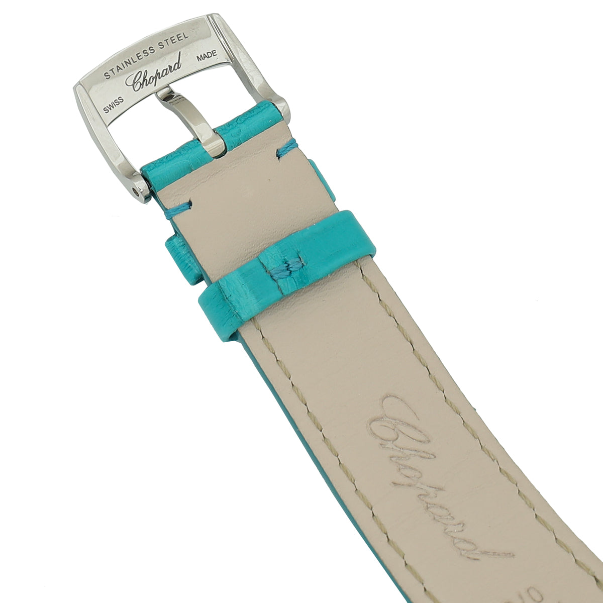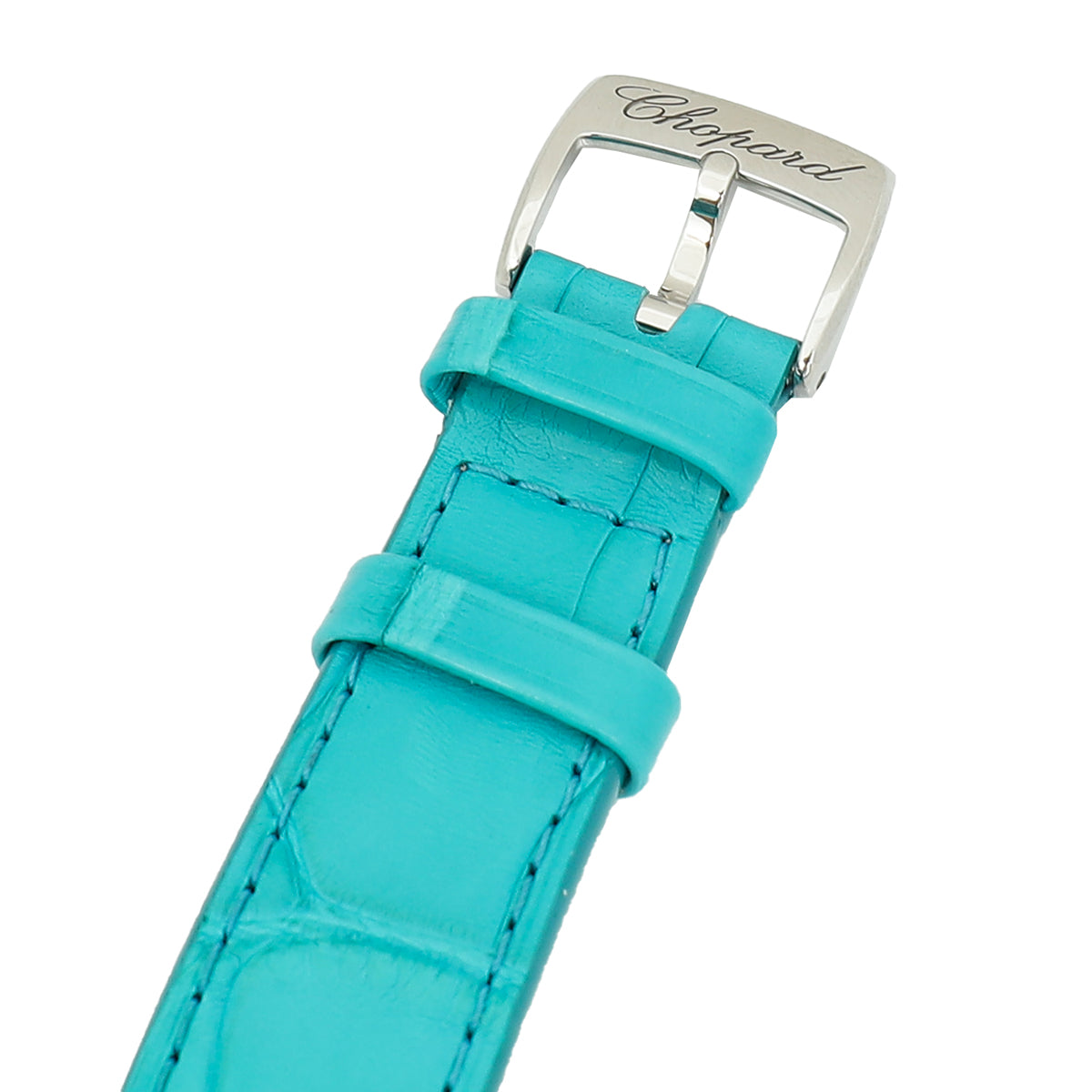 Material: Stainless Steel with Rose Gold Case, Turquoise MOP Dial, Gold and 5 Floating Diamonds, Topaz Cabochon Crown and Turquoise Alligator Strap