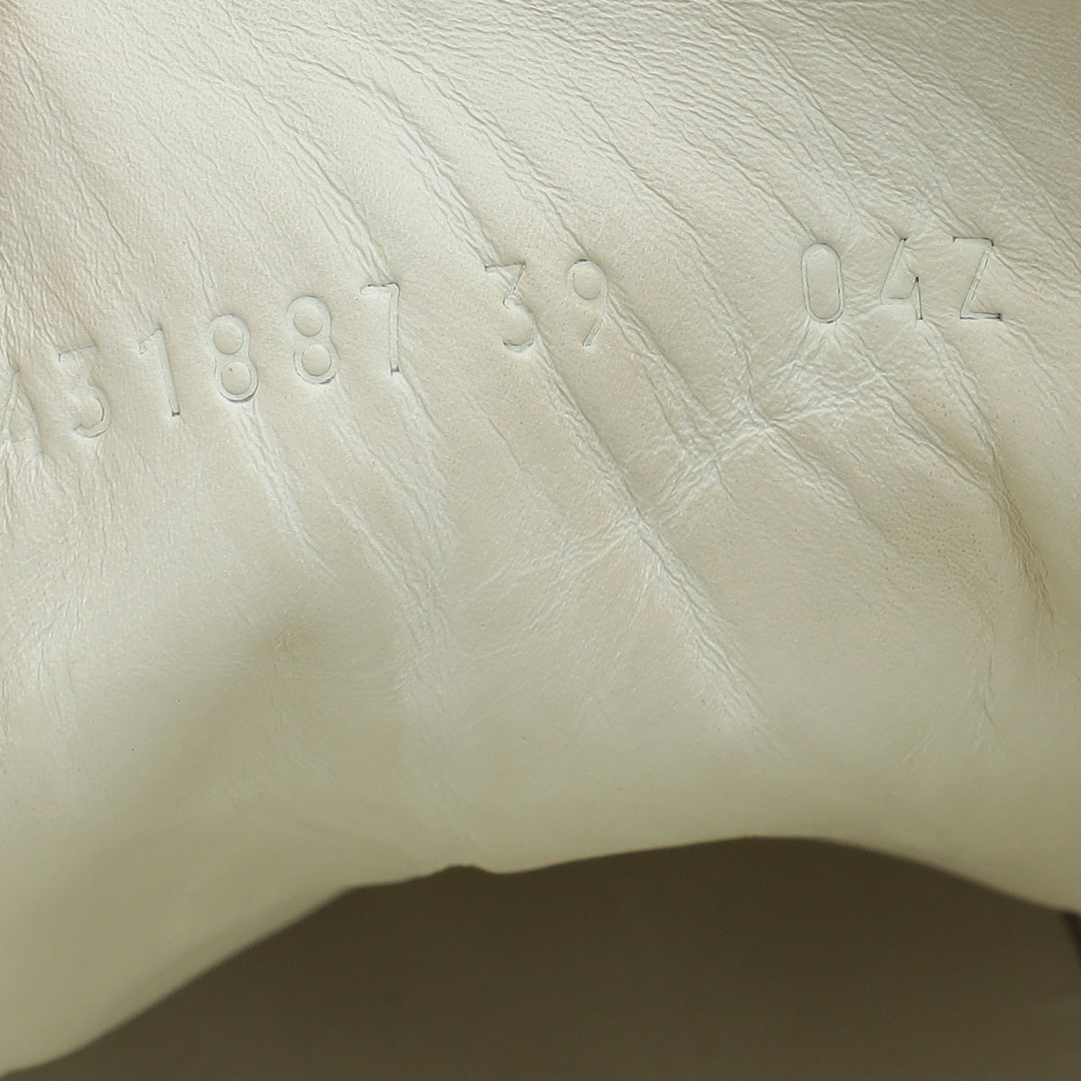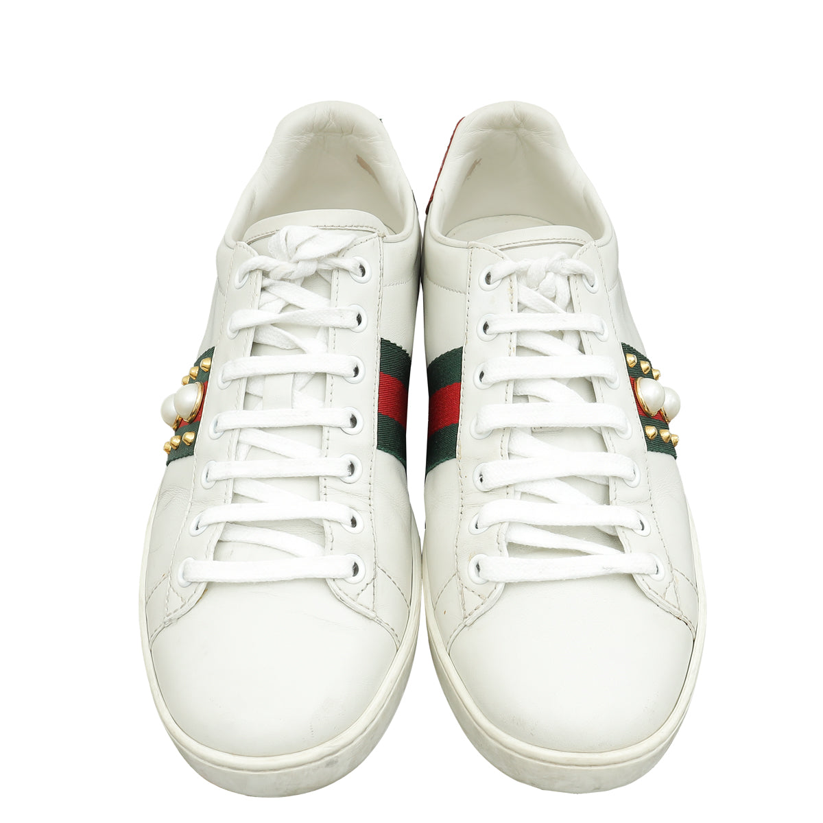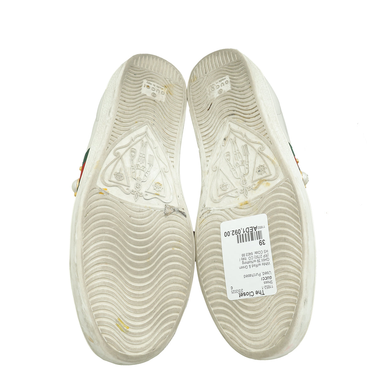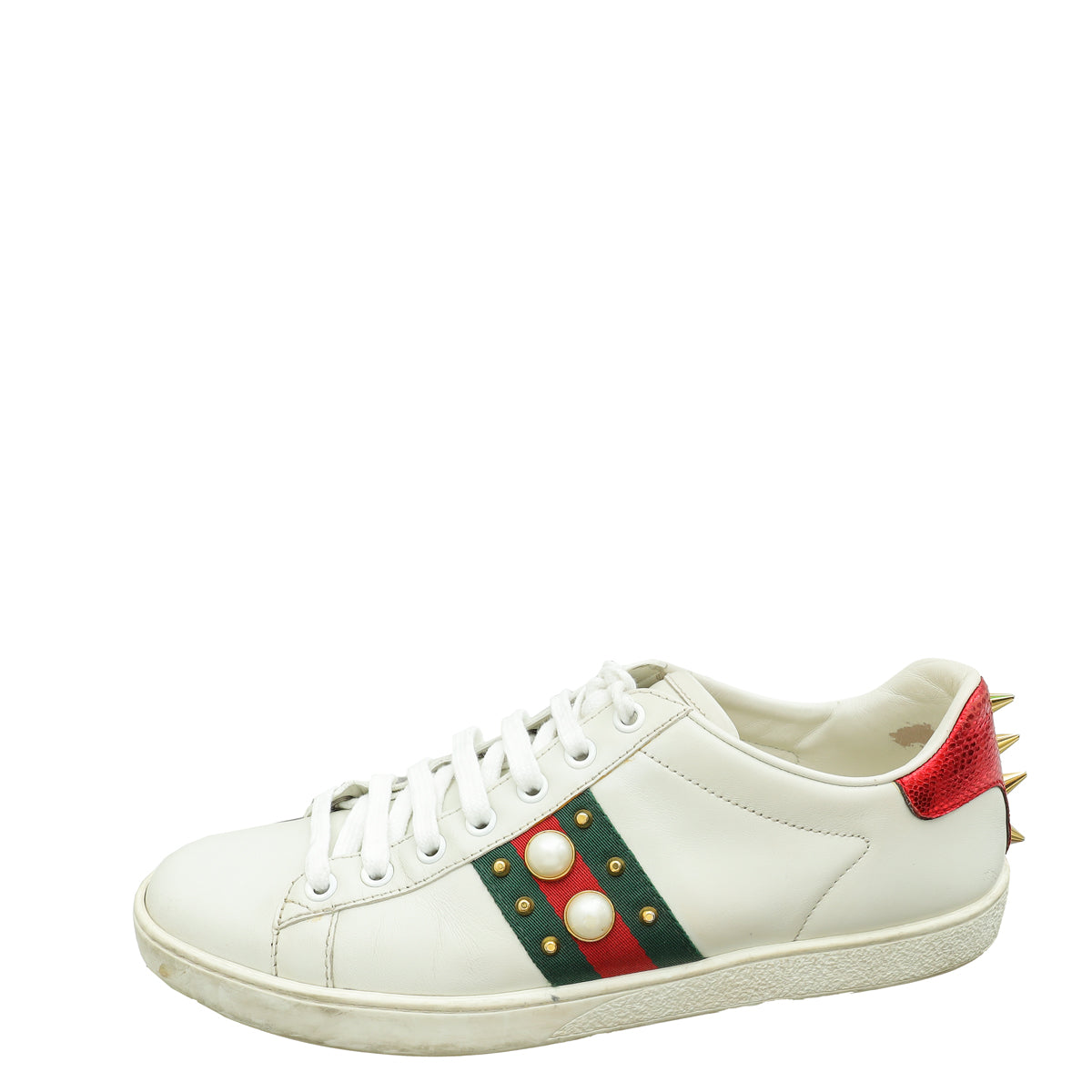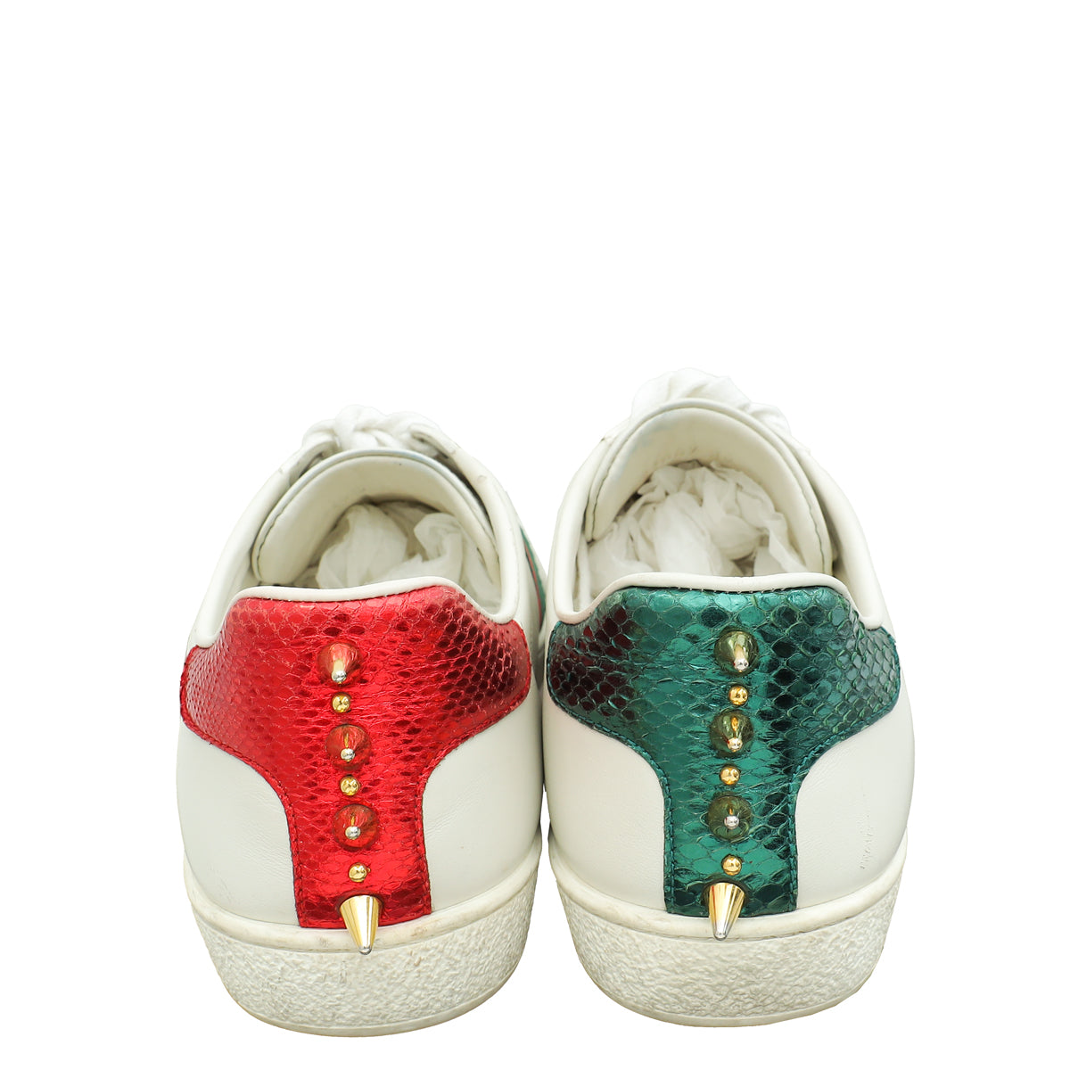 - Material: White Leather and Green/Red Web with Pearl and Studs and Red Snakeskin Leather Detail on The Heel of One Shoe and Green on The Other