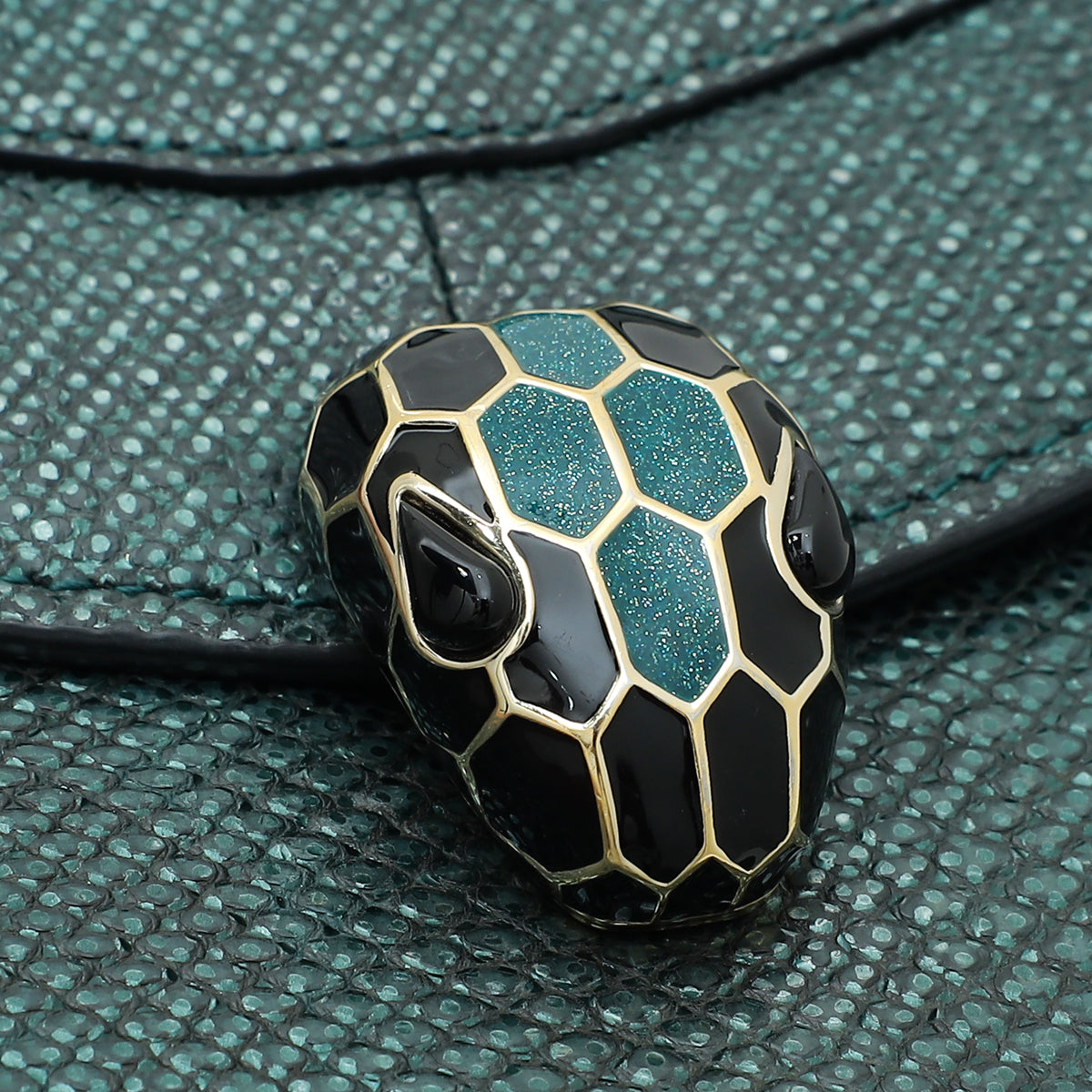 - Material: Green Karung Skin Leather with Black and White Enamel with Black Onyx Eyes