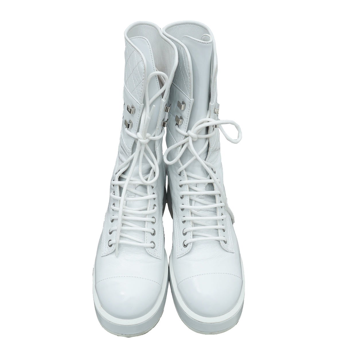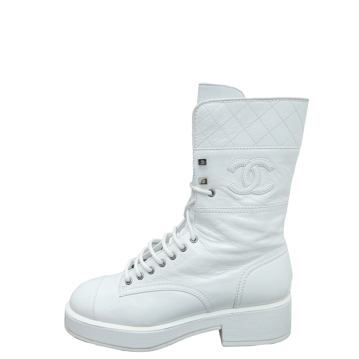 Chanel White Quilted CC Lace Up Combat Boots 38.5-Chanel-THE CLOSET