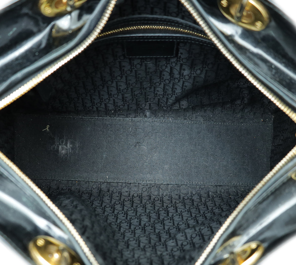 Exterior: good condition, with scratches on the hardware, corners, white spots on leather at the bottom and showing normal signs of use.